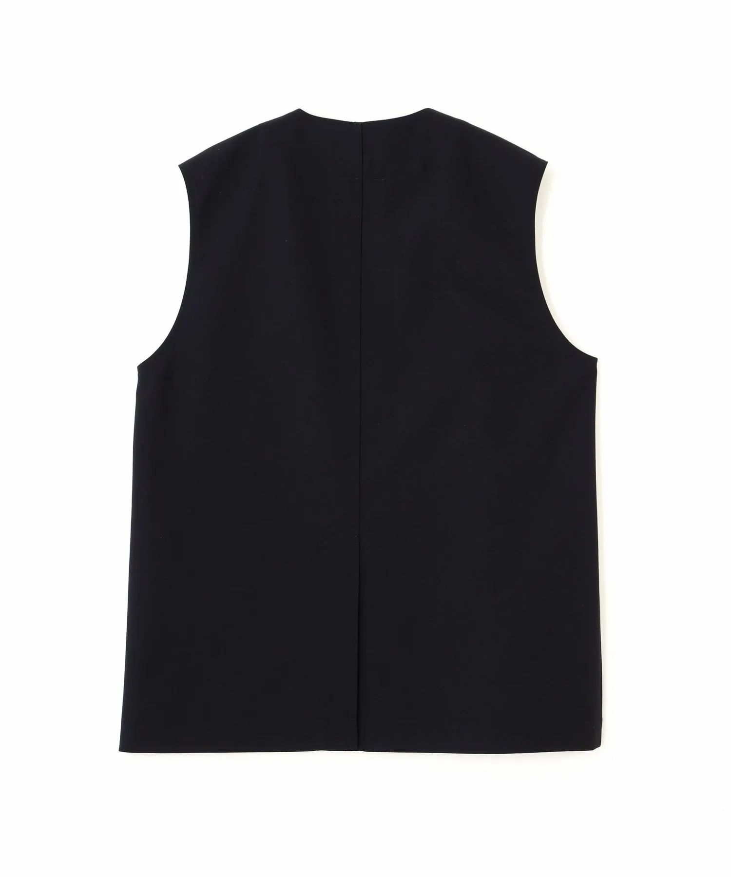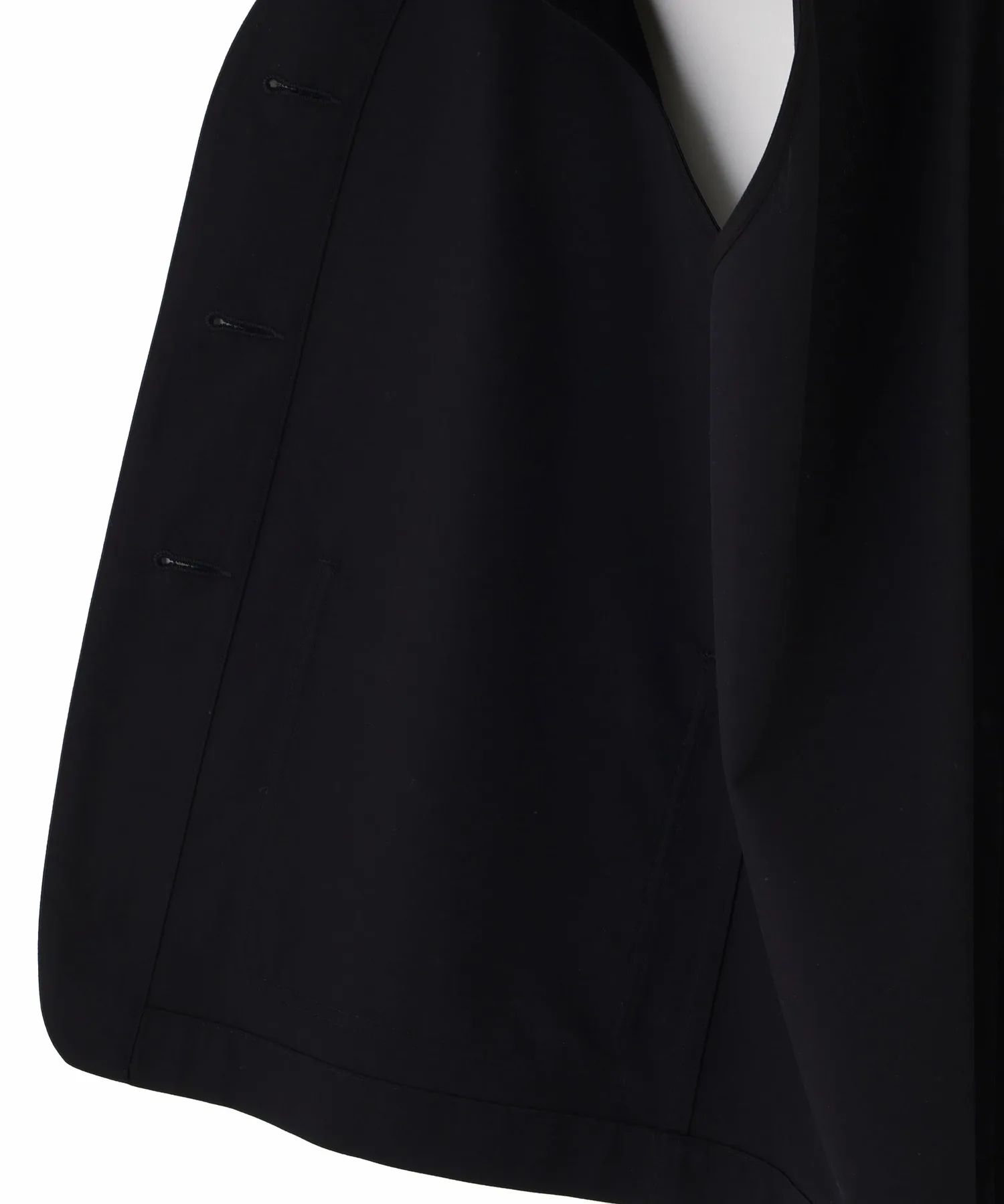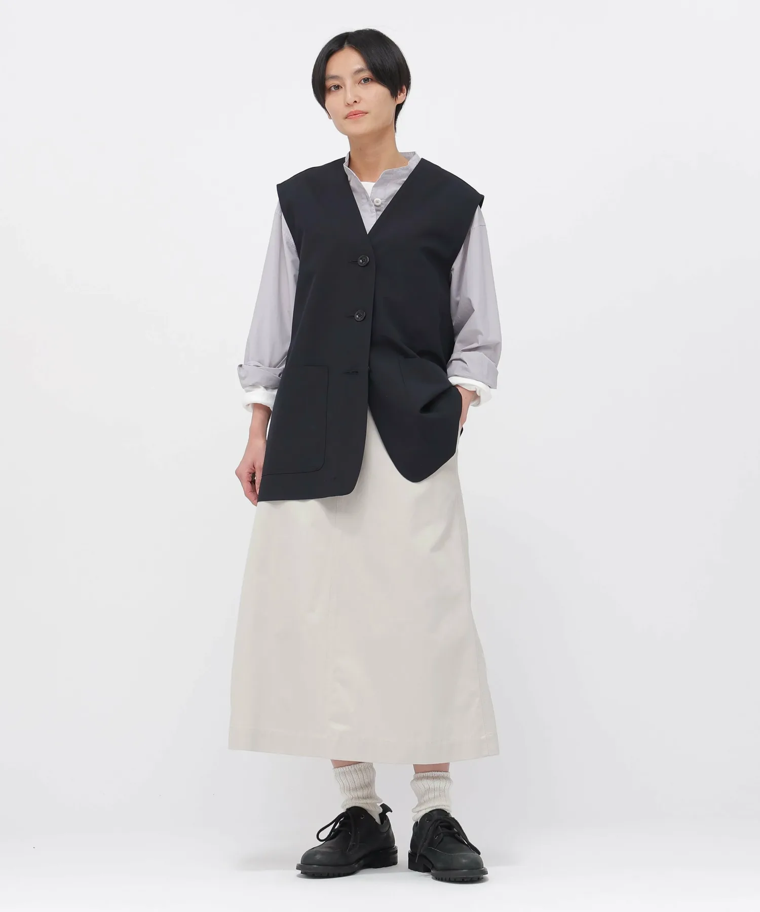 Дизайн жилета, напоминающего куртку, имеет удлиненный крой, благодаря чему он выглядит как мужская куртка, накинутая поверх него. Неглубокий V-образный вырез, большие карманы на поясе и разрезы сзади придают ему простой, но эффектный вид. Мы также рекомендуем сочетать его с брюками из того же материала.