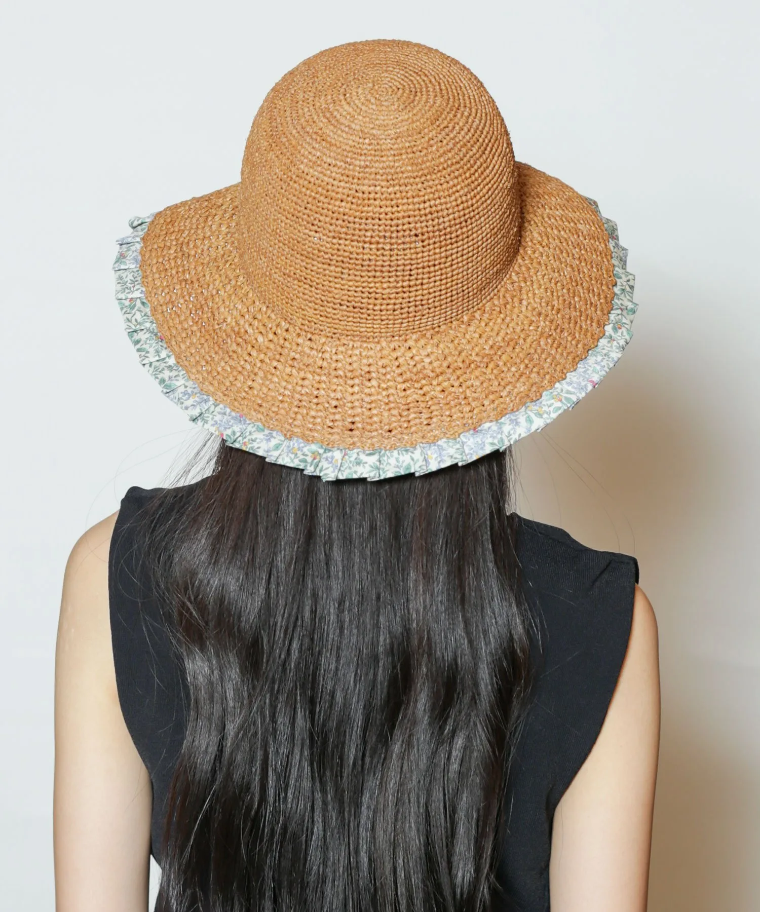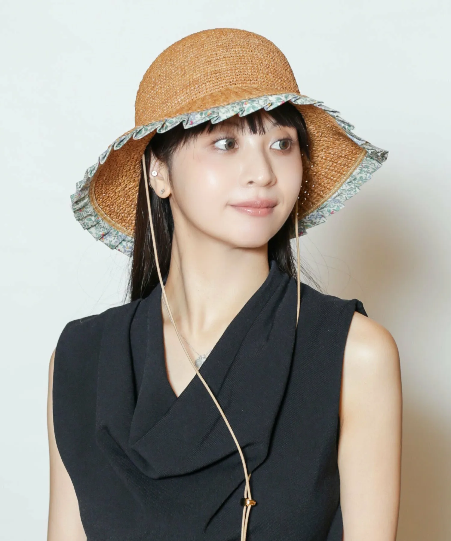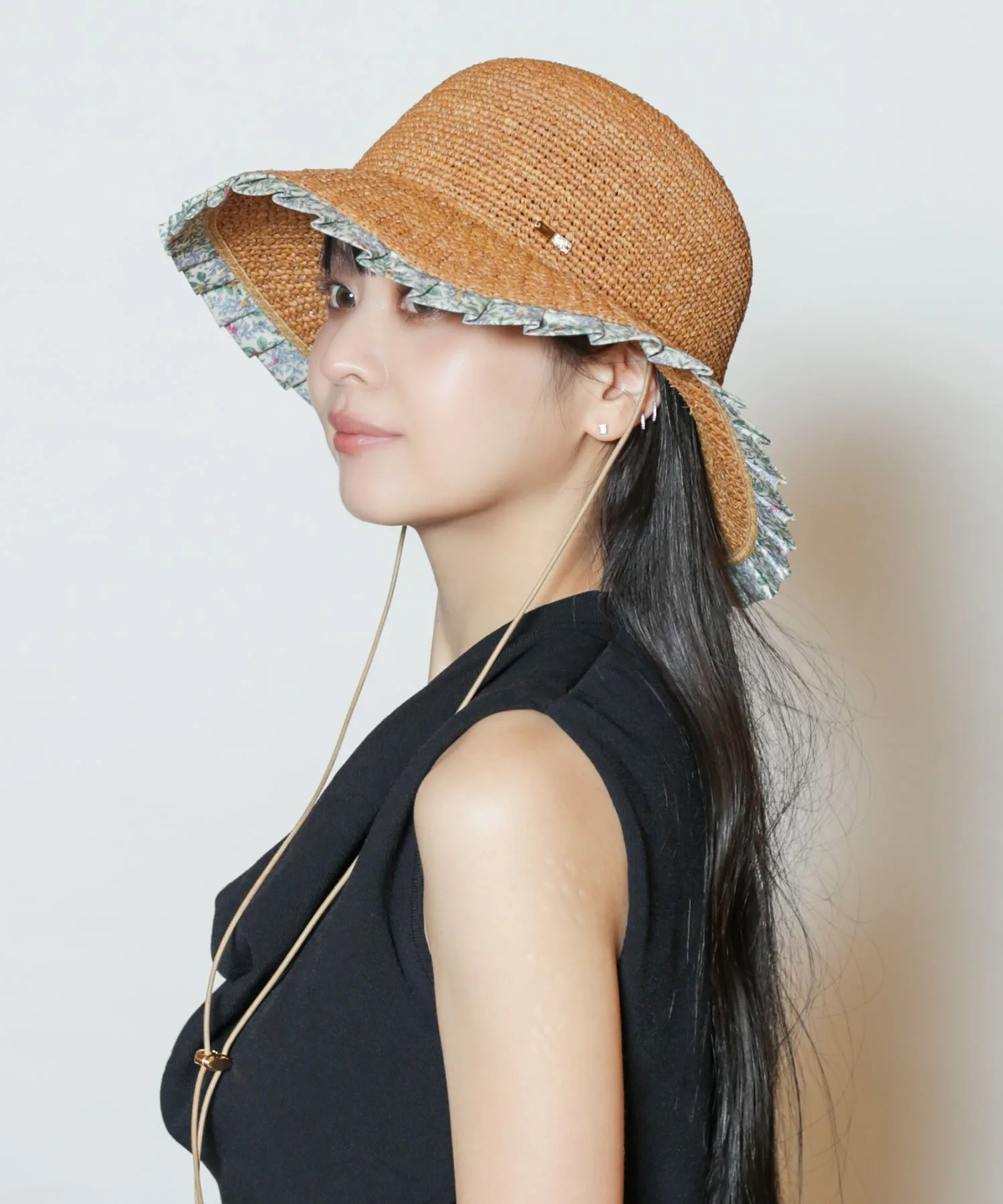 Кончик полей украшен плиссированной тканью с небольшим цветочным узором. Небольшие пластинки по бокам добавляют изысканный акцент.