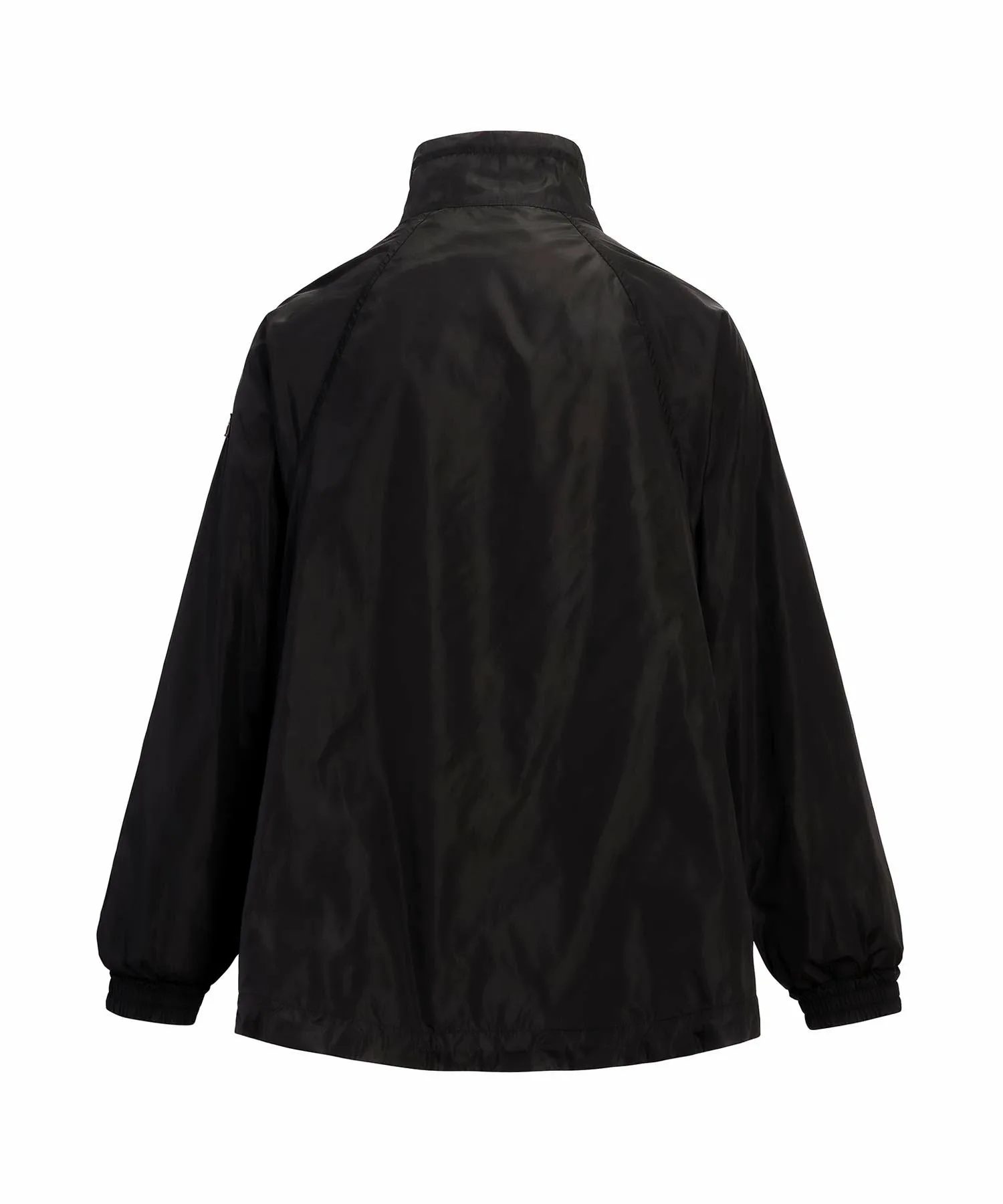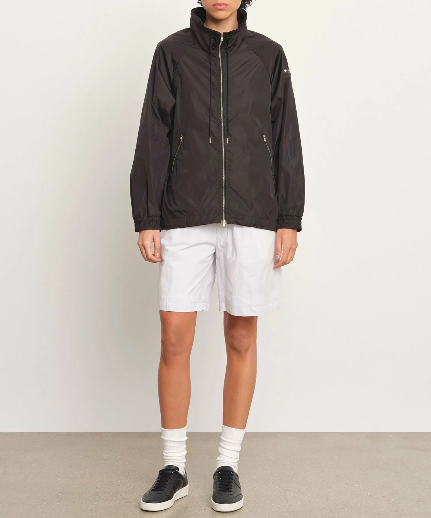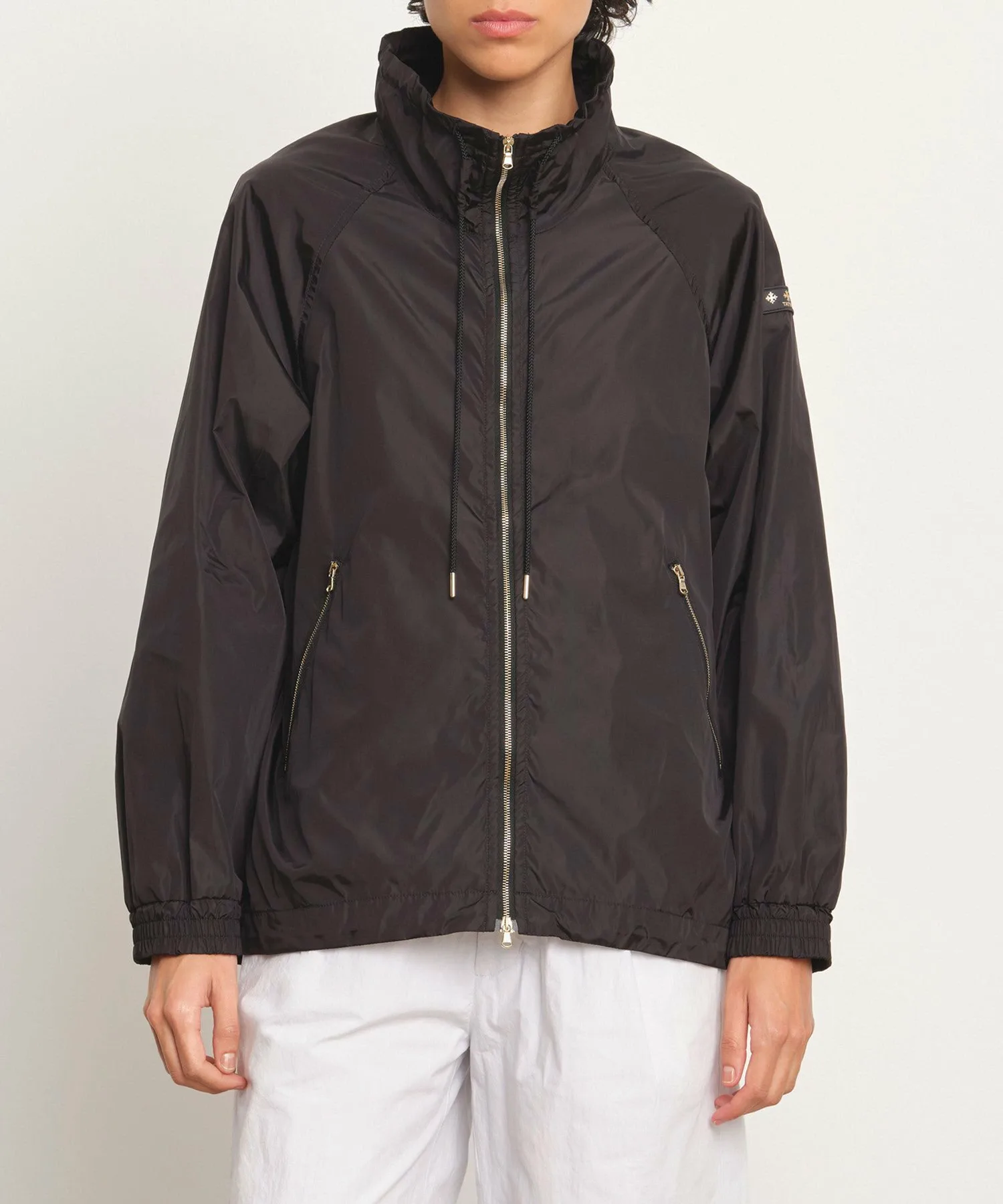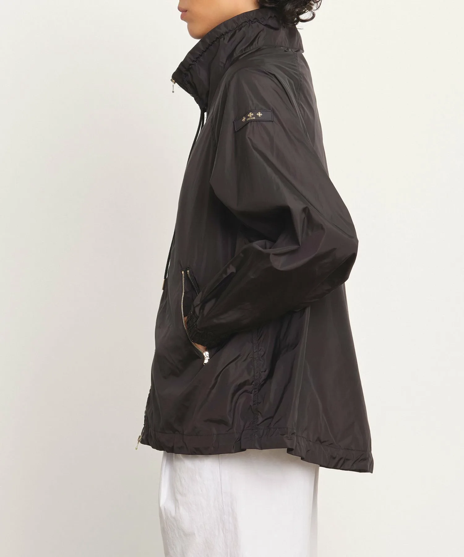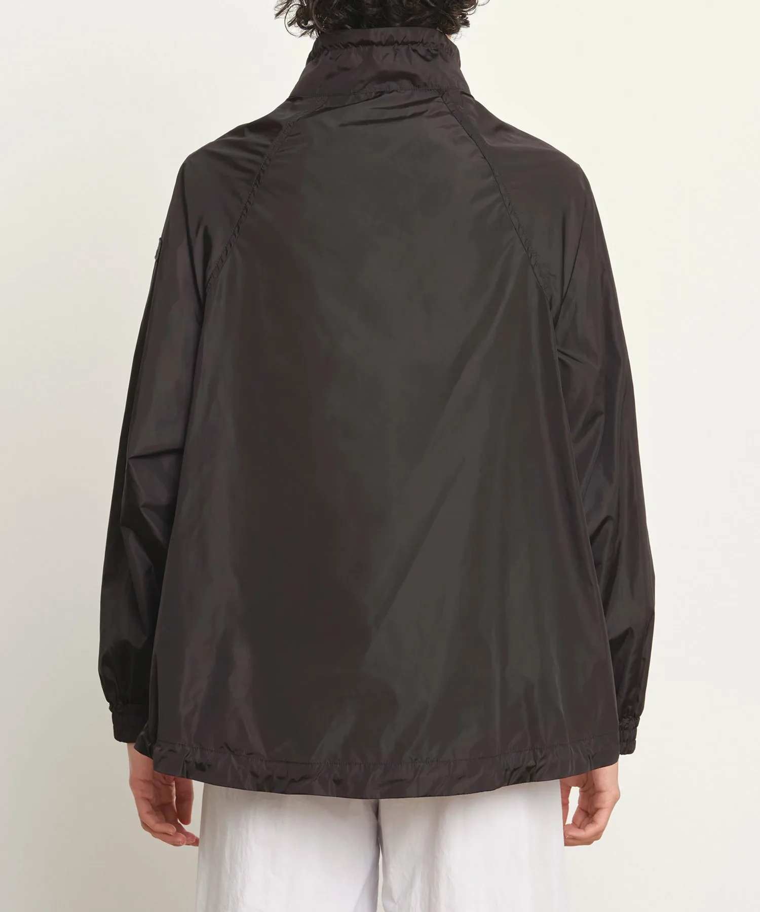 Блузон средней длины с впечатляющим А-образным силуэтом и объемным воротником-стойкой.