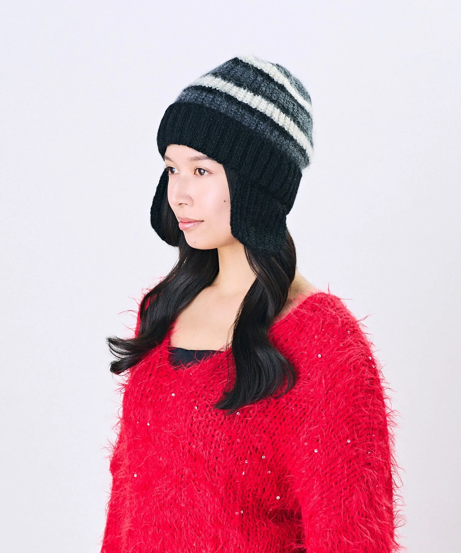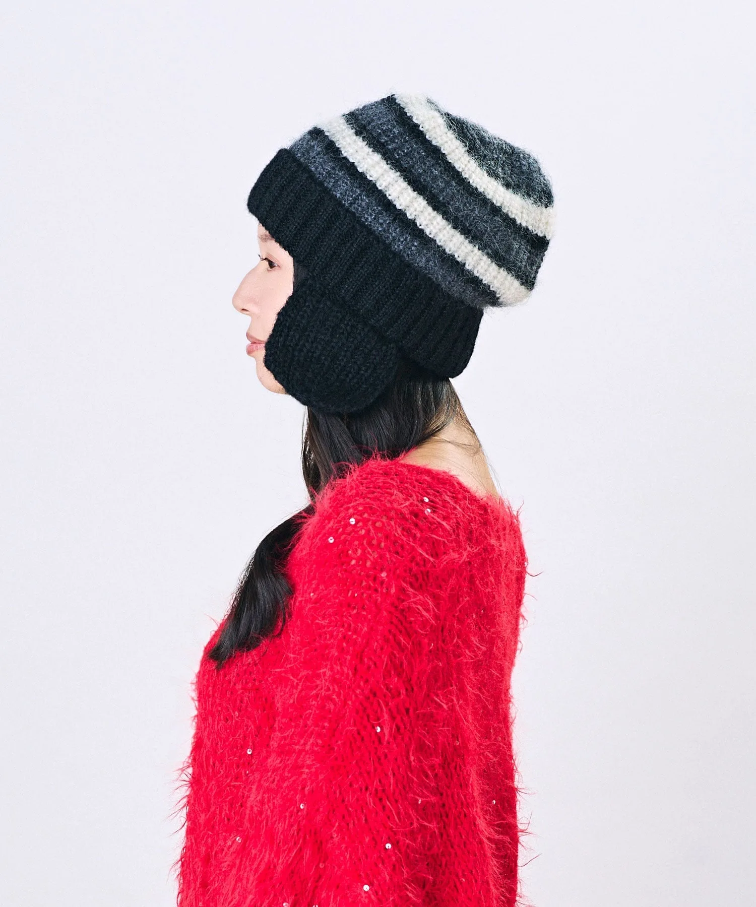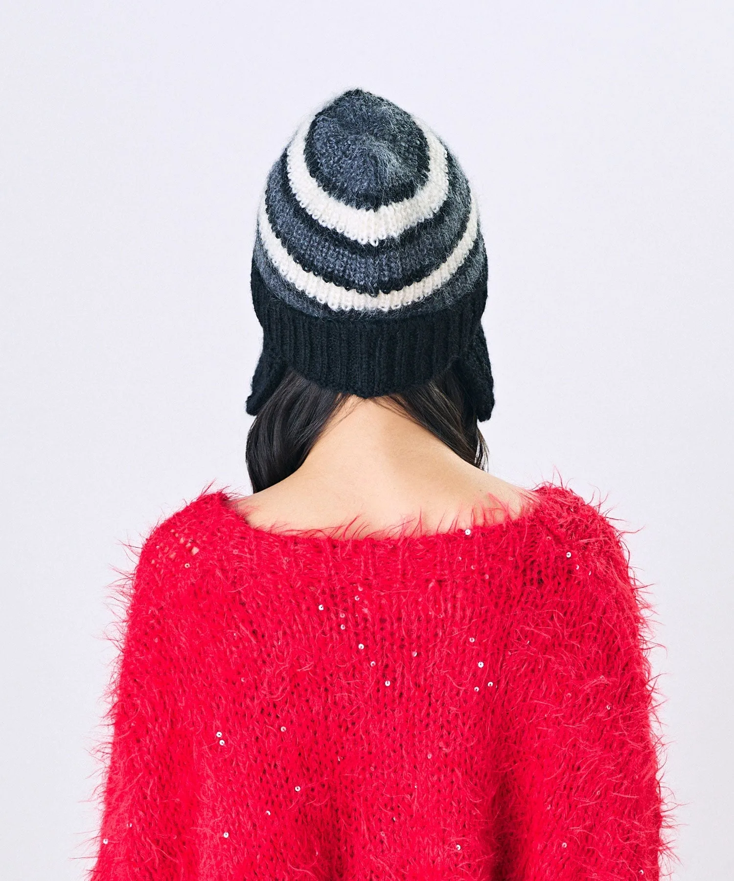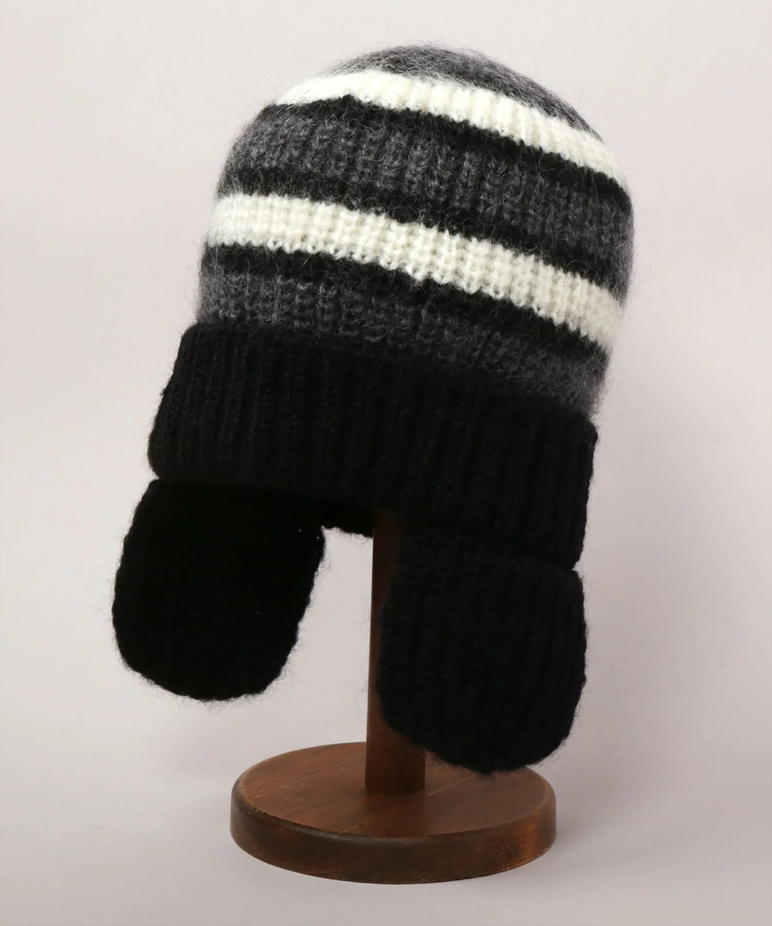 Эластичная ребристая вязка мягко облегает голову. Ушки можно заправить внутрь и носить как простую вязаную шапку.