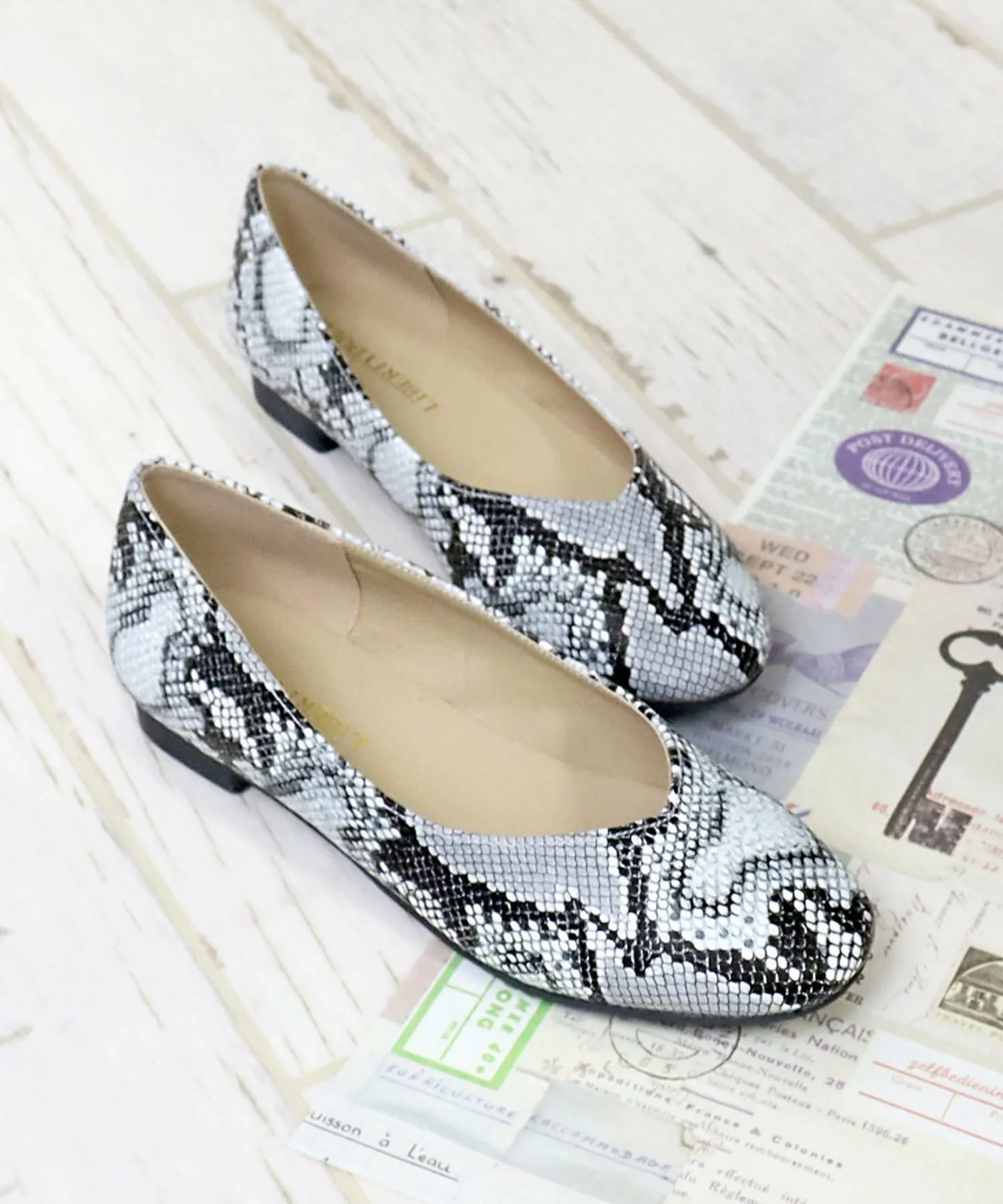 Плоские туфли-лодочки с лаконичным силуэтом, квадратным носком и V-образным вырезом.