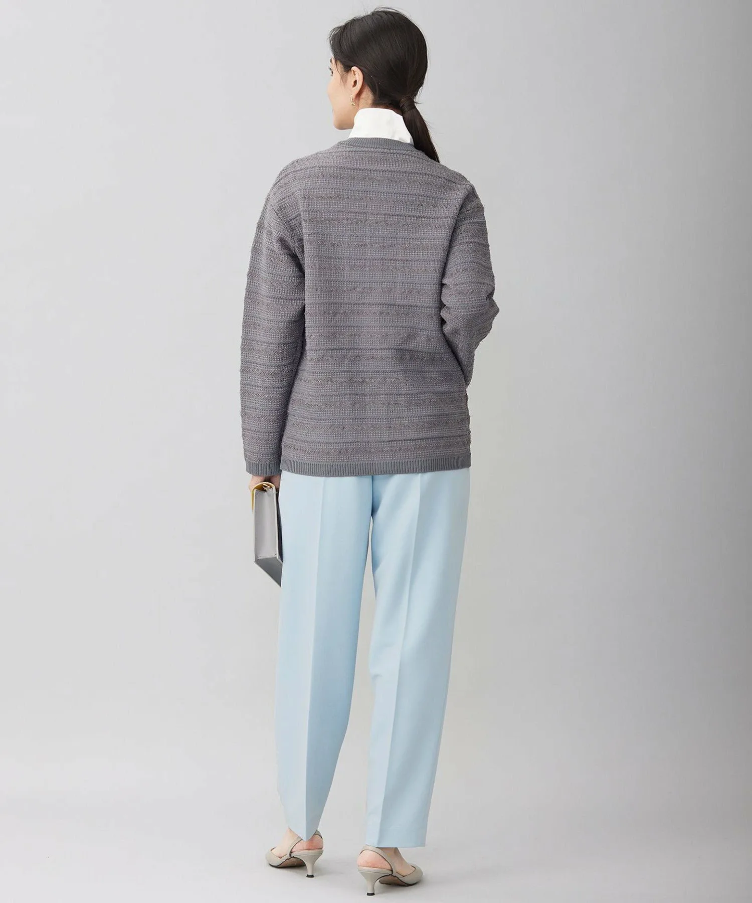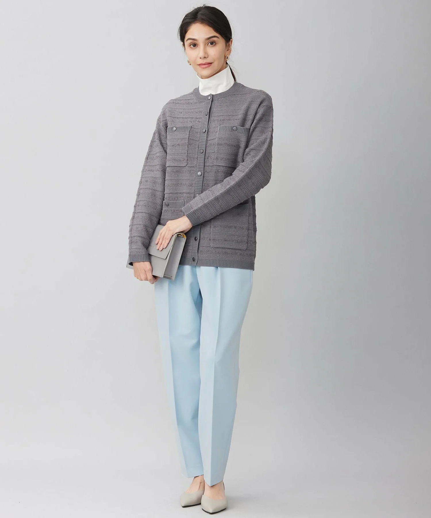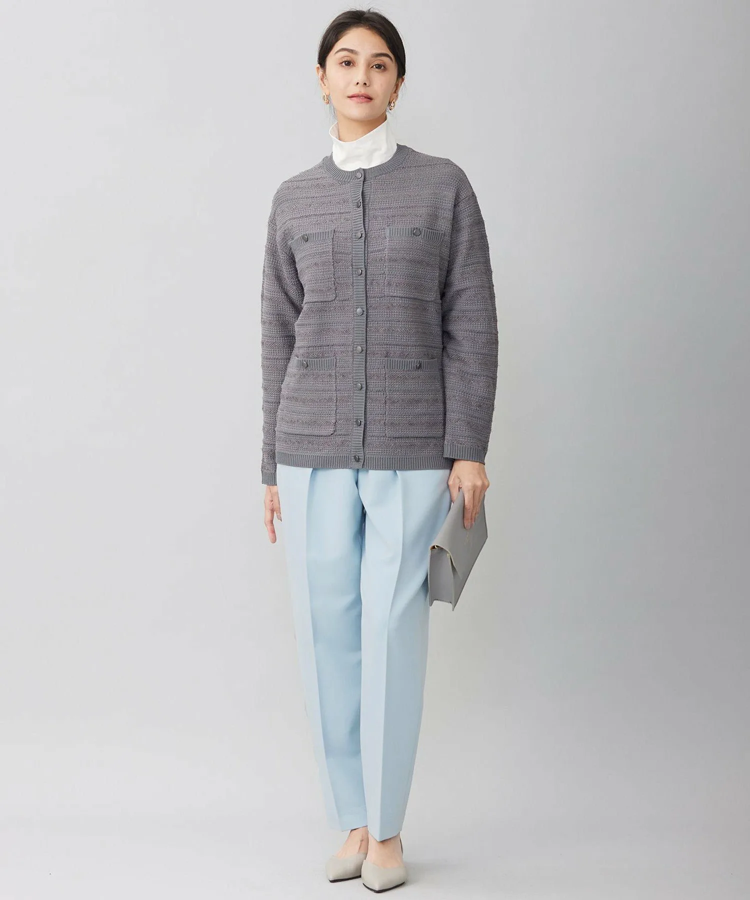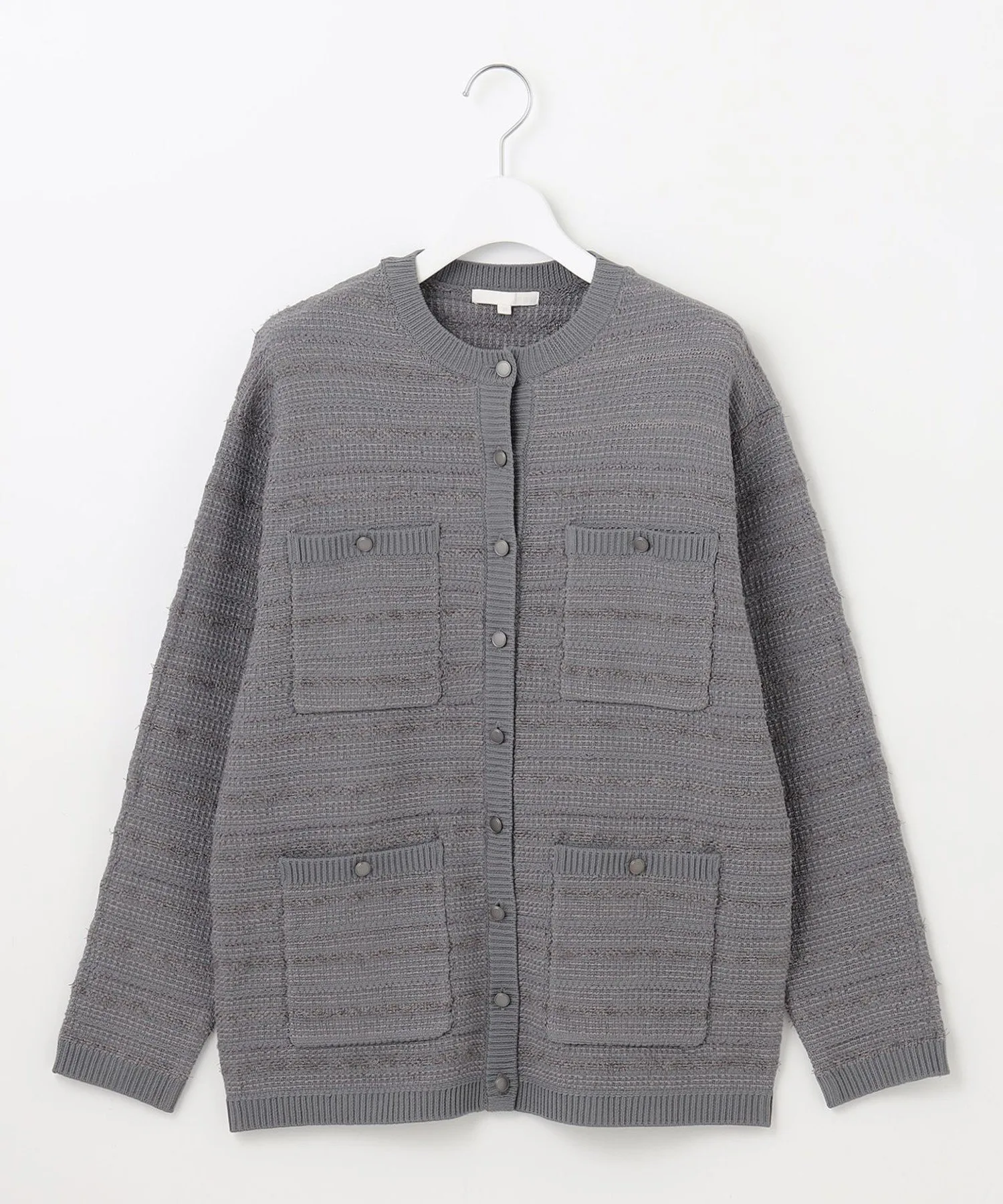Незаменимая вещь среди вязаных предметов верхней одежды весенних цветов. Дизайн: Эта вязаная верхняя одежда отличается модными карманами и деталями на пуговицах. Хотя сам материал пушистый, в нем не используется зимняя пряжа, что делает его подходящим для длительного ношения в зависимости от нижнего белья. Дизайн повседневный, но элегантный, позволяя носить его под пальто в холодную погоду как кардиган или куртку, или как вязаную верхнюю одежду в теплую погоду. Длина доходит до бедер, что позволяет сочетать его с любыми брюками или юбками. Цвет Sax (072) доступен только в интернет-магазине. Этот изысканный вязаный материал на первый взгляд кажется простым, но благодаря сочетанию различных видов пряжи с разной текстурой приобретает глубокую, трехмерную текстуру. Основной материал — пушистая, легкая полиэстеровая пряжа, создающая очень легкий, весенний материал. Вязаный жилет (KRWMCM0252) изготовлен из того же материала.