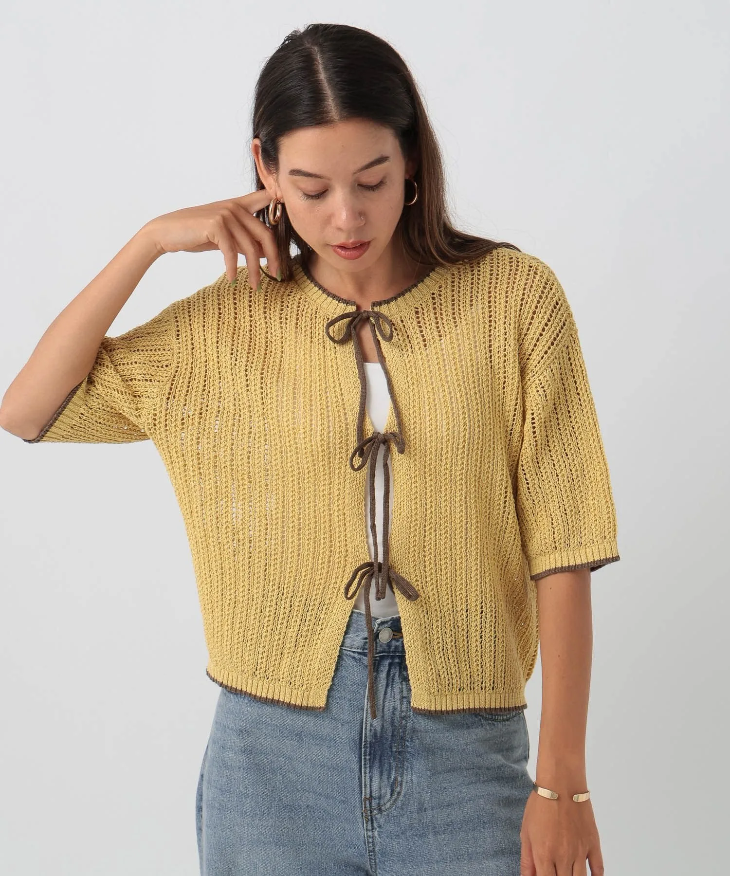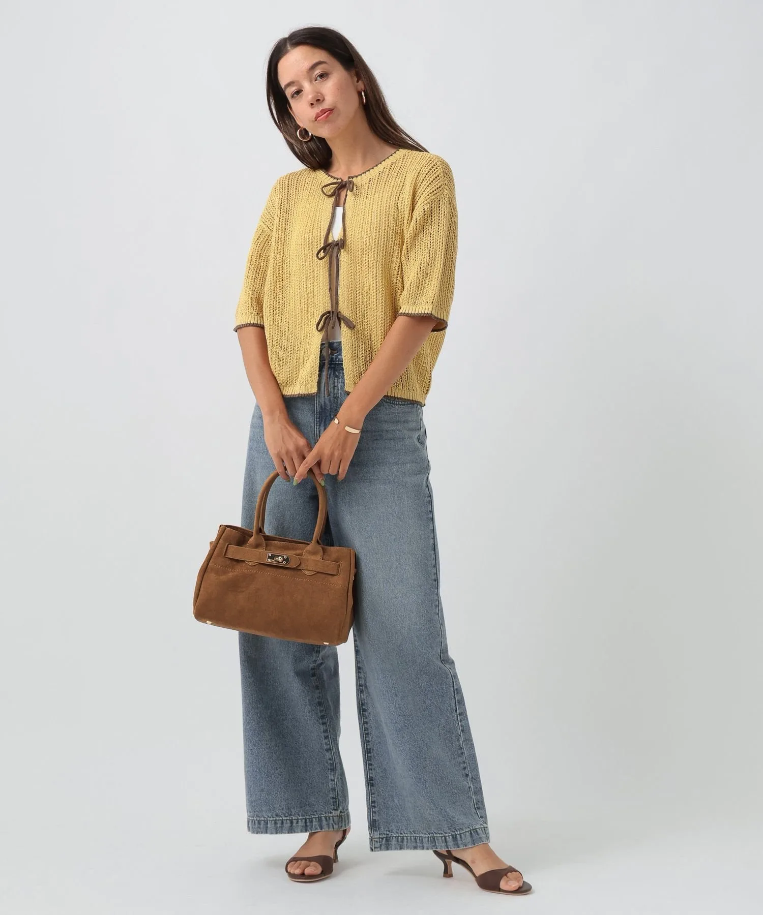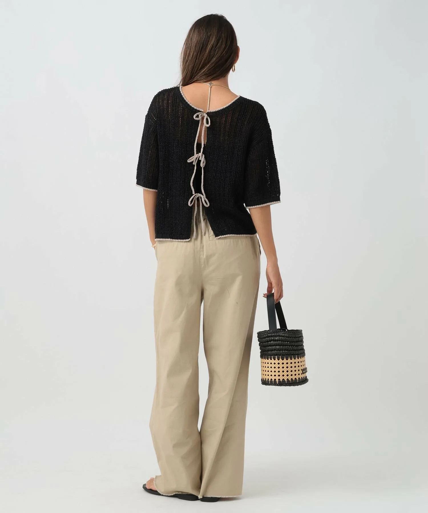 Мы рекомендуем женственный и повседневный образ с джинсами или широкими брюками, украшенными лентами.