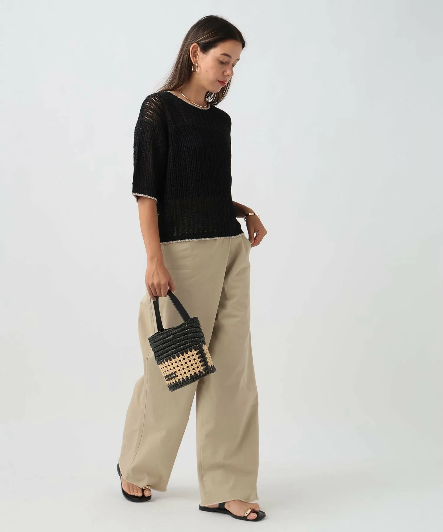 Небольшой объем отлично сочетается с объемными брюками.