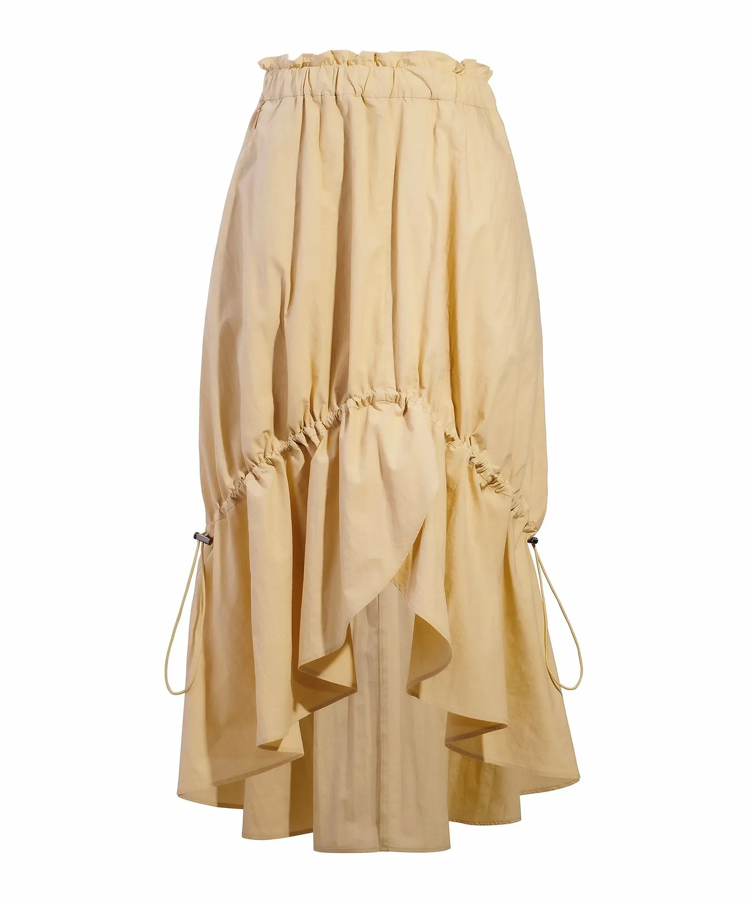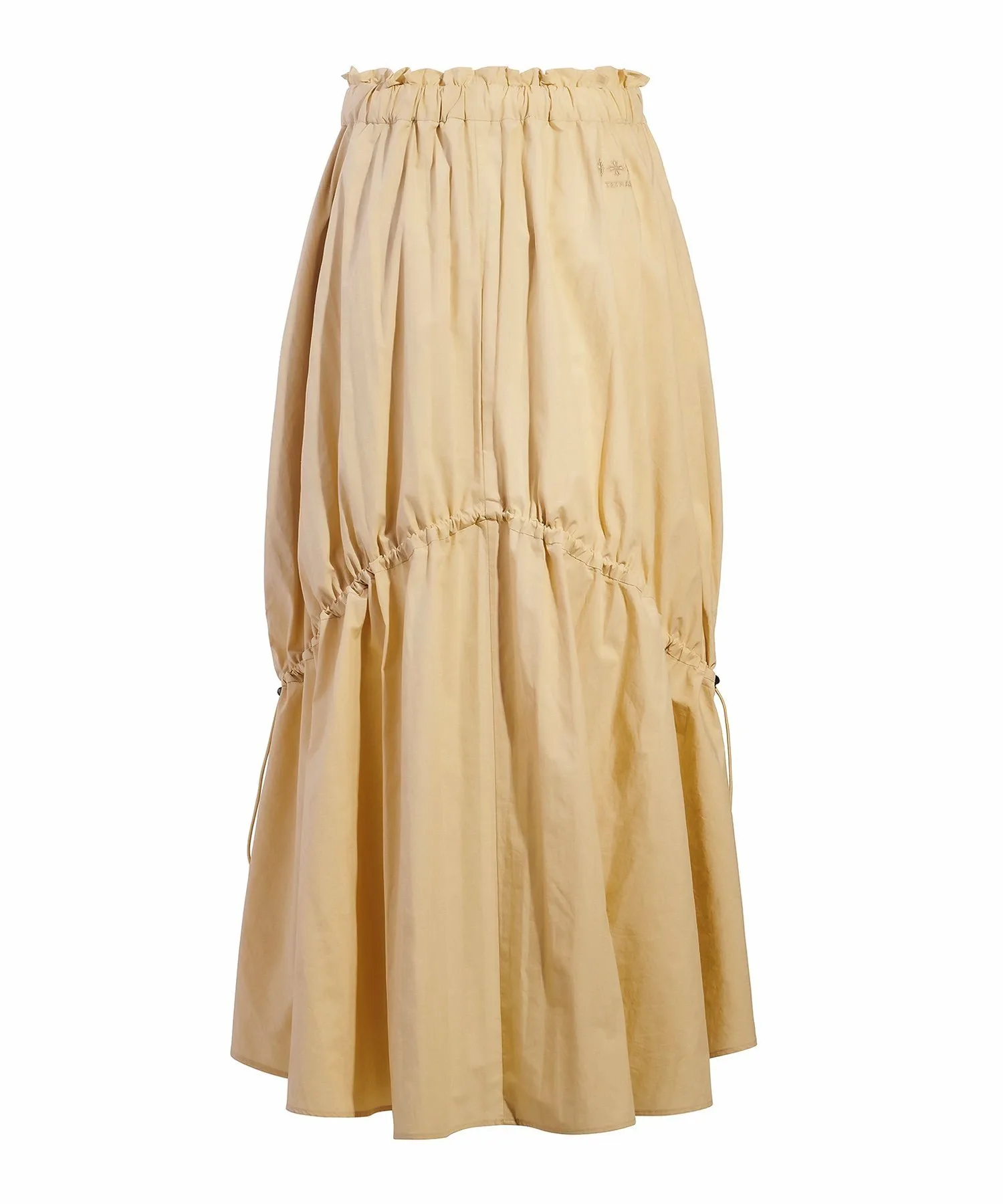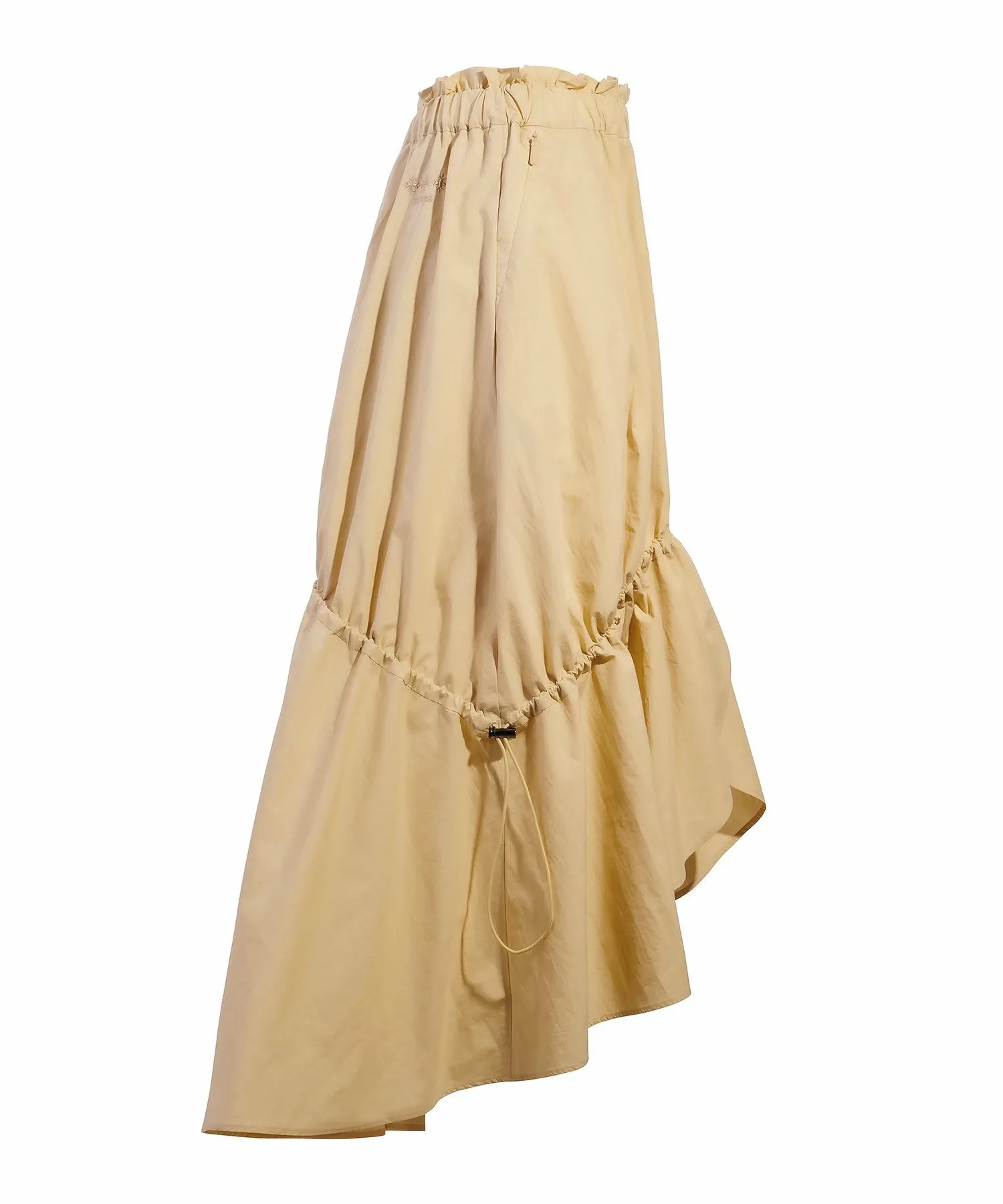 Эта длинная юбка имеет регулируемые боковые шнурки для создания женственного, но в то же время непринужденного образа. Приподнятый крой спереди добавляет стилю непринужденности. Она изготовлена из плотной ткани, напоминающей пишущую машинку, сочетающей в себе естественную текстуру хлопка с блеском нейлона. Ручная обработка создает естественный мятый вид. Ограничитель шнурка имеет акцент никелевого цвета. Эта элегантная вещь отличается динамичным дизайном, который одновременно изящен и не слишком приторный.