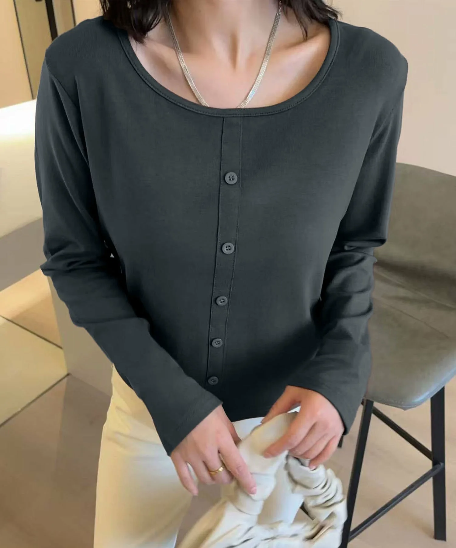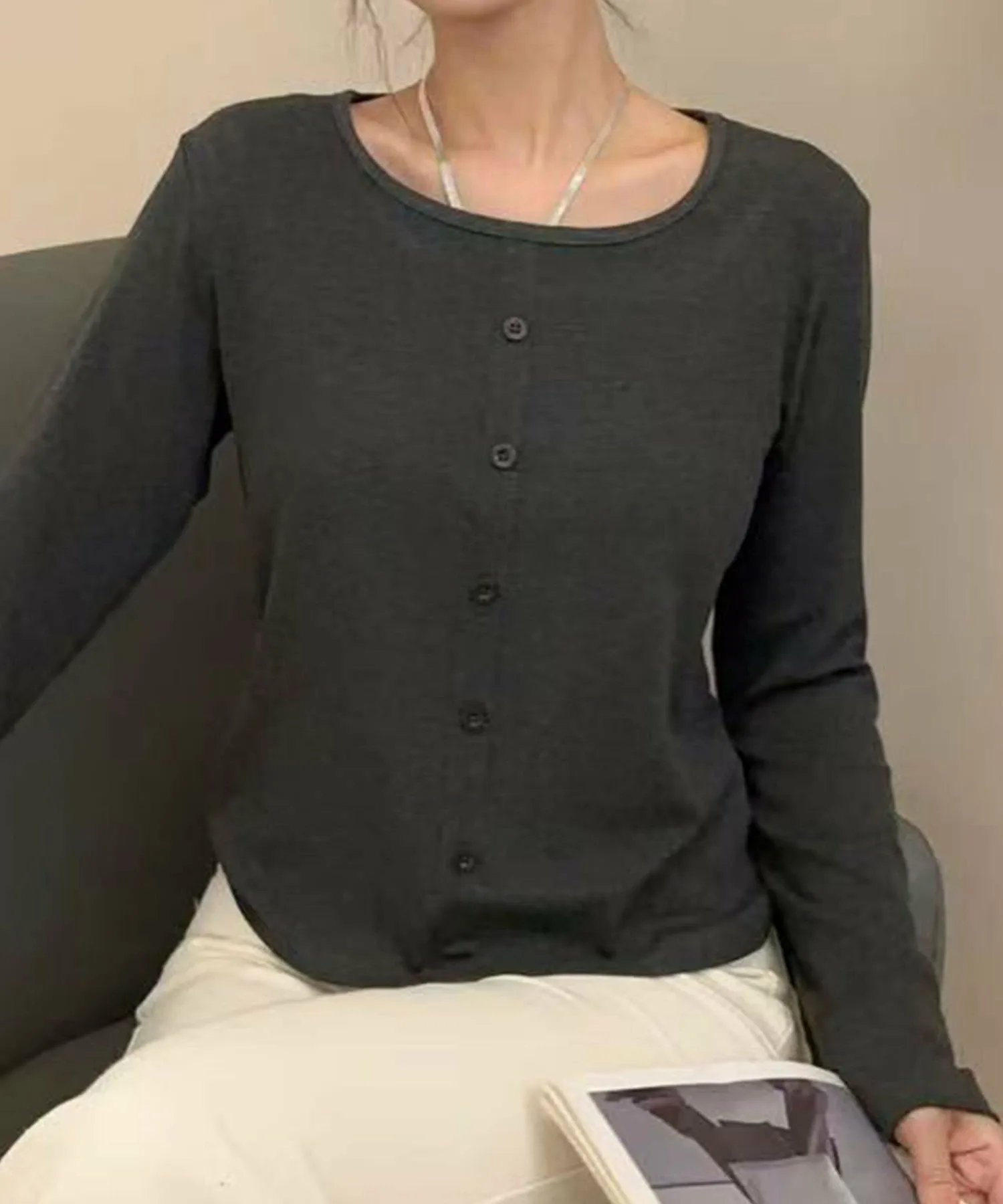 Простая блузка с круглым вырезом и длинными рукавами, застегивающаяся на пуговицы спереди. Приталенный силуэт стильный, но в то же время свободный, что делает ее удобной для повседневной носки.
