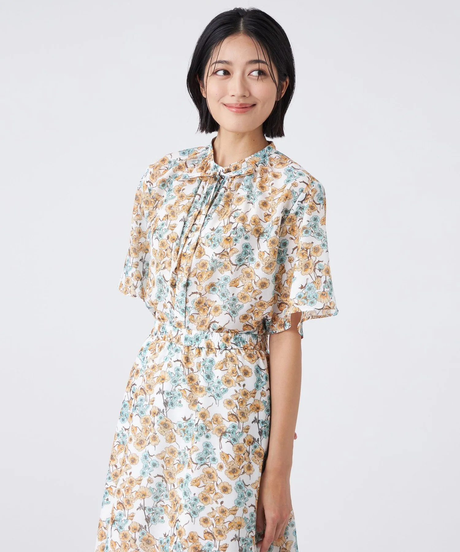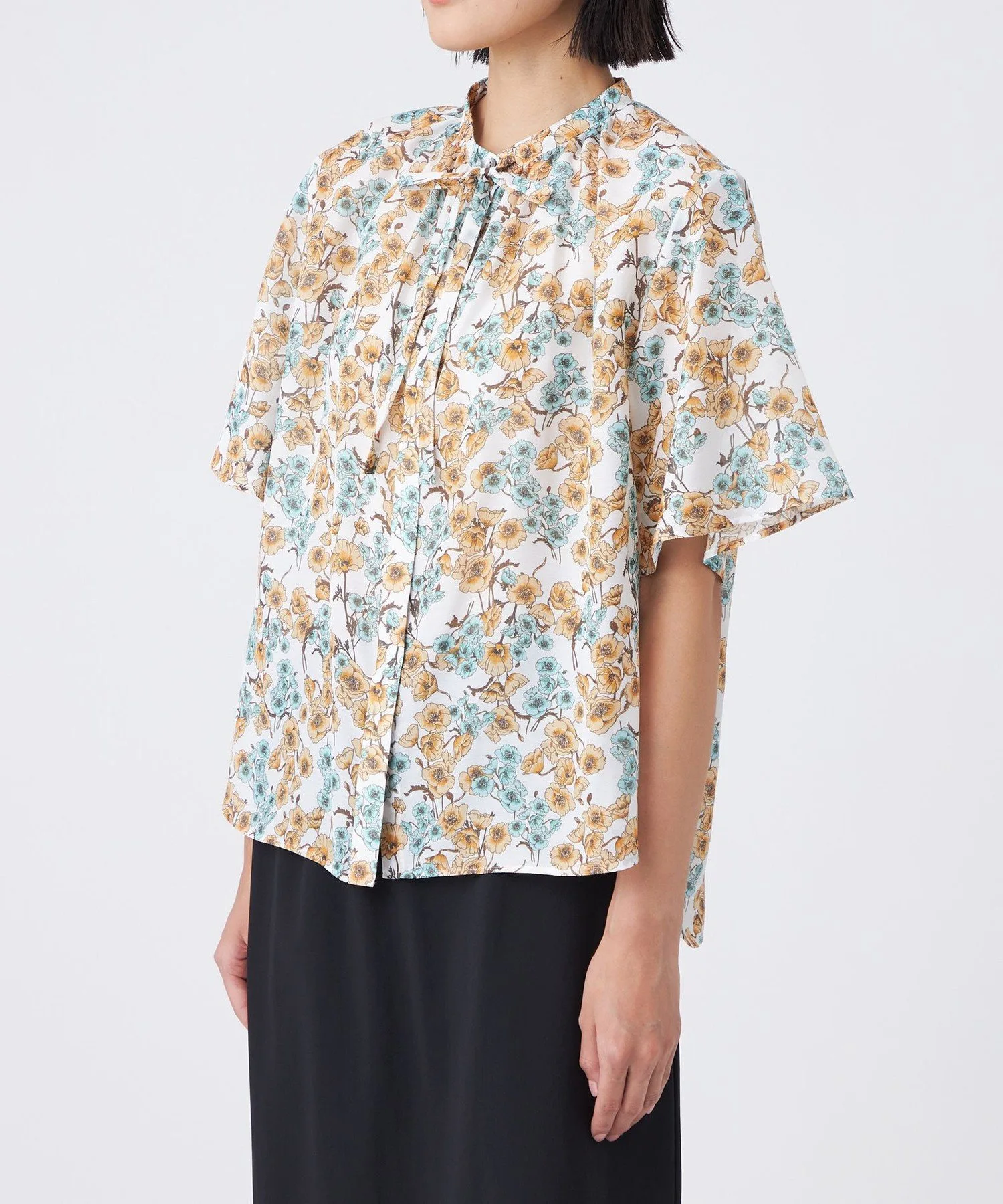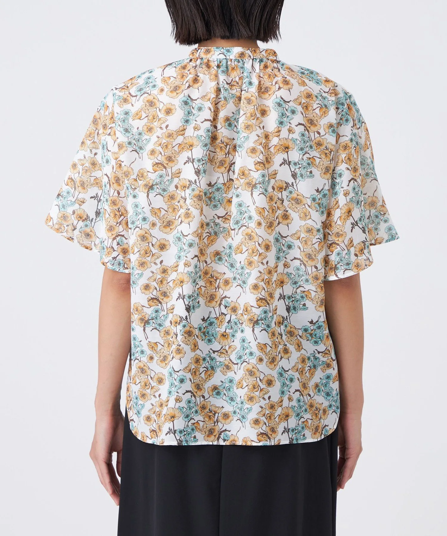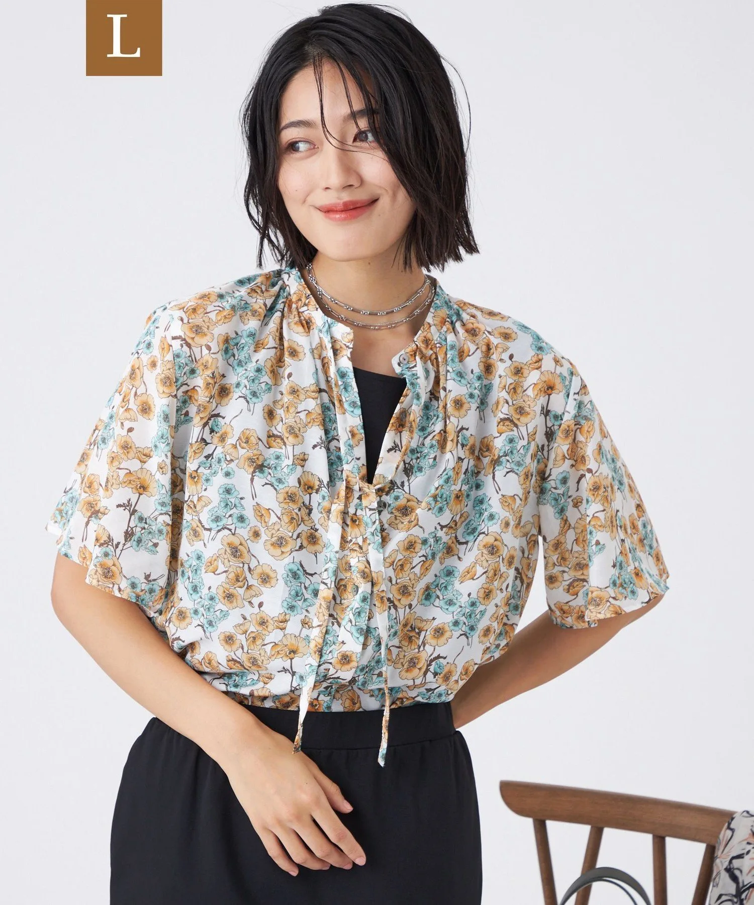 Принт пастельных тонов на белом фоне освежает лицо. Умеренно объемные рукава-колокола создают стильный образ. Она также хорошо сочетается с юбкой (U3S16581) из того же материала для создания сбалансированного образа.