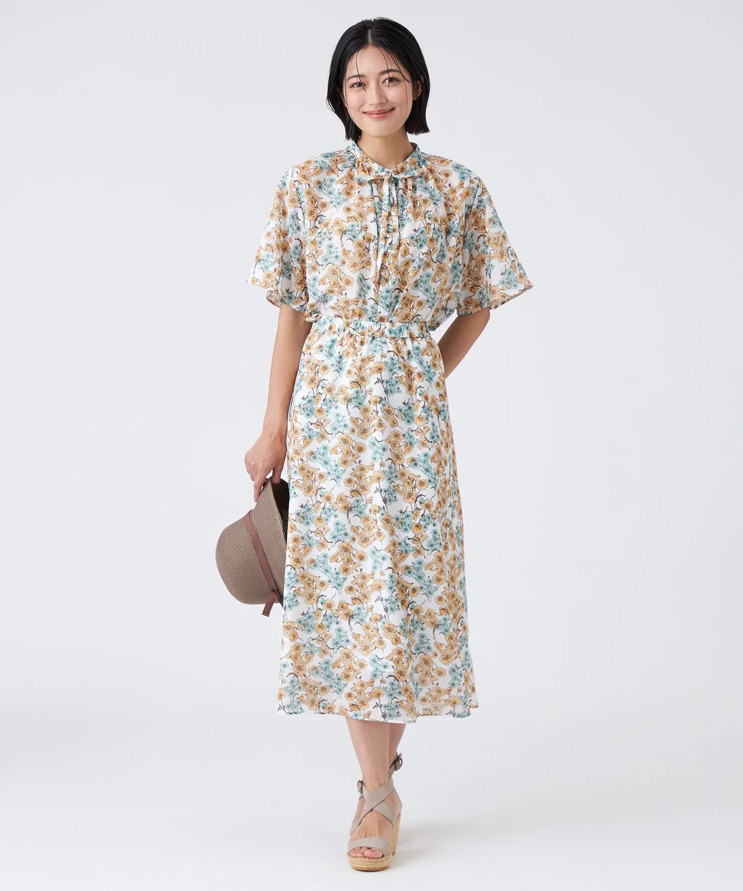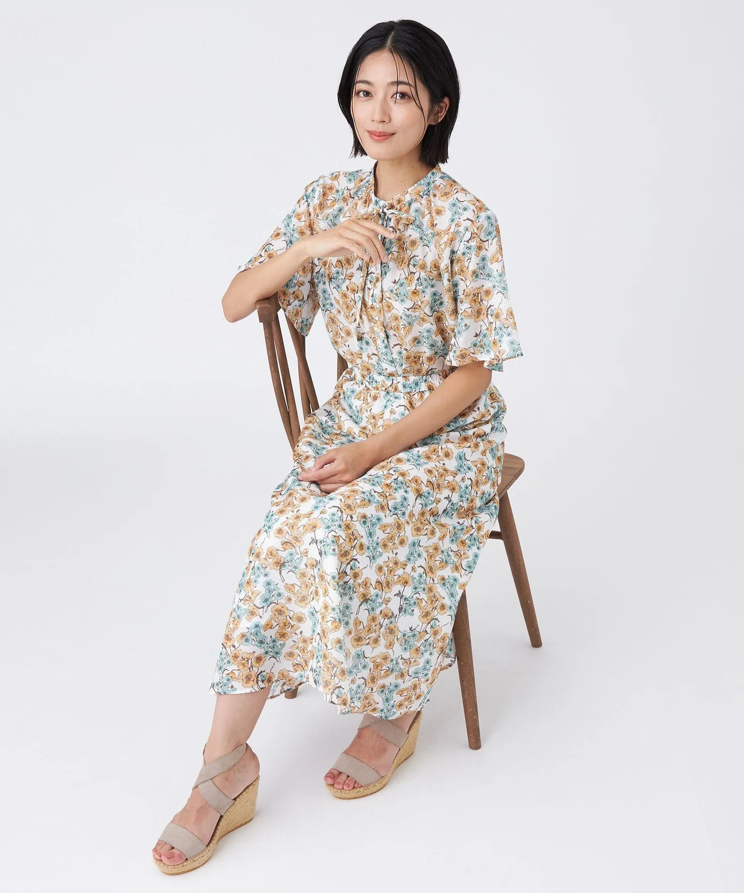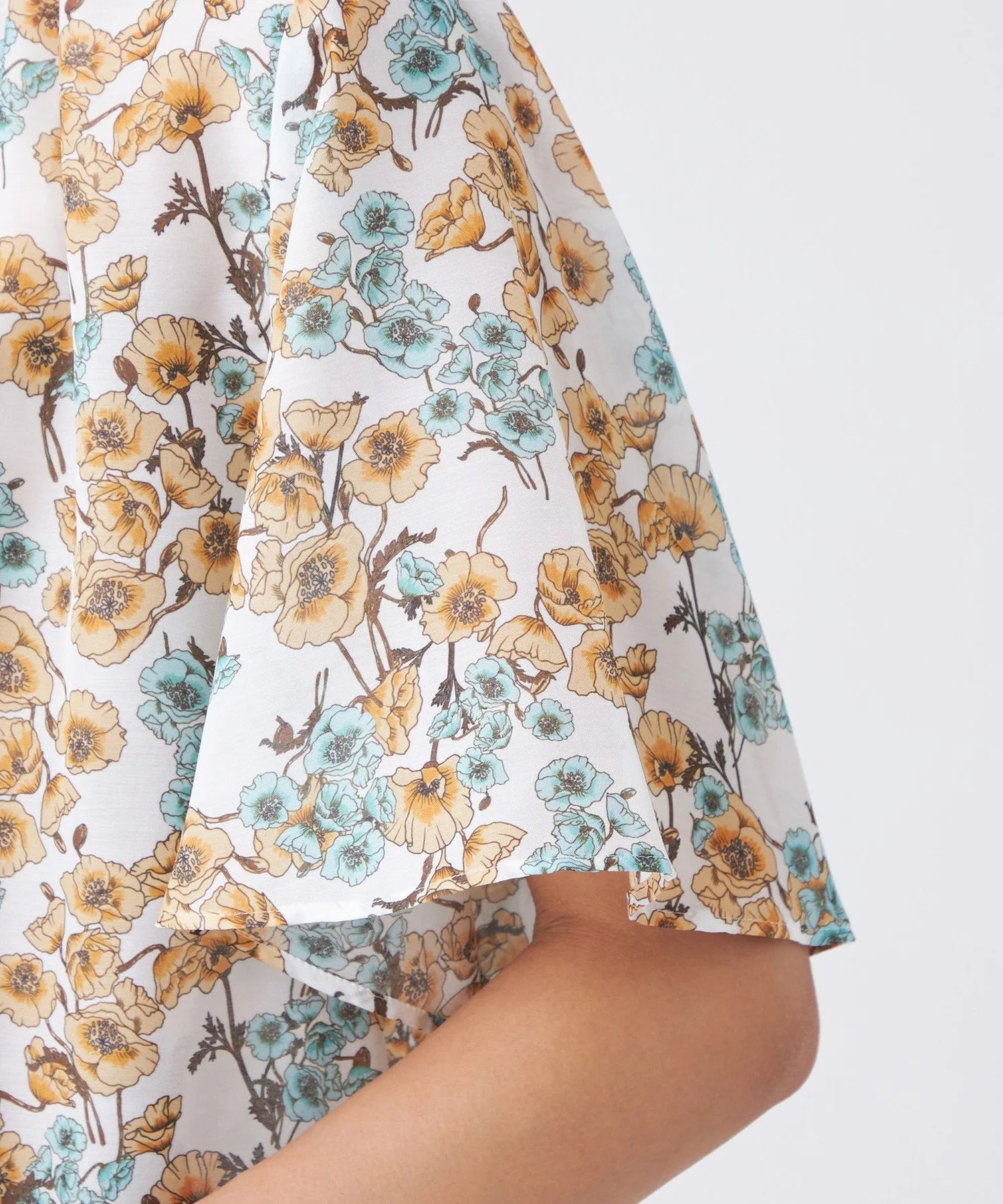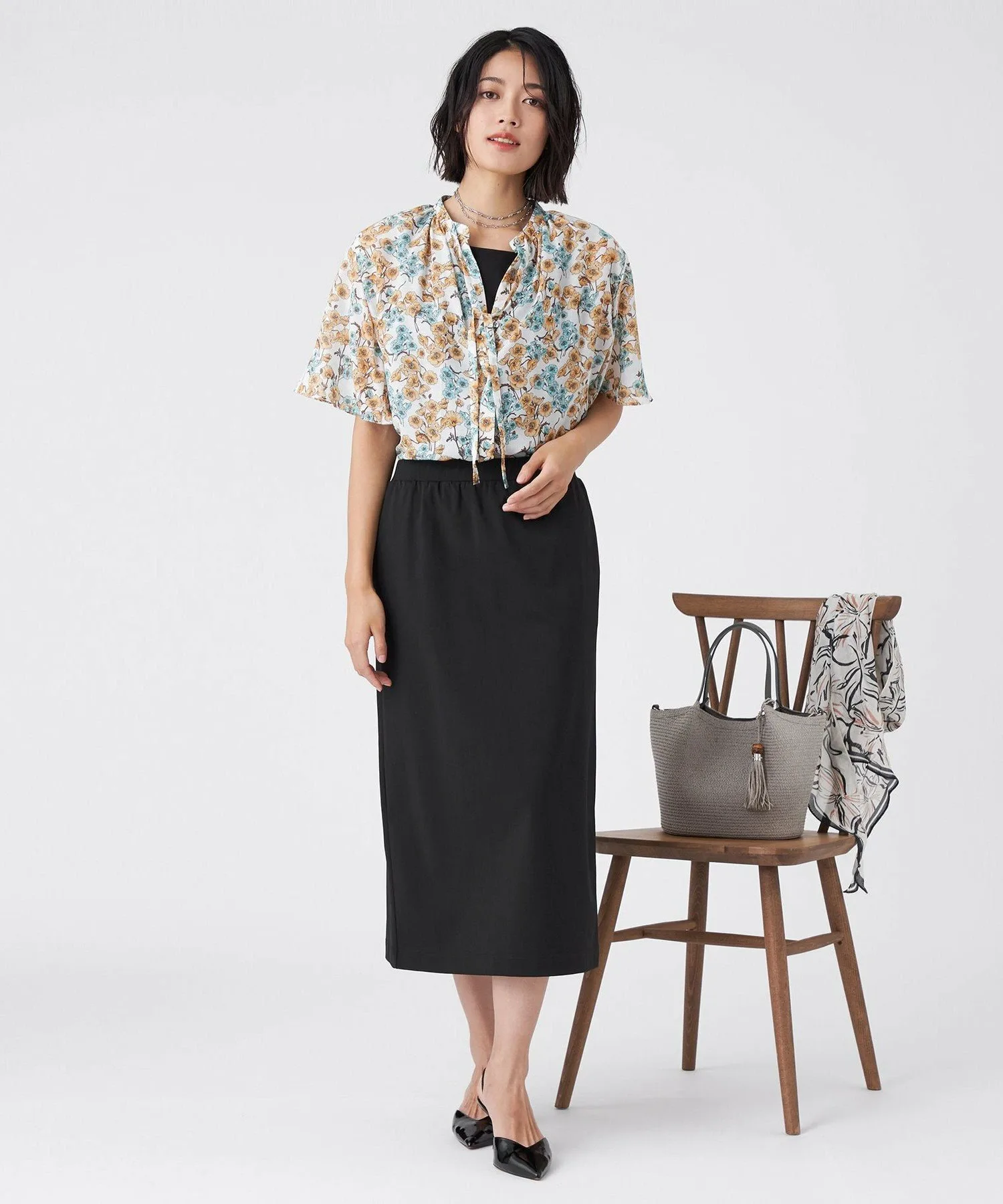 Принт пастельных тонов на белом фоне освежает лицо. Умеренно объемные рукава-колокола создают стильный образ. Она также хорошо сочетается с юбкой (U3S16581) из того же материала для создания сбалансированного образа.