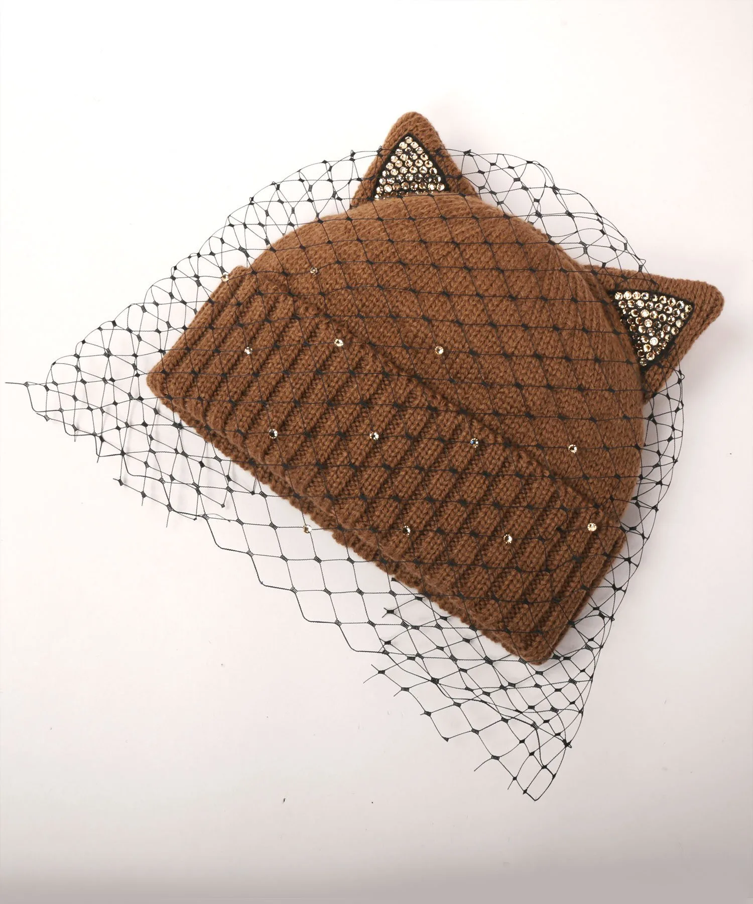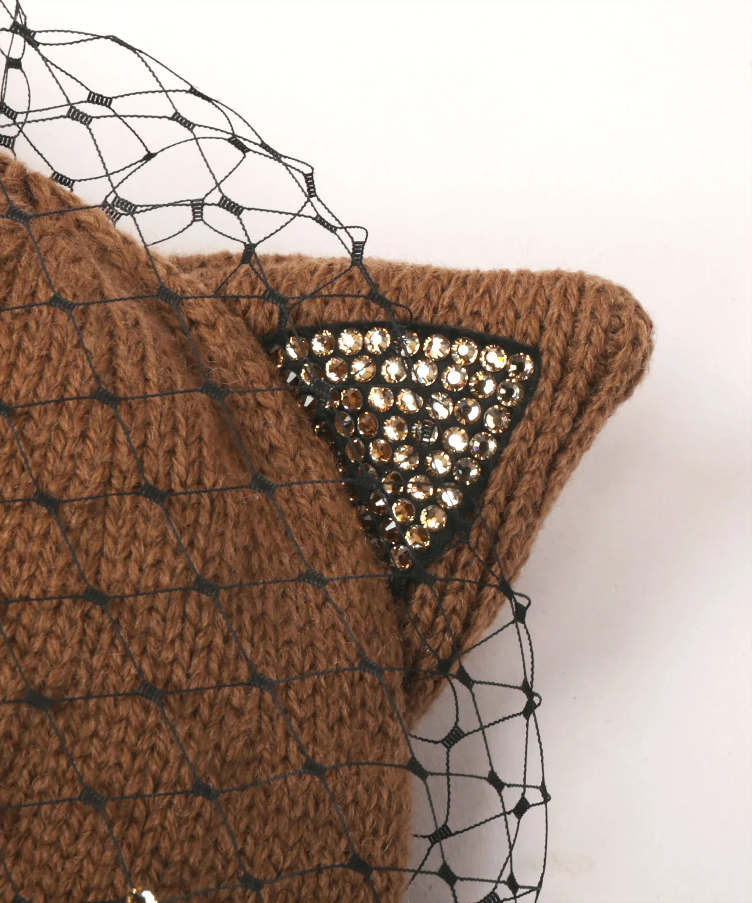 Крупные стразы на ушках сверкают при каждом движении, создавая великолепный образ. Тюль, обволакивающий все изделие, также украшен стразами, что придает ему изысканный и элегантный вид.