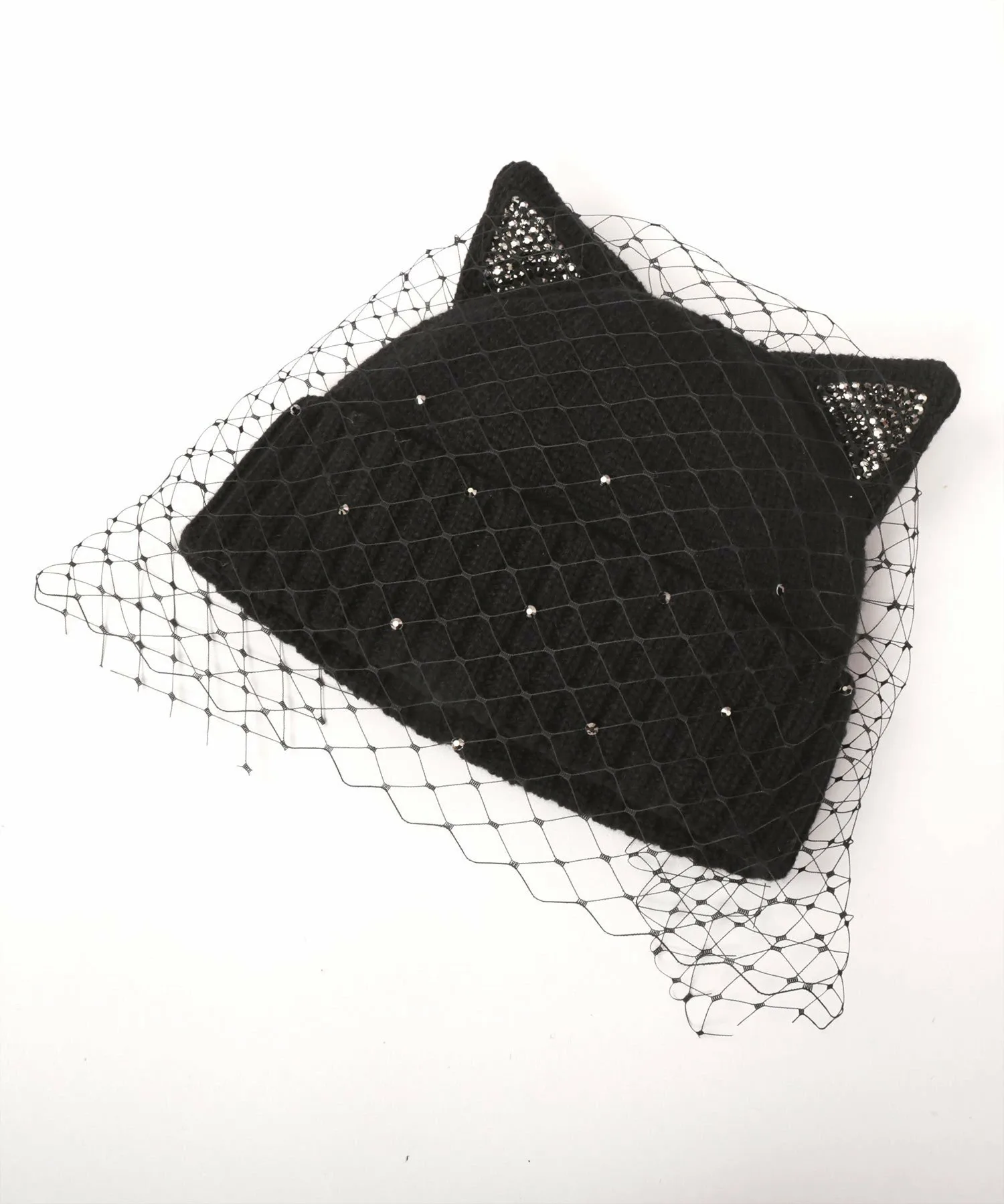 Крупные стразы на ушках сверкают при каждом движении, создавая великолепный образ. Тюль, обволакивающий все изделие, также украшен стразами, что придает ему изысканный и элегантный вид.