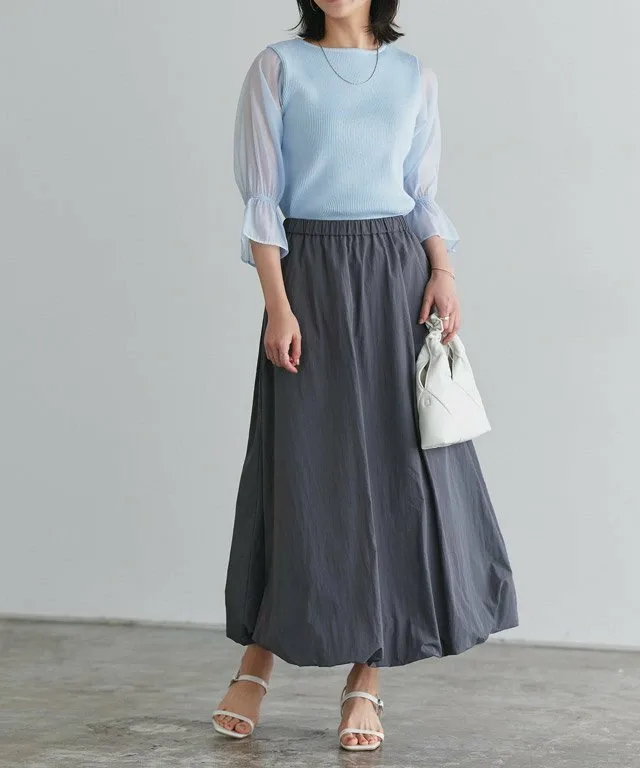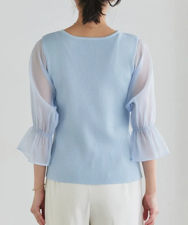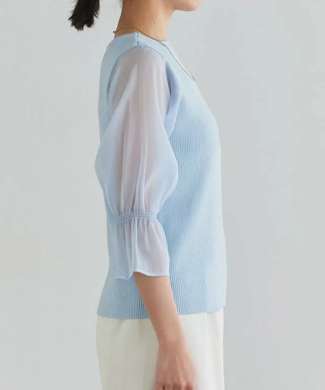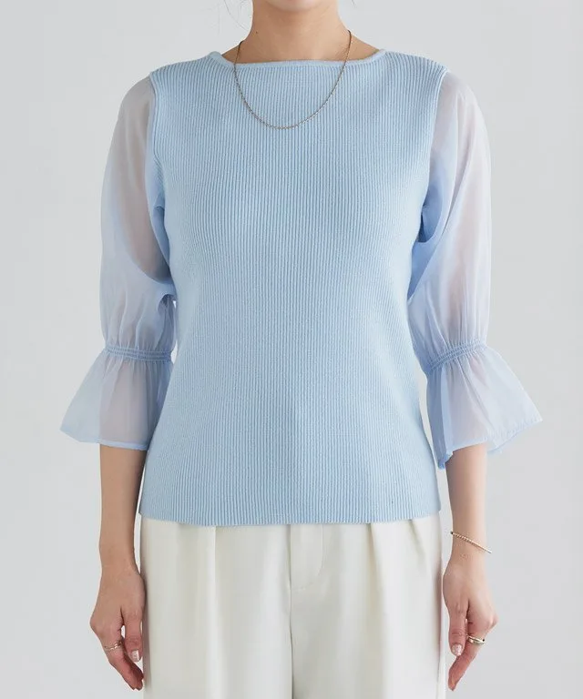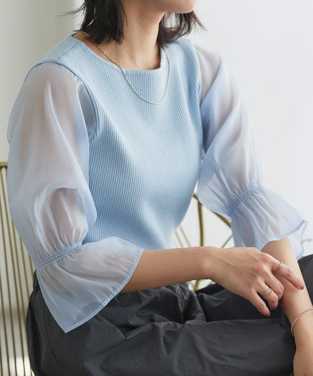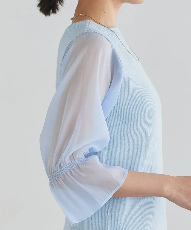 Трикотажное платье, сочетающее в себе различные материалы для создания привлекательного силуэта. Рукава-«конфетки» и прозрачный материал в совокупности создают зрелый, женственный стиль.