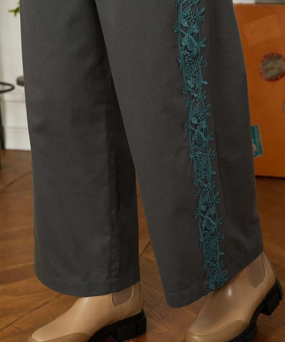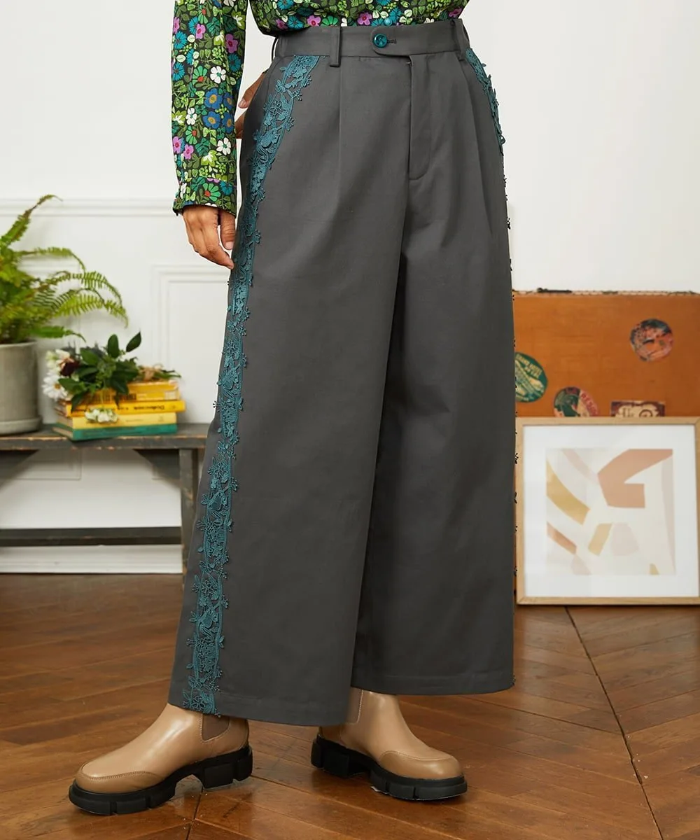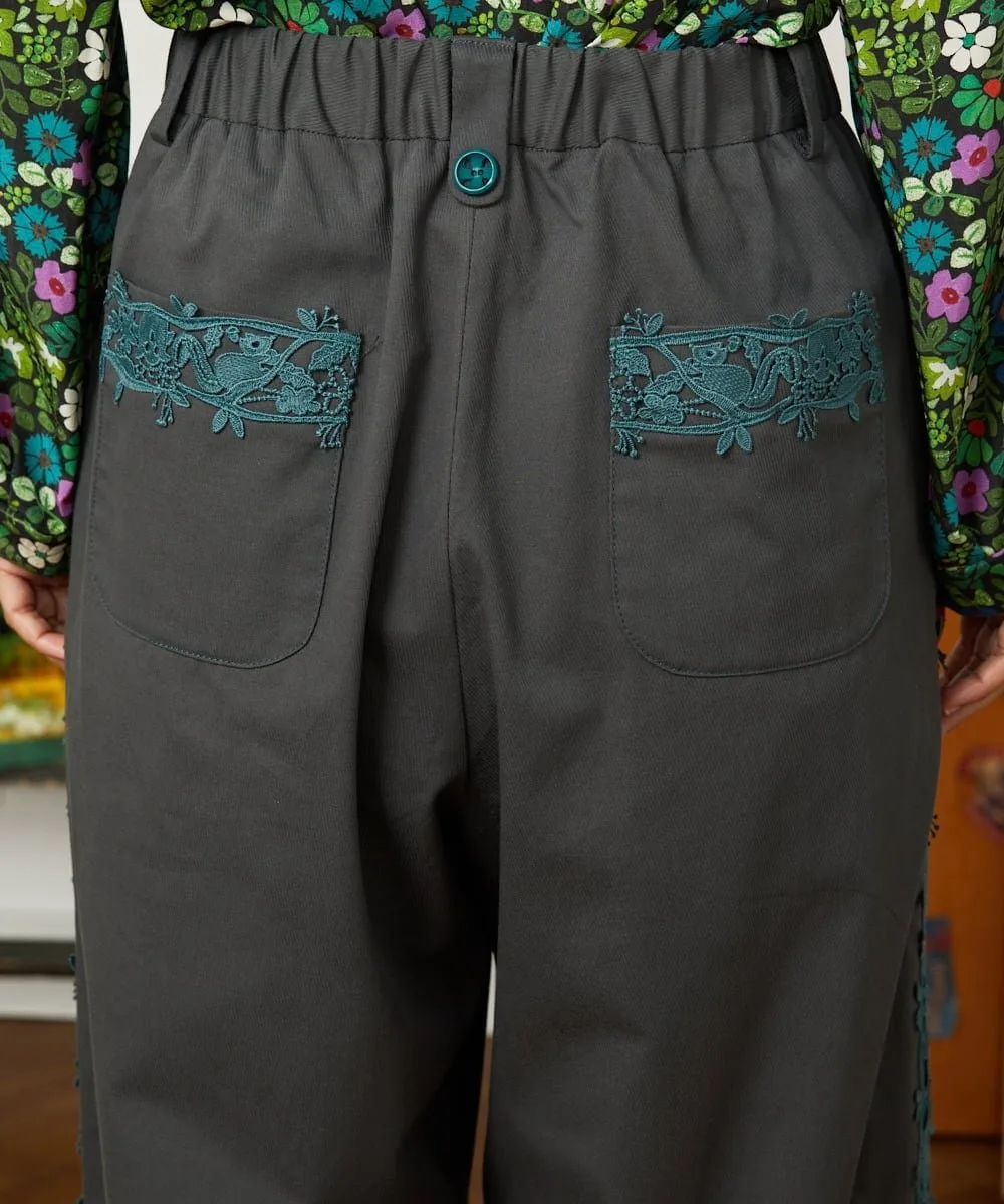 Эти брюки украшены привлекательным кружевом по бокам. Вдохновлены темой «Дорога через холм». Широкий, свободный силуэт обеспечивает комфортную посадку. Кружево по бокам и на задних карманах имеет оригинальный дизайн с животными, спрятанными среди цветов. Также обратите внимание на пуговицы в тон, уникальные для HOKOMOMORA. Эти кружевные брюки, необходимые для изысканного повседневного стиля, являются очень рекомендуемой вещью в этом сезоне.