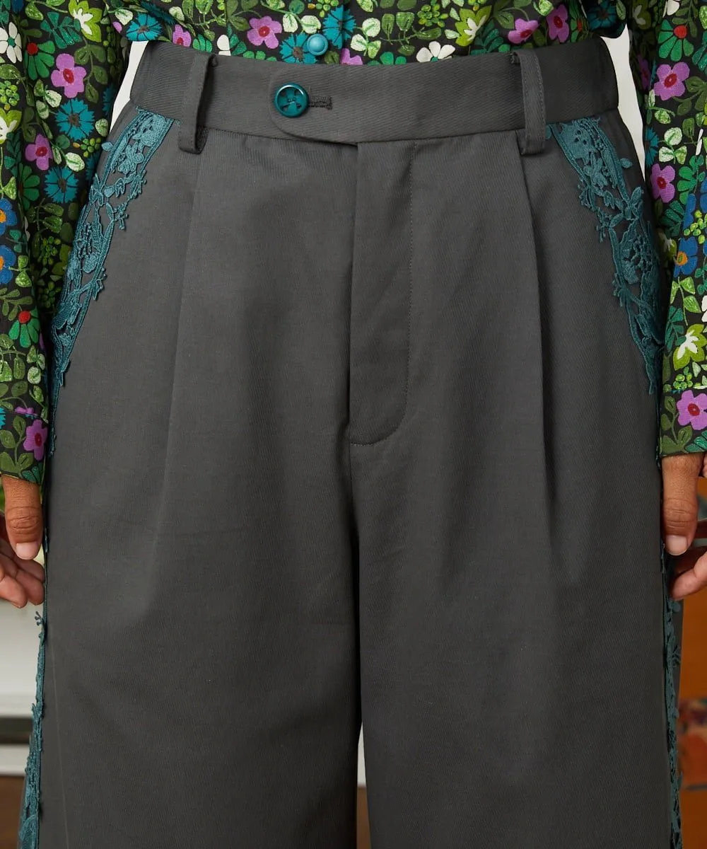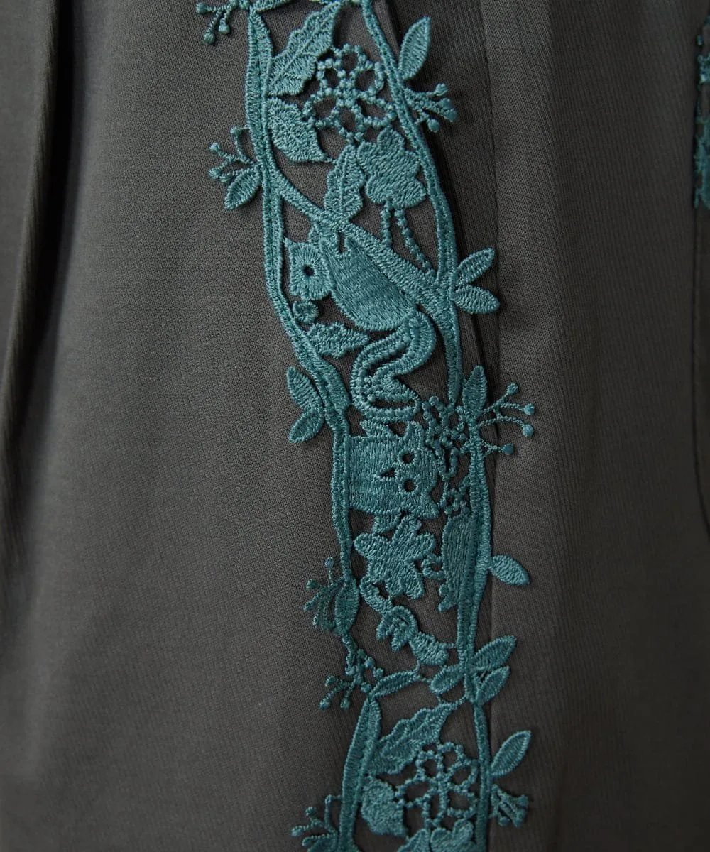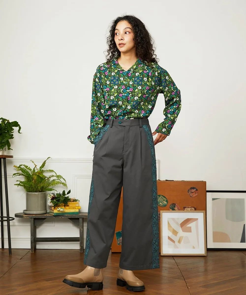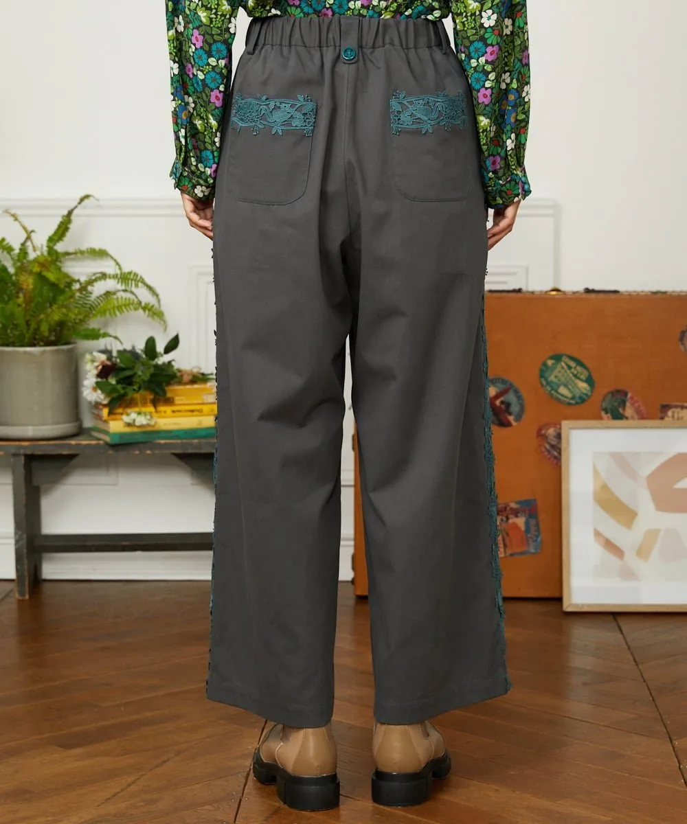 Эти брюки украшены привлекательным кружевом по бокам. Вдохновлены темой «Дорога через холм». Широкий, свободный силуэт обеспечивает комфортную посадку. Кружево по бокам и на задних карманах имеет оригинальный дизайн с животными, спрятанными среди цветов. Также обратите внимание на пуговицы в тон, уникальные для HOKOMOMORA. Эти кружевные брюки, необходимые для изысканного повседневного стиля, являются очень рекомендуемой вещью в этом сезоне.