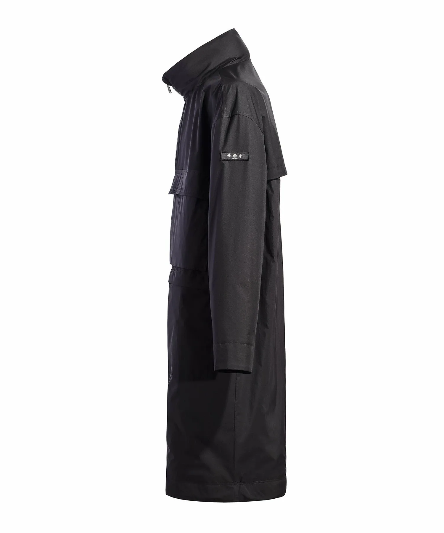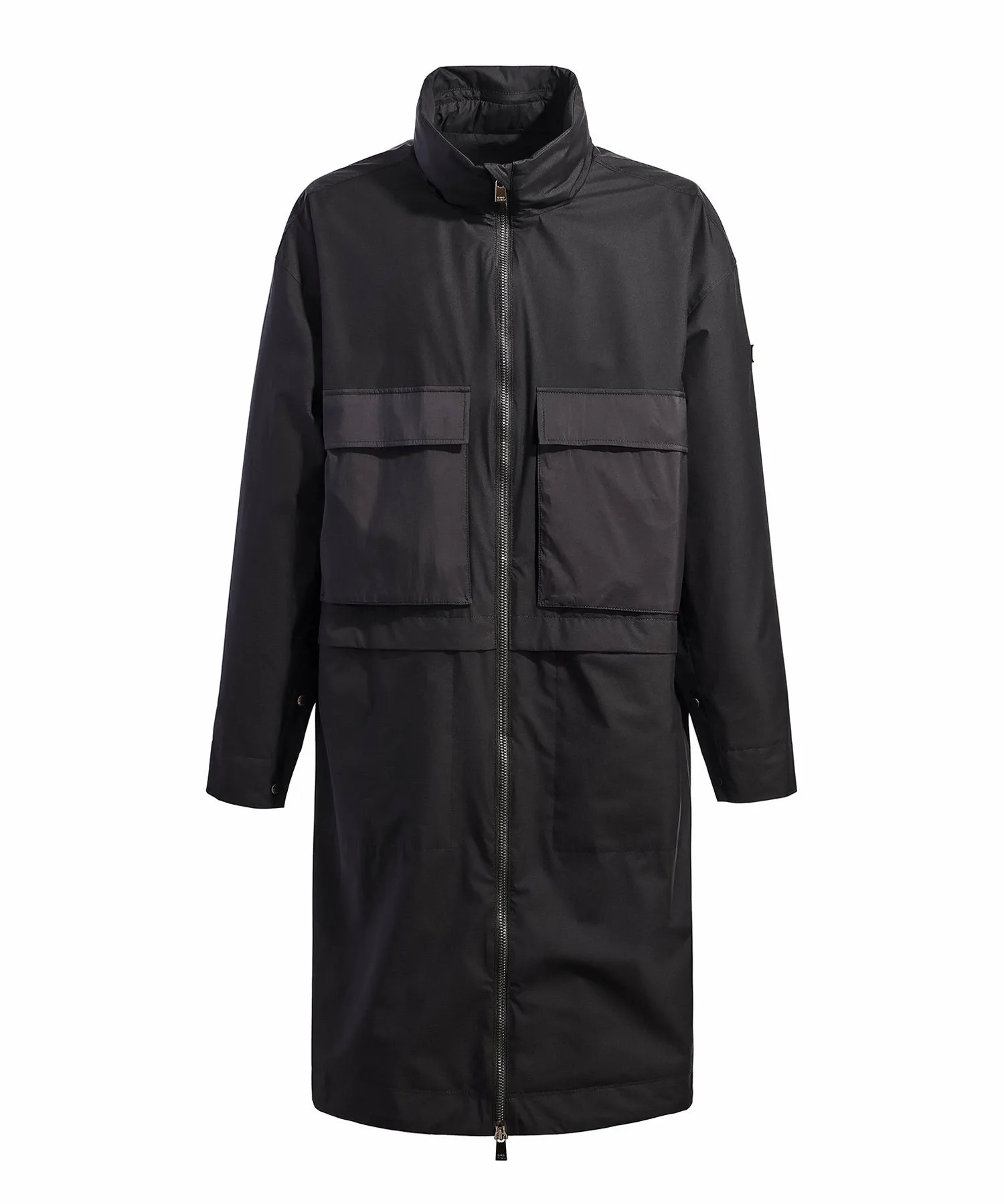 Это длинное пальто выполнено из контрастных тканей на передних карманах и спине.