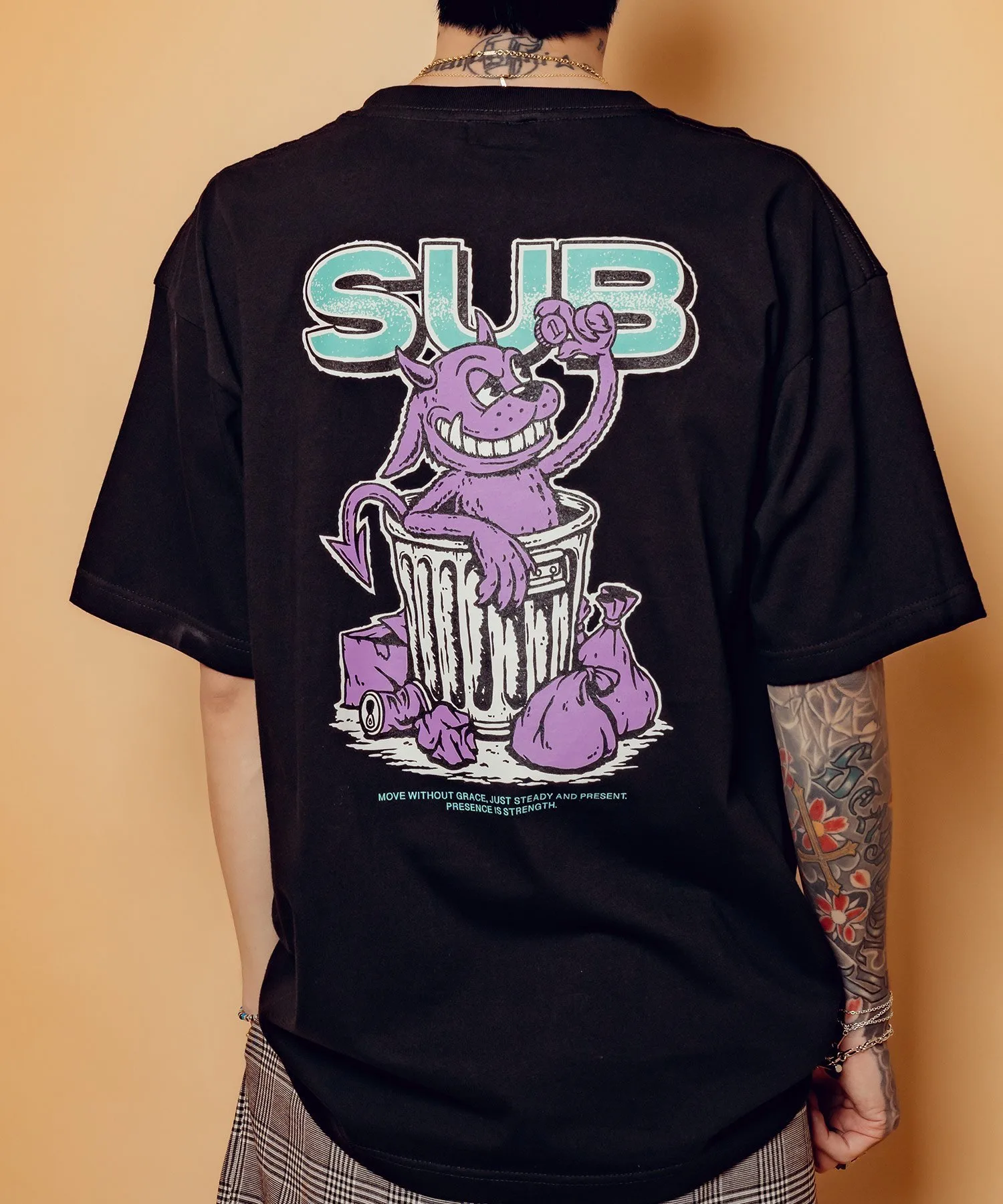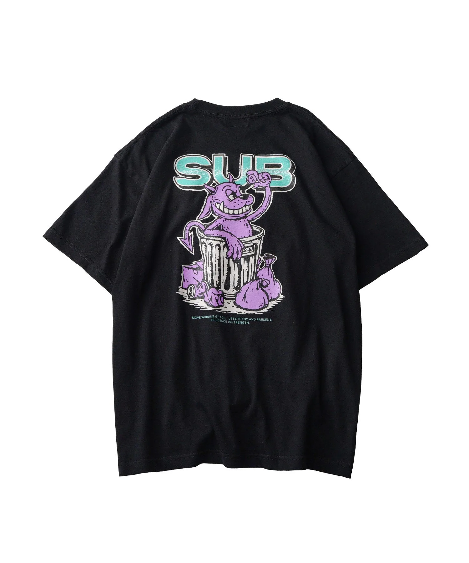 На передней части футболки изображен дьявол, находящий монеты в мусорном ведре.