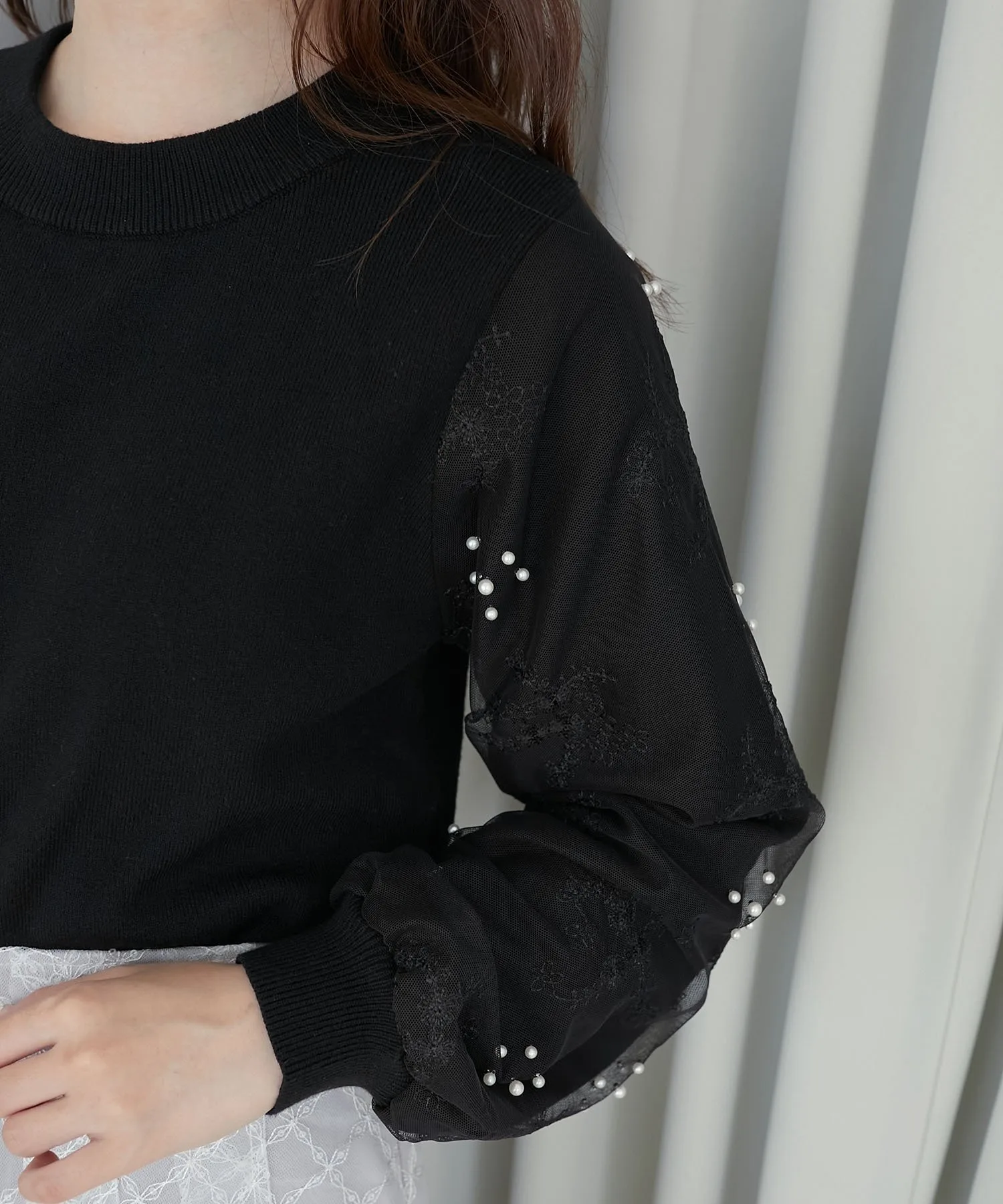 ※Состав немного отличается от модели 1047020205 Pearl Tulle Sleeve Knit, но это тот же продукт. *Пожалуйста, будьте осторожны с выцветанием и переносом цвета из-за трения или воды. *Пожалуйста, имейте в виду, что из-за особенностей материала может происходить образование катышков и ворса.