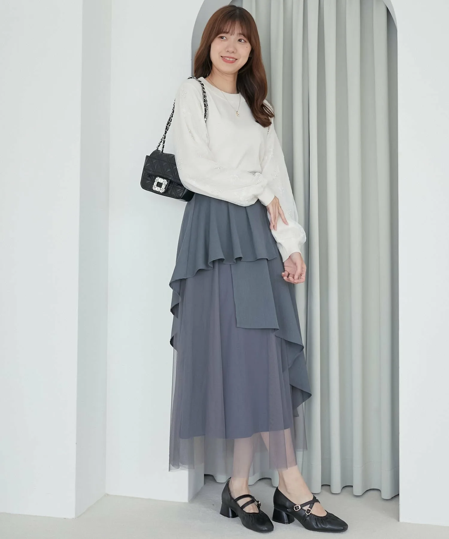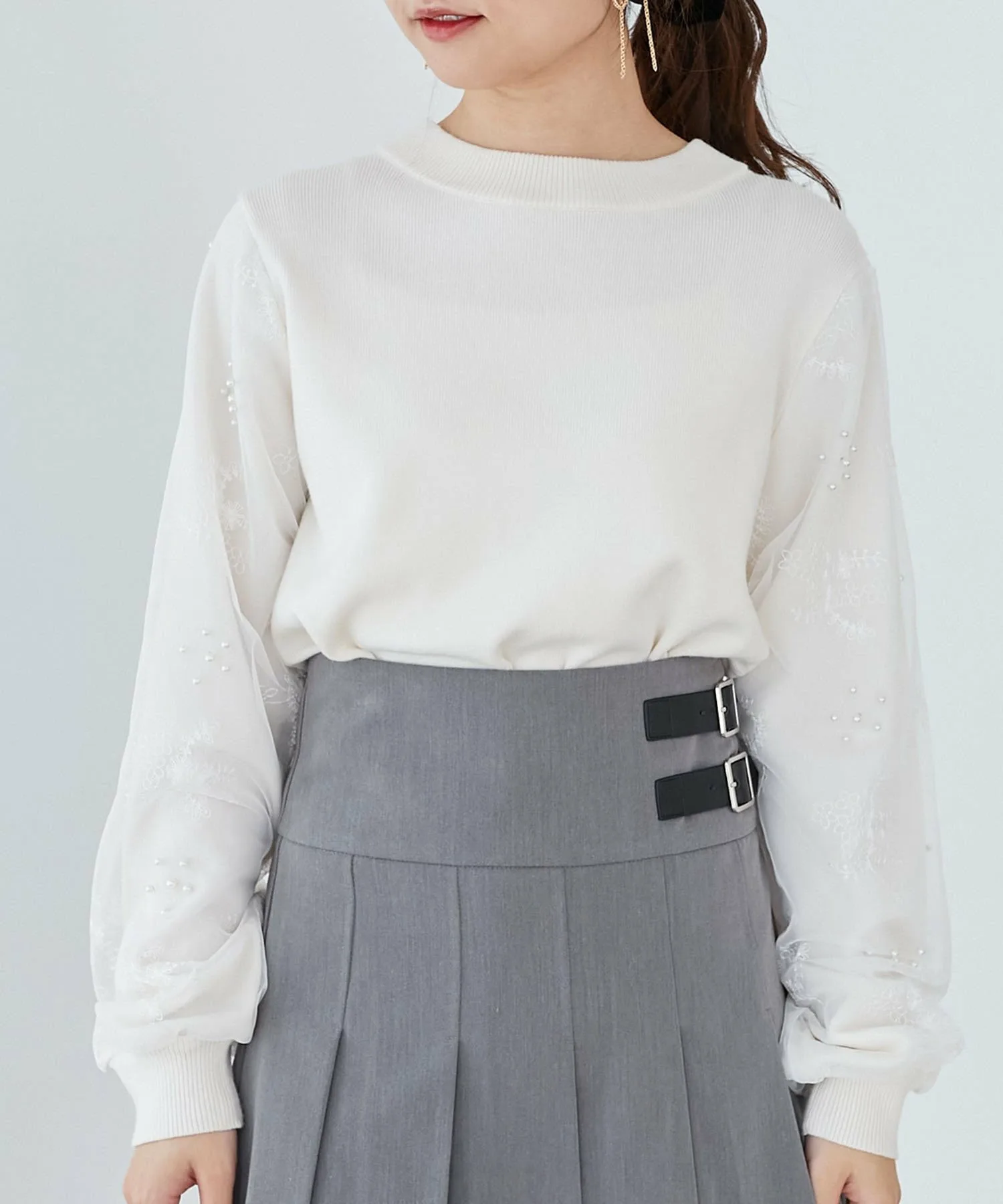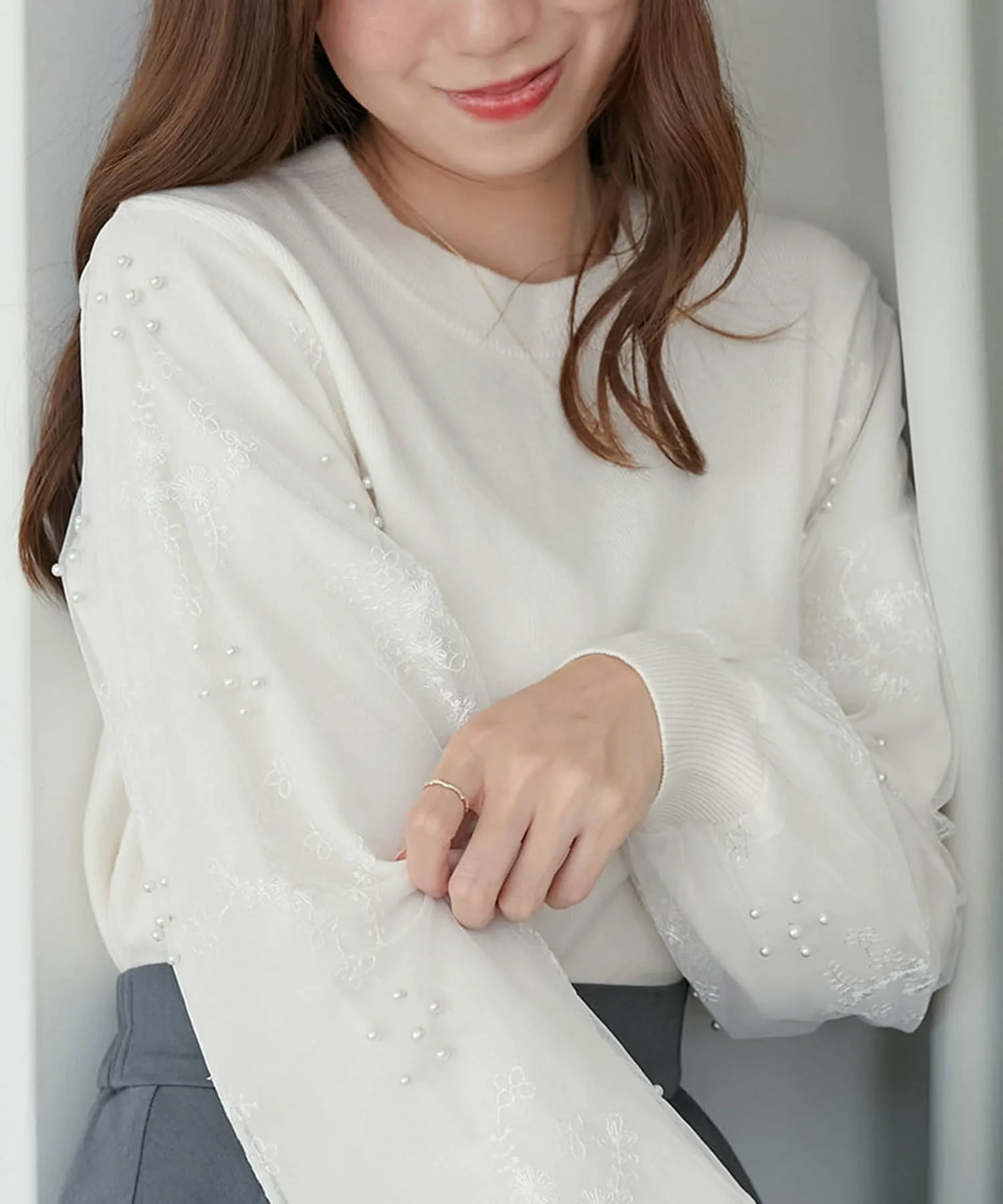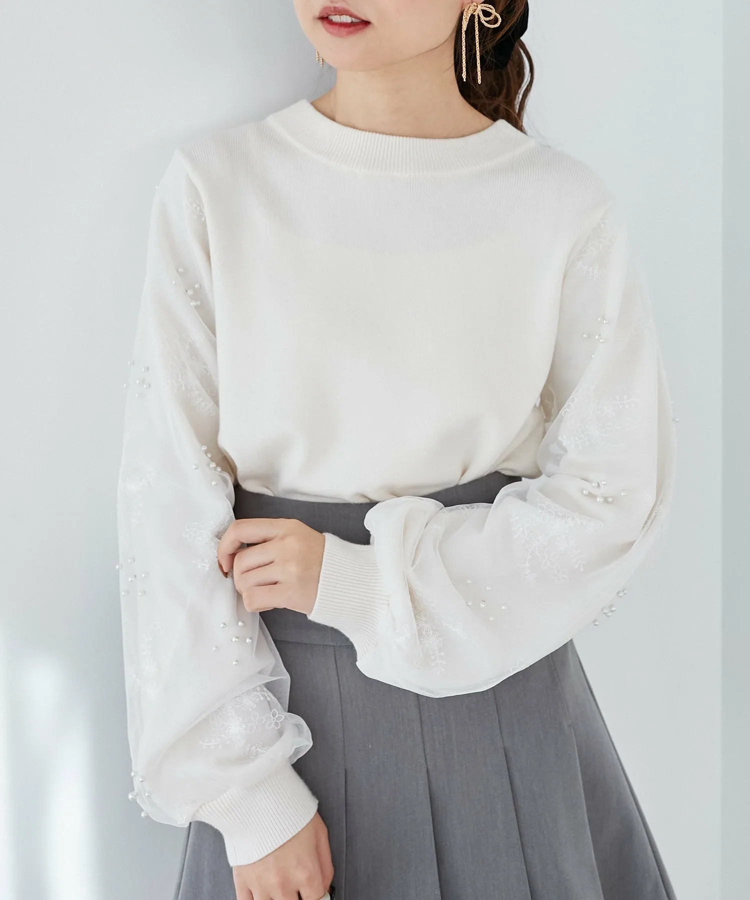 ※Состав немного отличается от модели 1047020205 Pearl Tulle Sleeve Knit, но это тот же продукт. *Пожалуйста, будьте осторожны с выцветанием и переносом цвета из-за трения или воды. *Пожалуйста, имейте в виду, что из-за особенностей материала может происходить образование катышков и ворса.