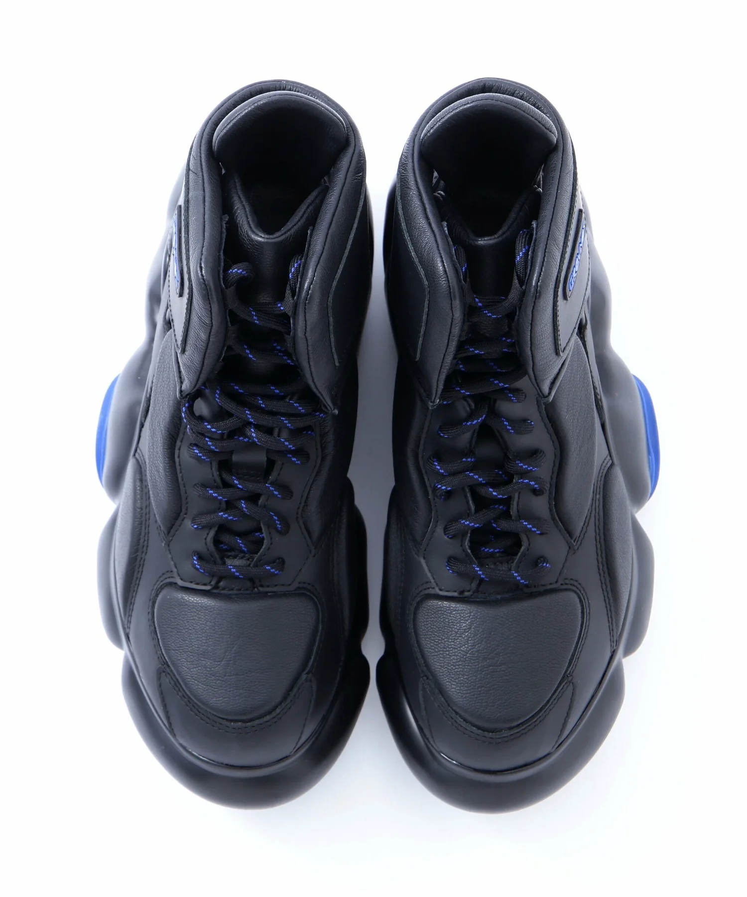 Шнурки (обычно черные с белым) заменены на черные с синим, а логотип бренда также стал синим.