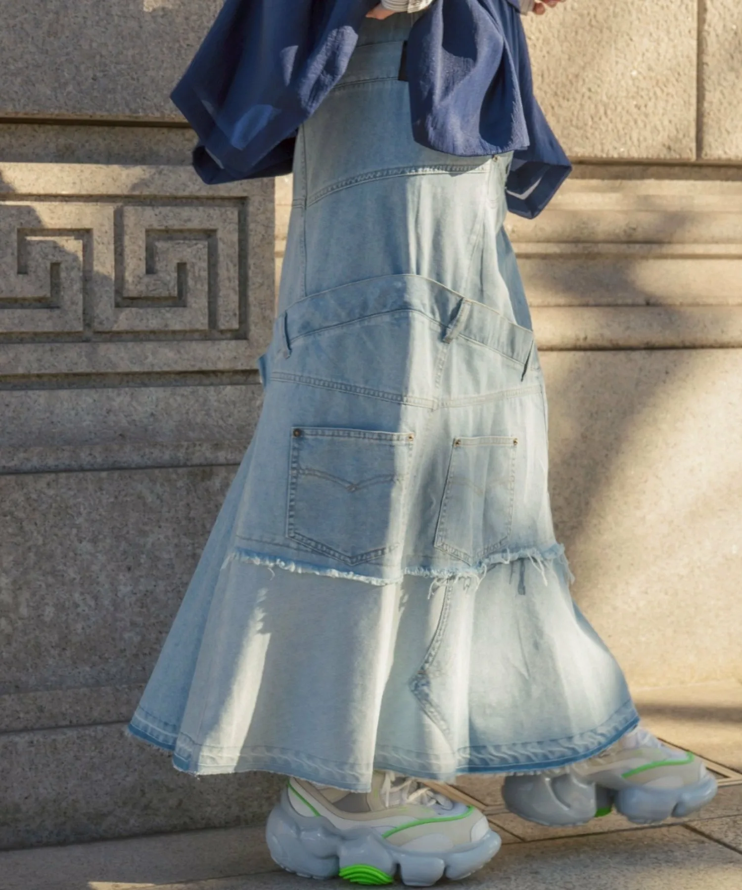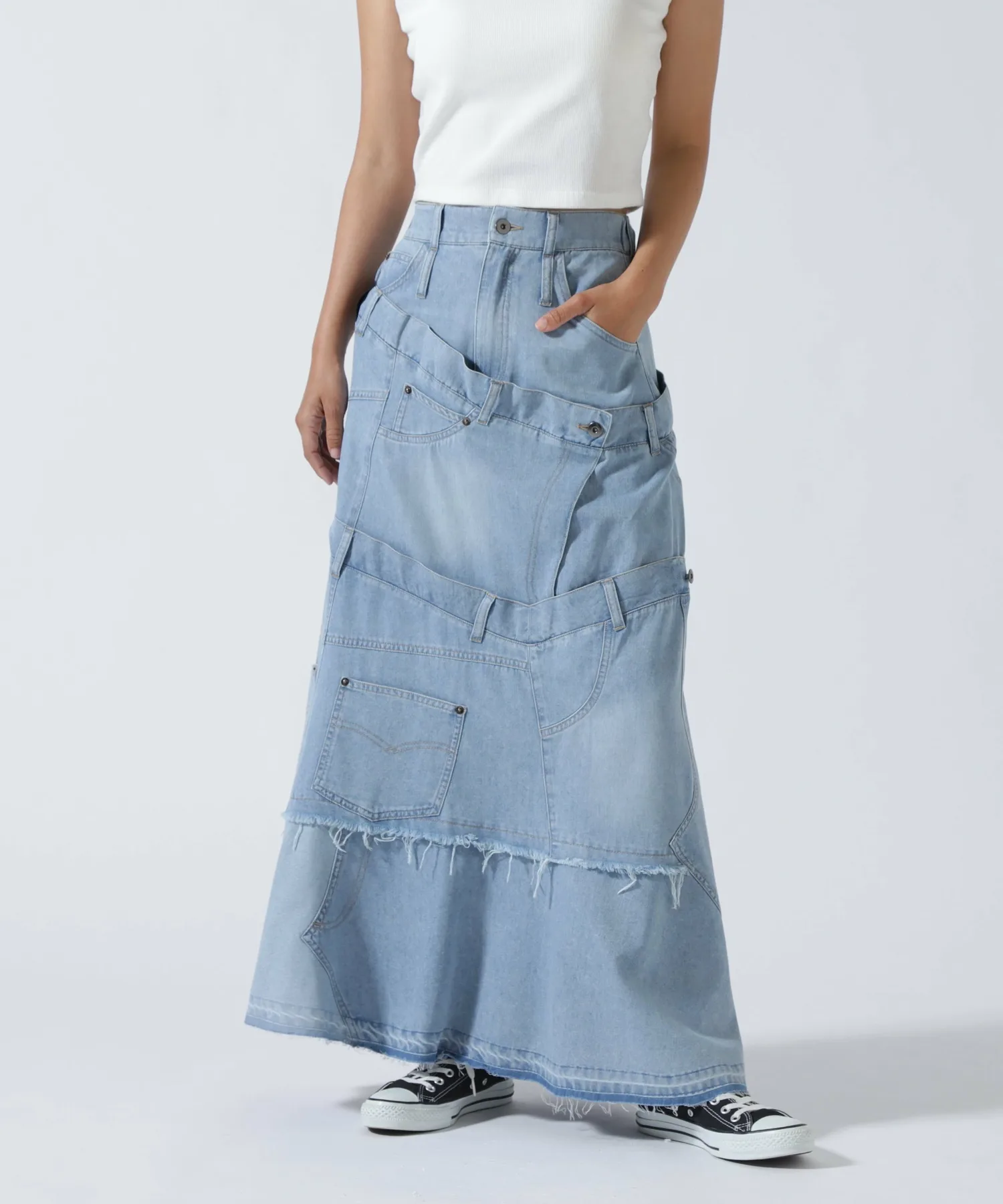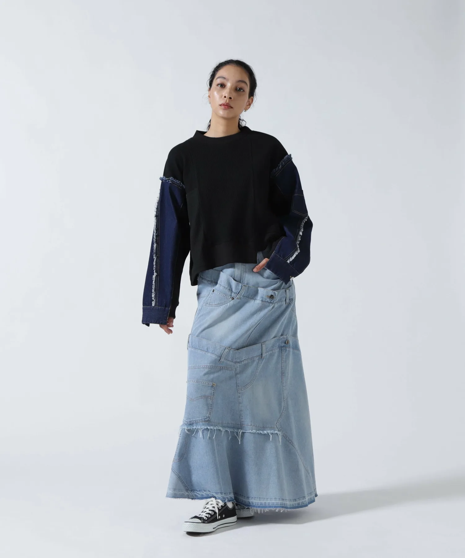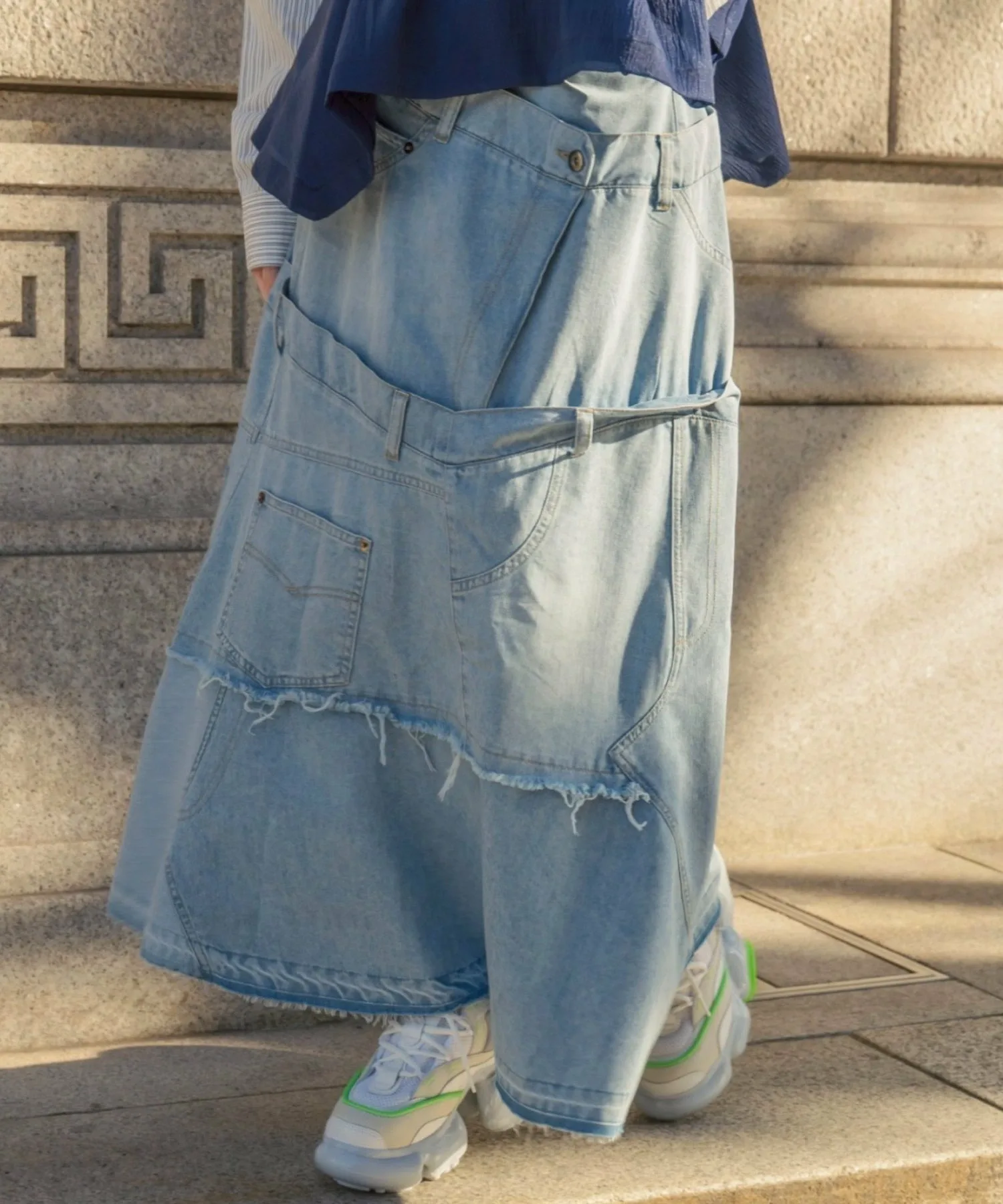 Эта юбка в новом стиле, соединенная спереди и сзади, имеет привлекательный дизайн, создающий впечатление, будто четыре юбки наложены друг на друга.