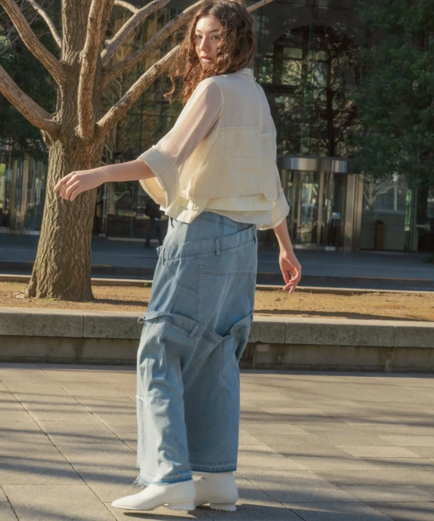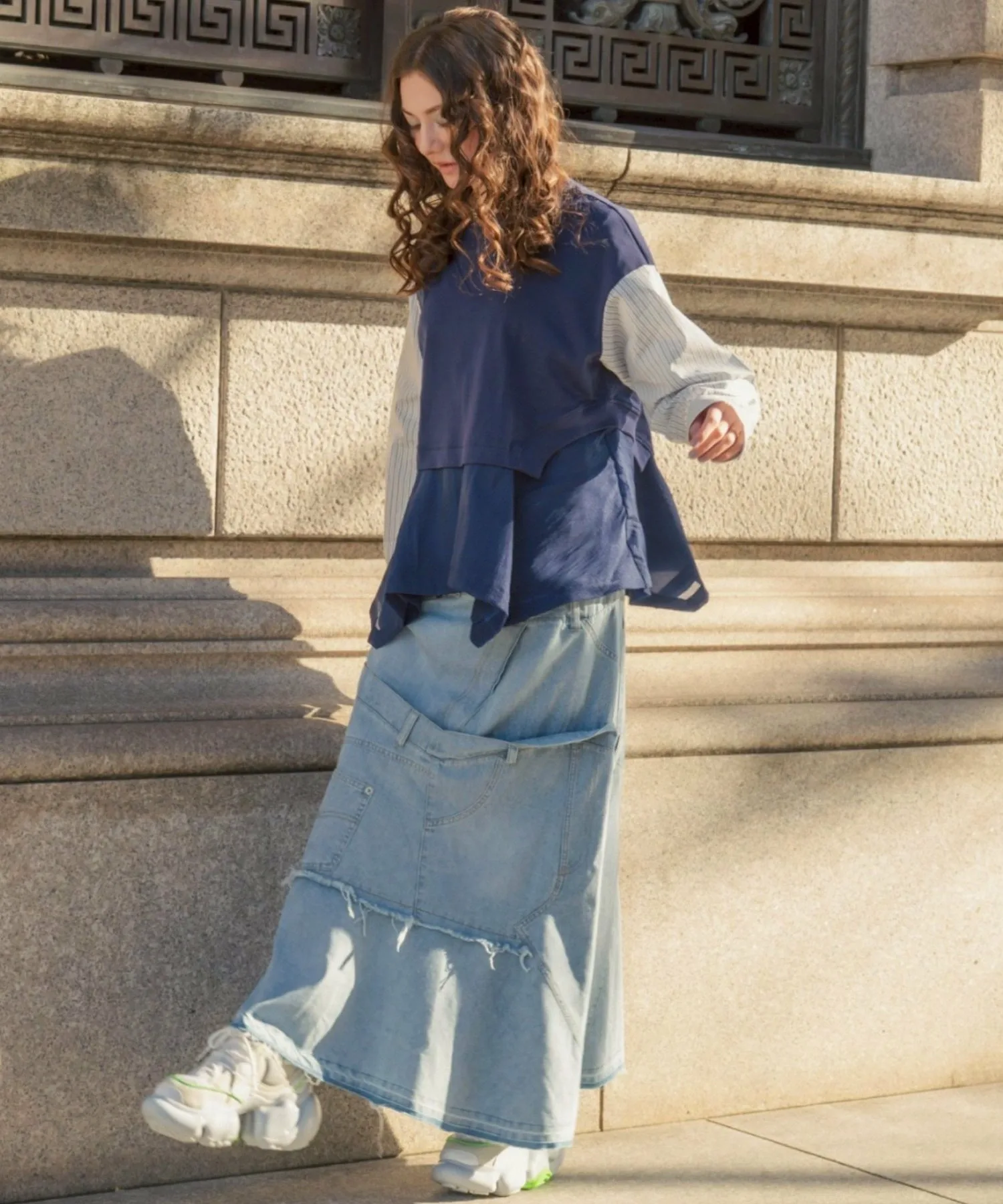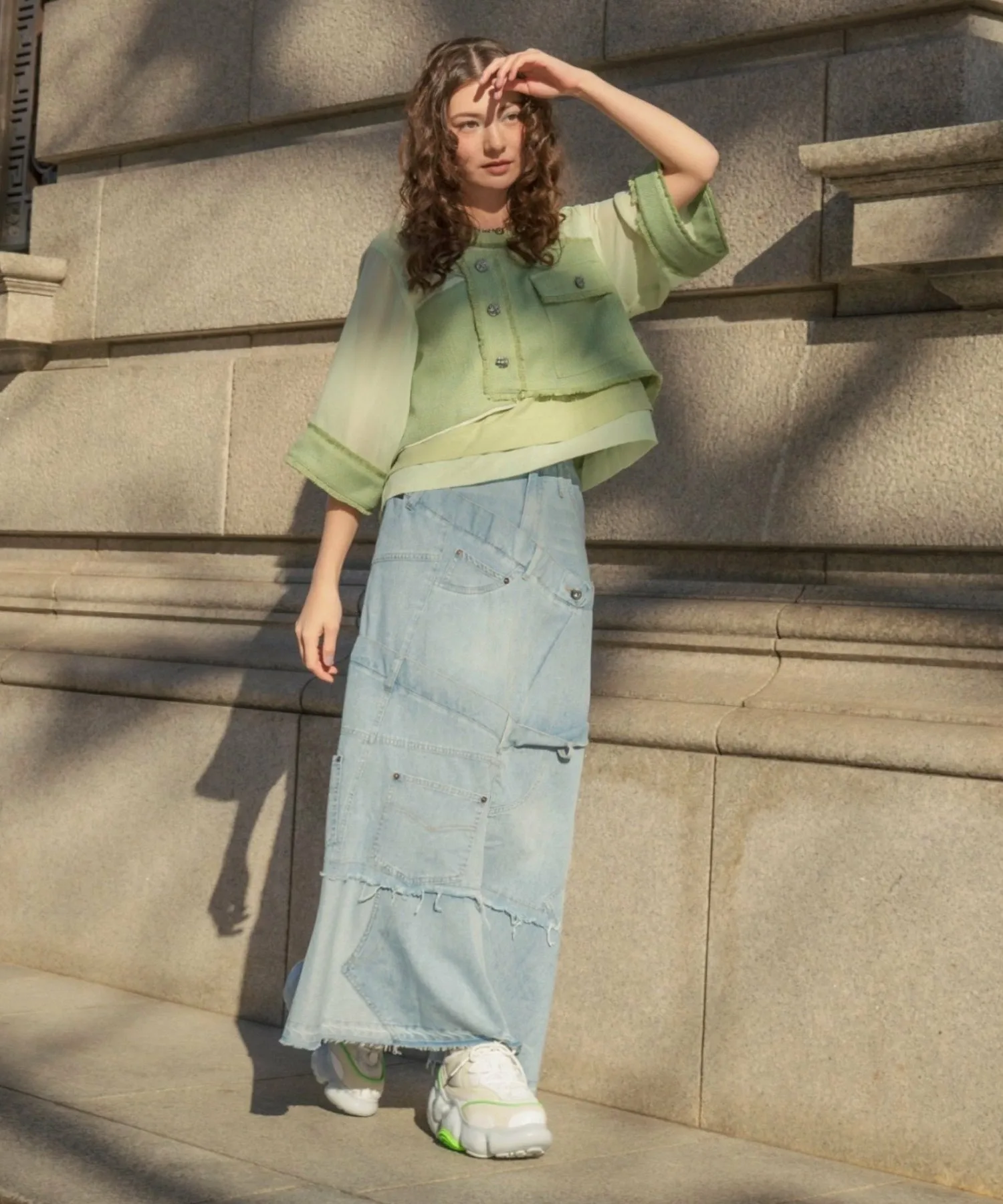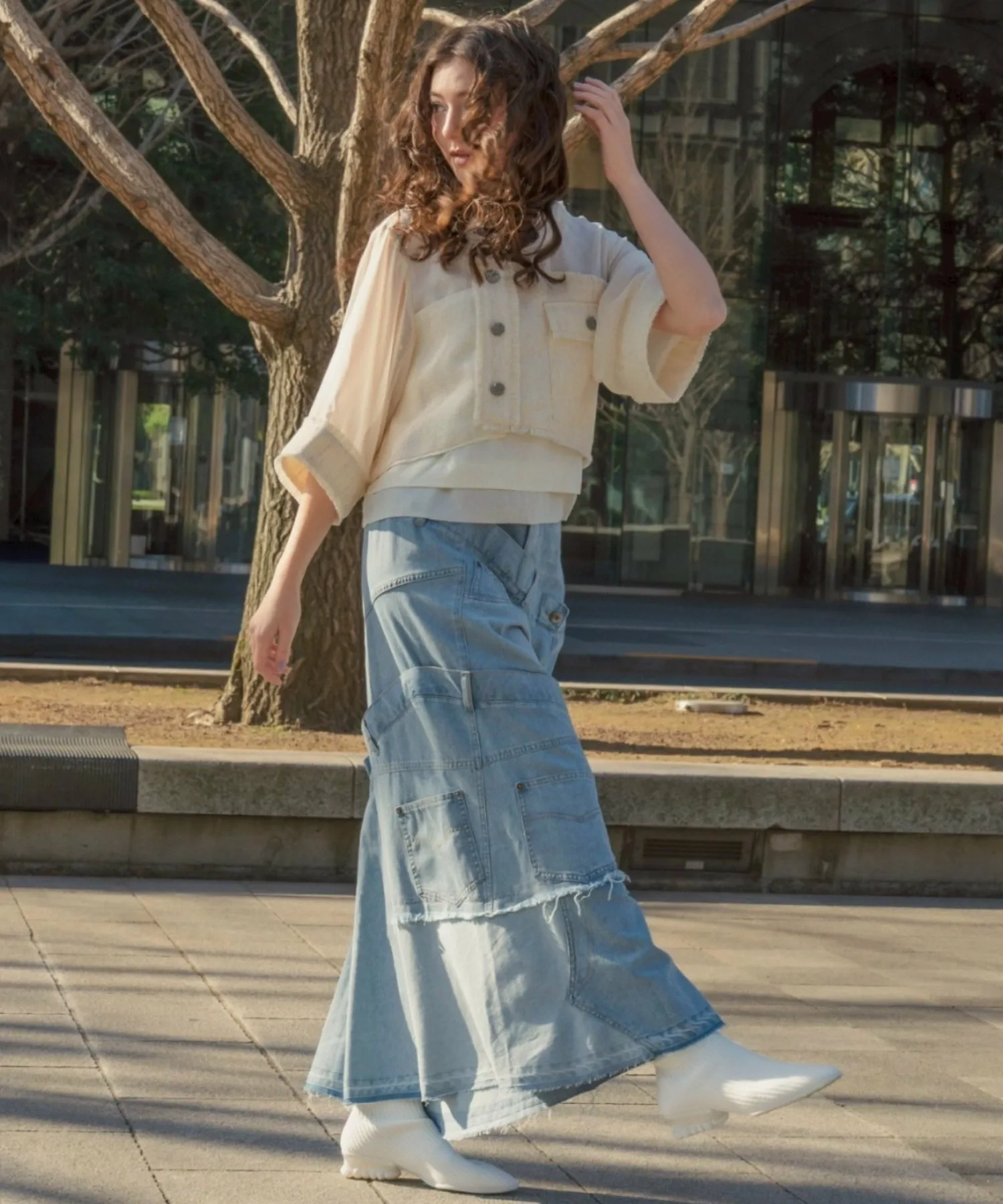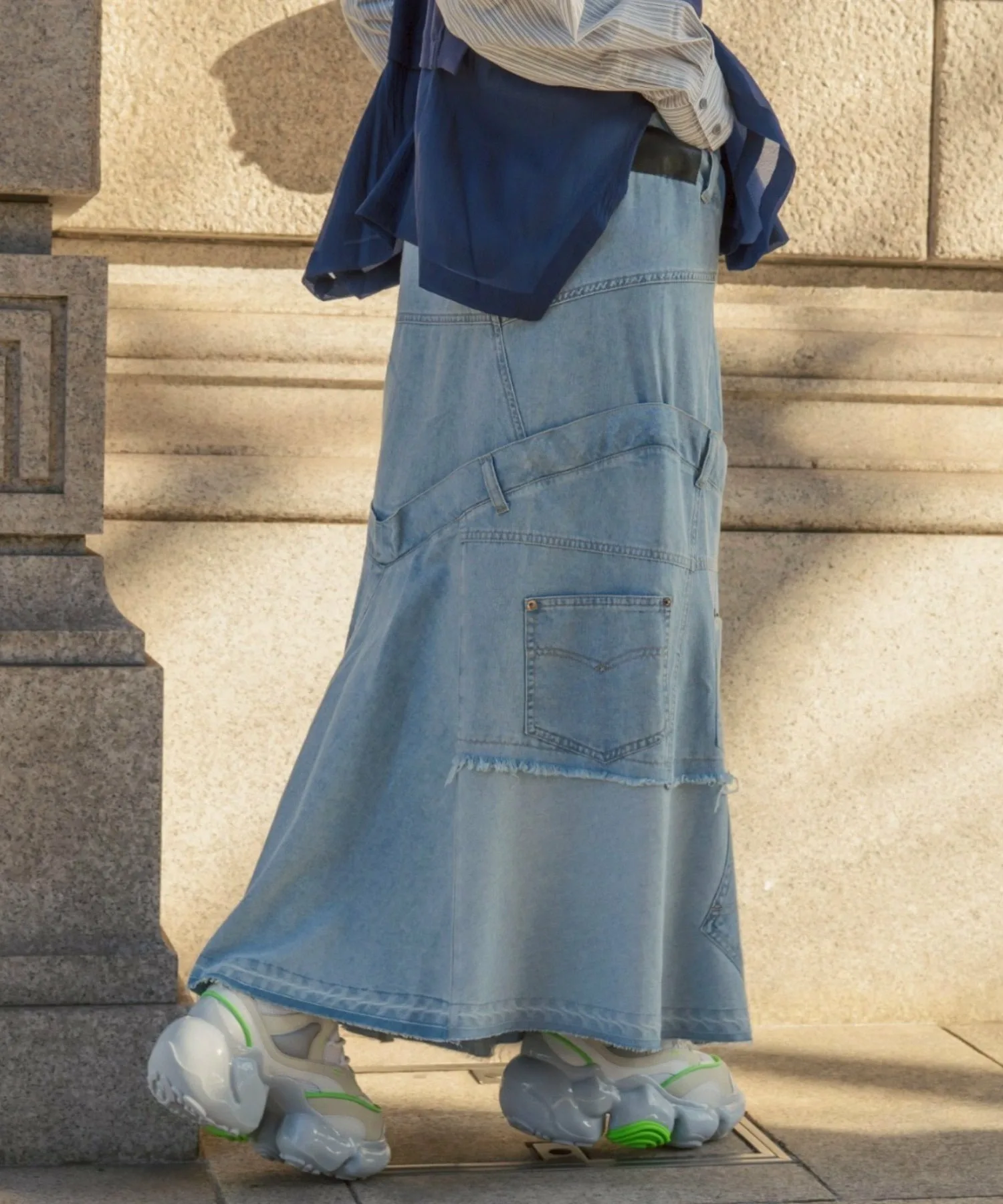 Эта юбка в новом стиле, соединенная спереди и сзади, имеет привлекательный дизайн, создающий впечатление, будто четыре юбки наложены друг на друга.