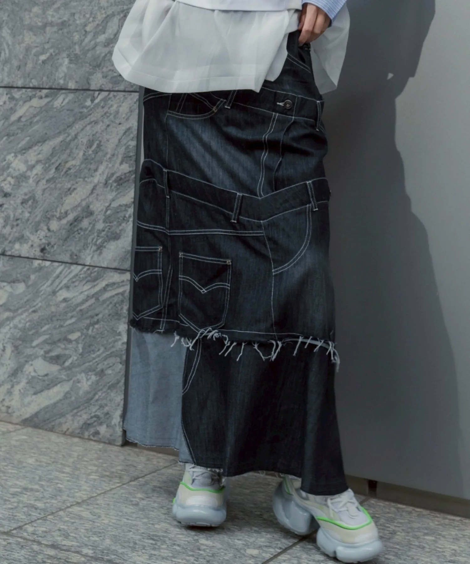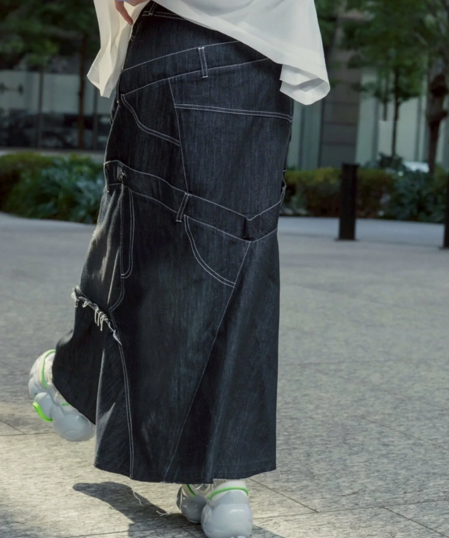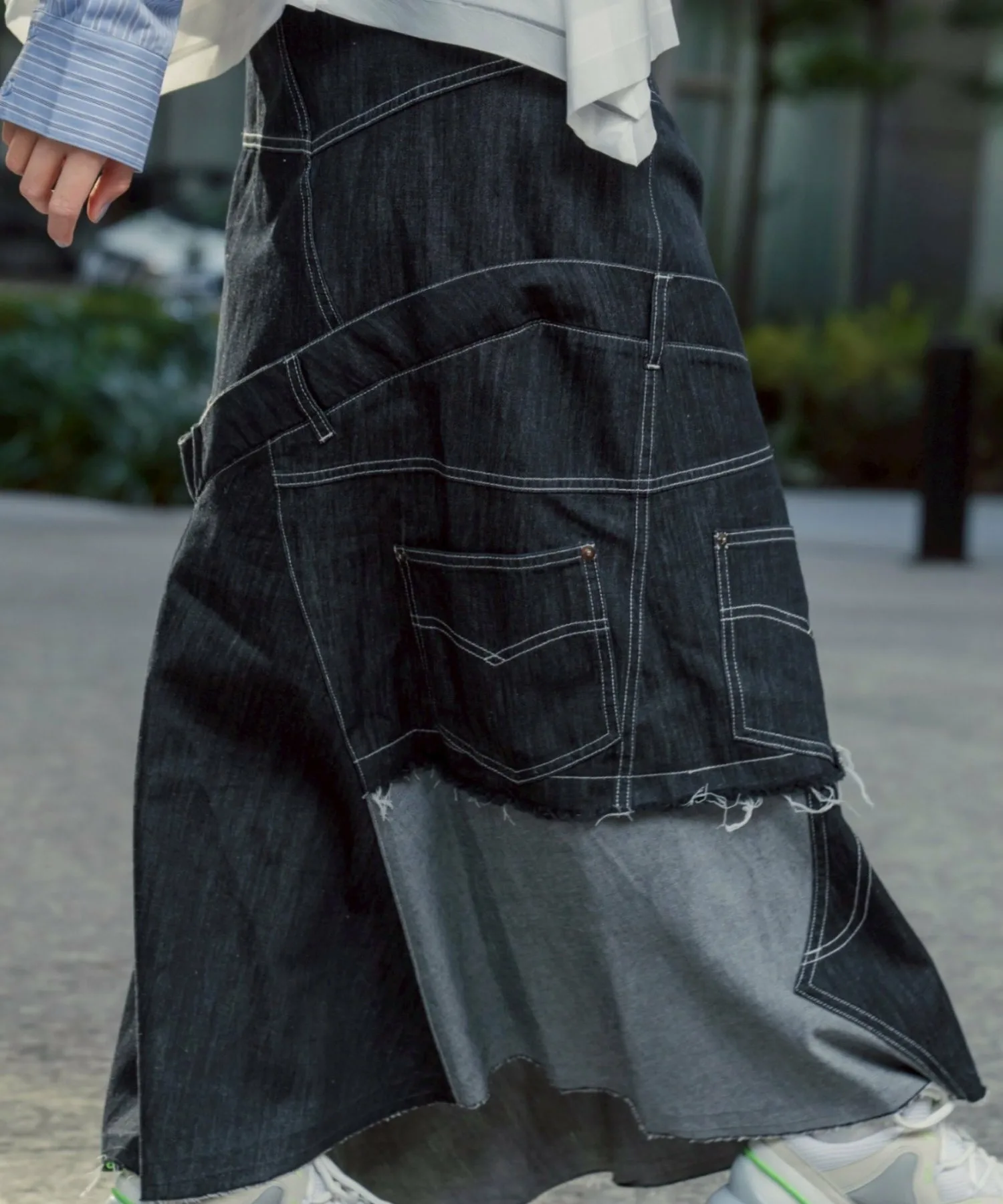 Эта юбка в новом стиле, соединенная спереди и сзади, имеет привлекательный дизайн, создающий впечатление, будто четыре юбки наложены друг на друга.