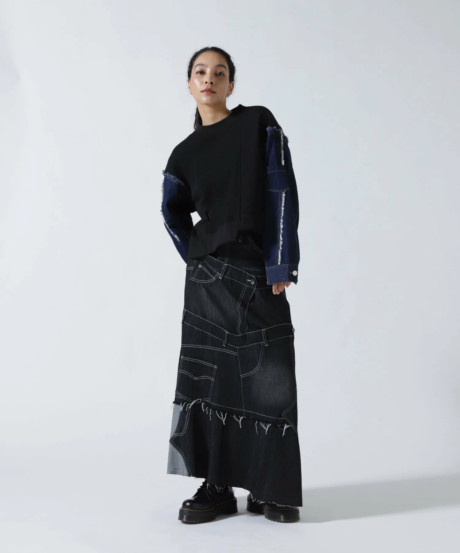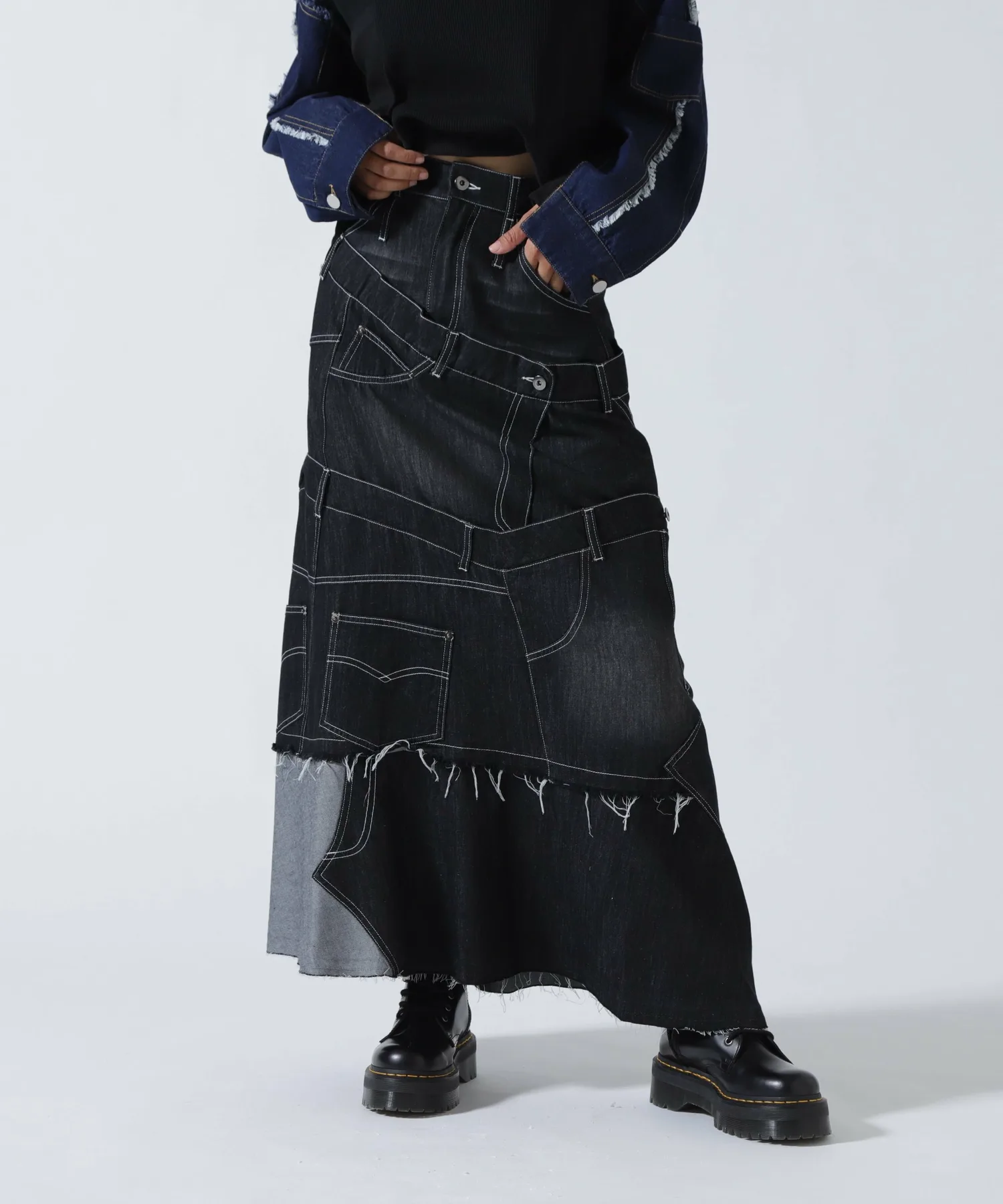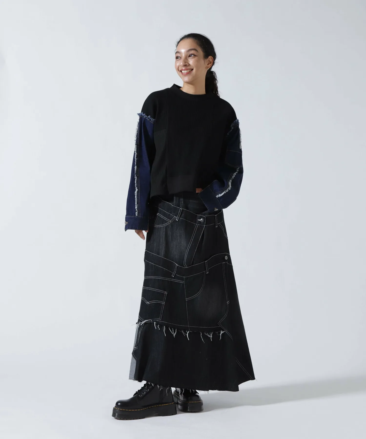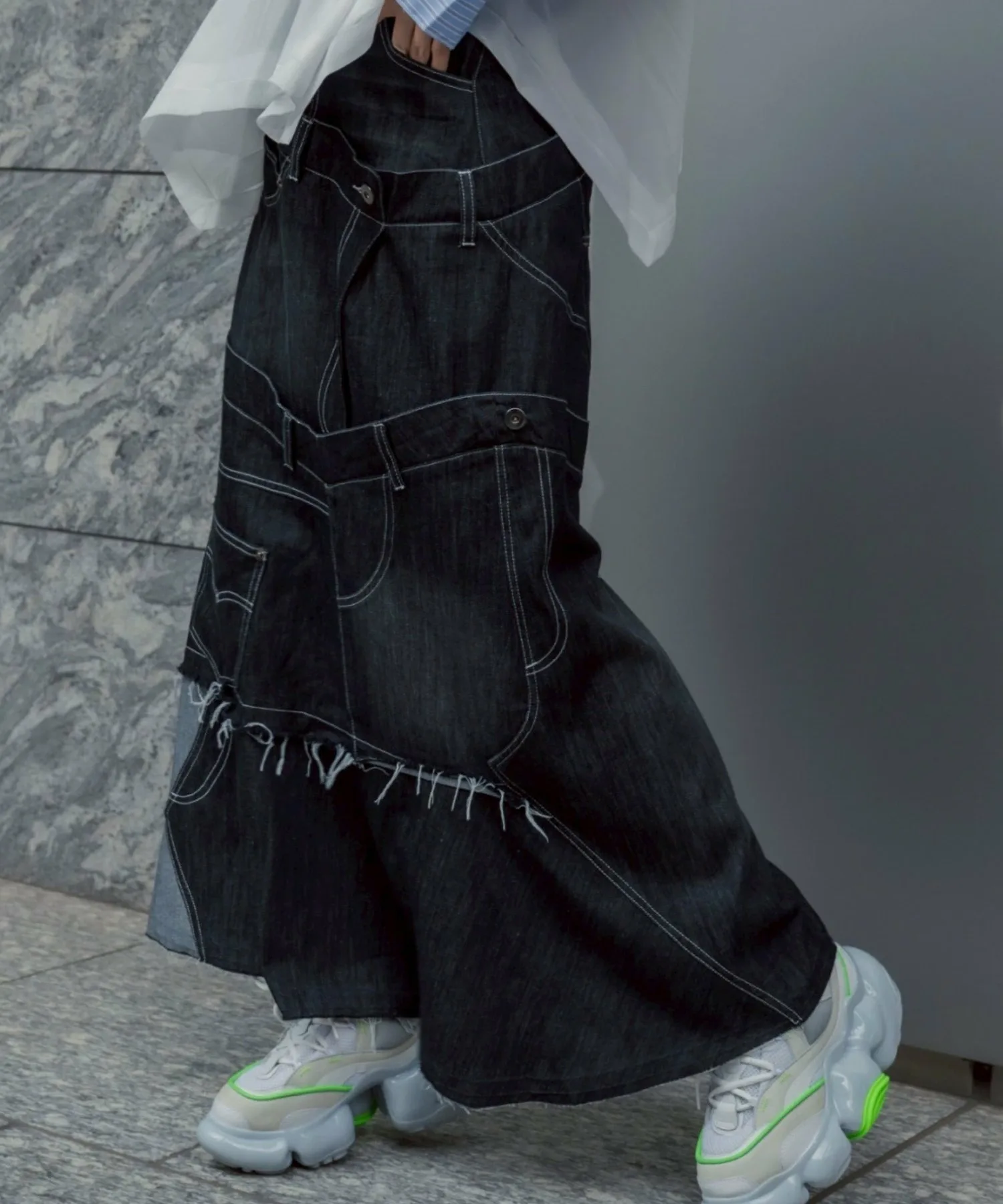 Эта юбка в новом стиле, соединенная спереди и сзади, имеет привлекательный дизайн, создающий впечатление, будто четыре юбки наложены друг на друга.