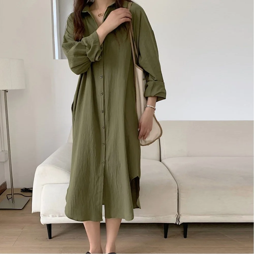 Женское длинное платье в корейском стиле, однотонное, стильная верхняя одежда, подчеркивает фигуру, с открытым передом, длинная рубашка, длинные рукава.