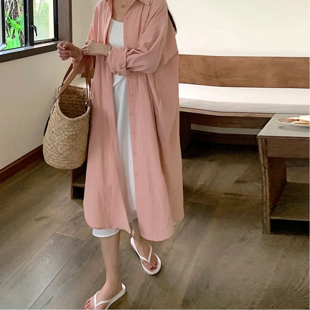 Женское длинное платье в корейском стиле, однотонное, стильная верхняя одежда, подчеркивает фигуру, с открытым передом, длинная рубашка, длинные рукава.
