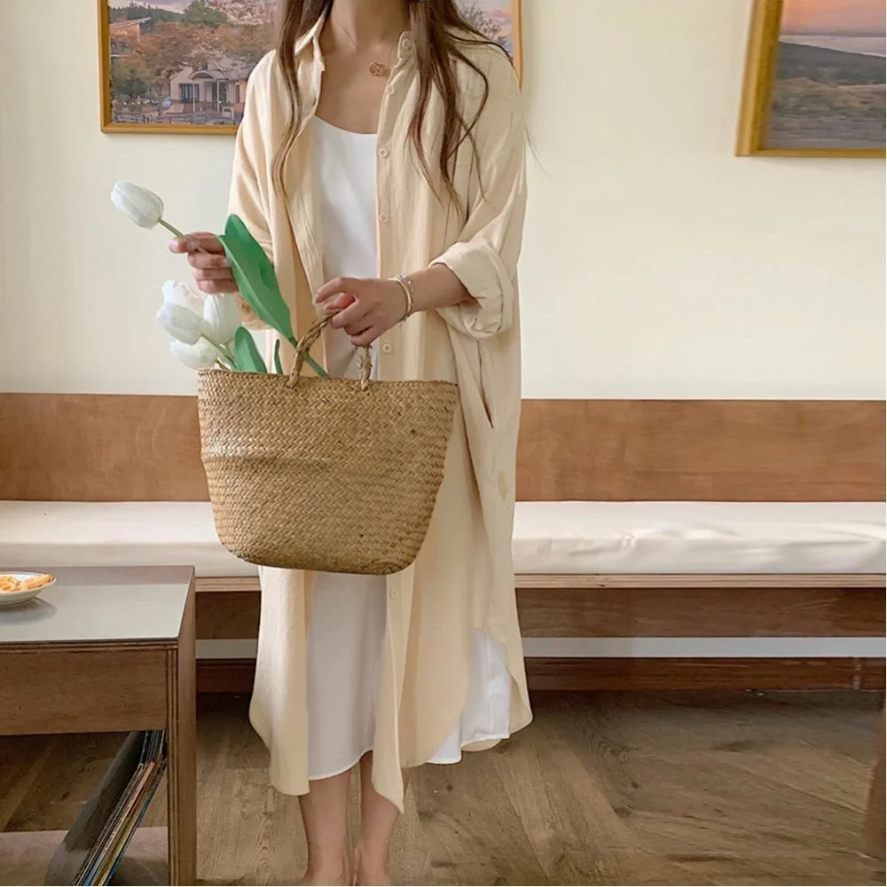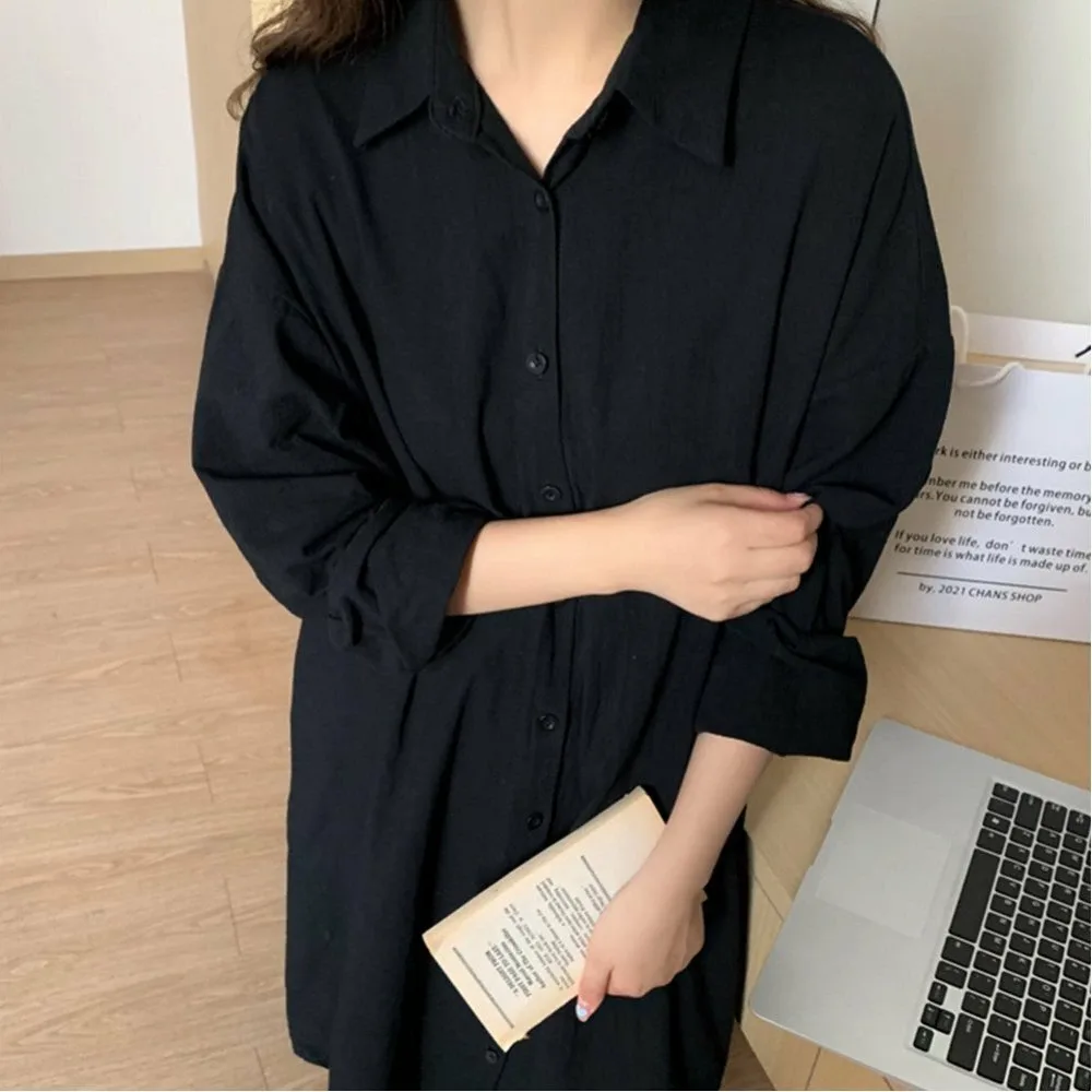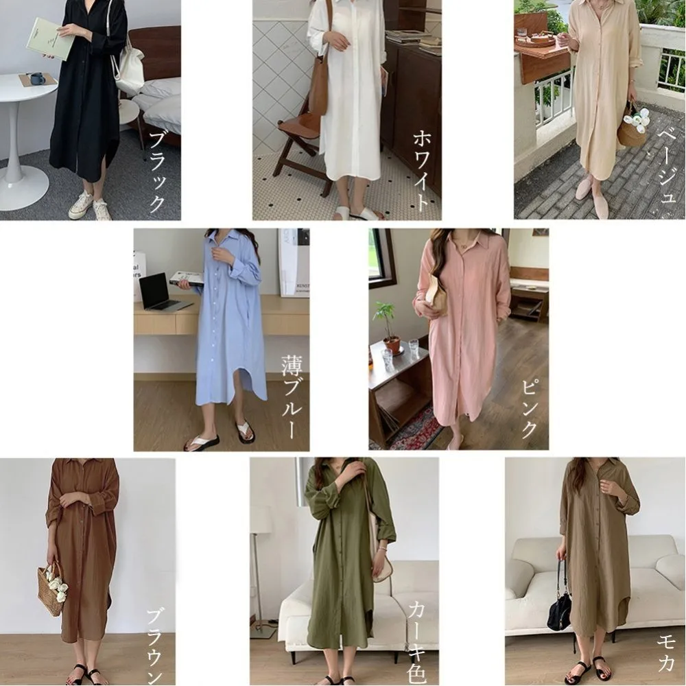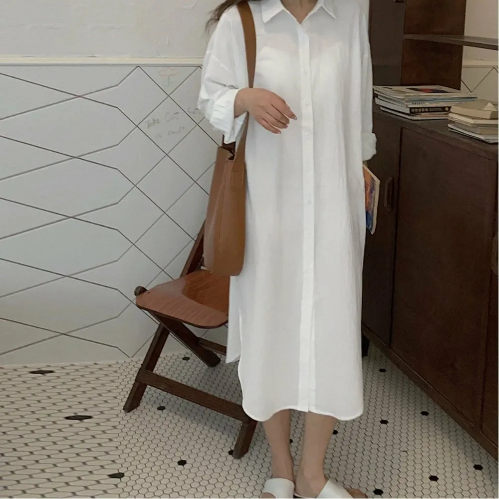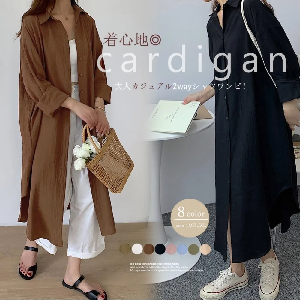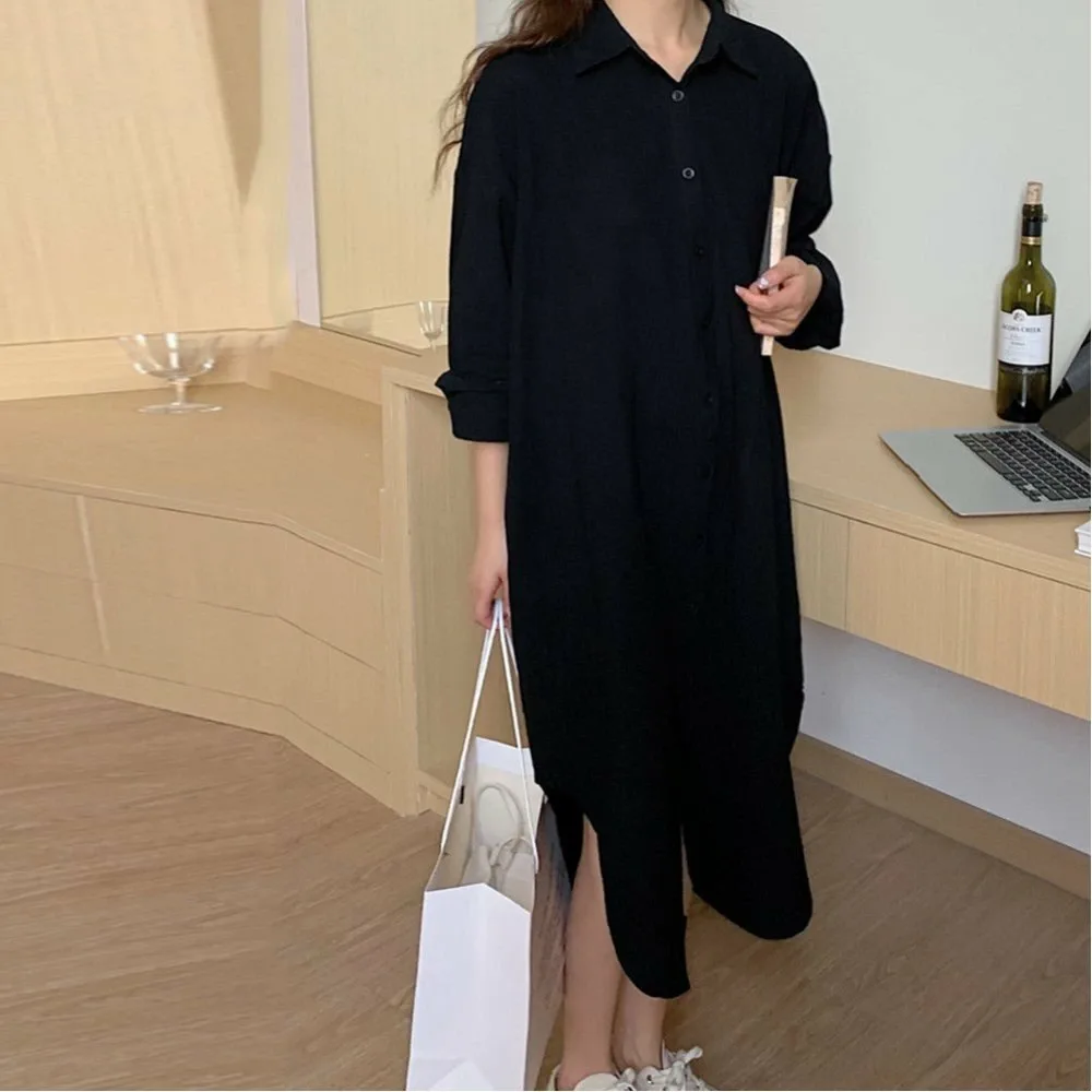 Женское длинное платье в корейском стиле, однотонное, стильная верхняя одежда, подчеркивает фигуру, с открытым передом, длинная рубашка, длинные рукава.