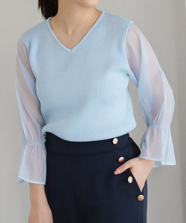 Трикотажное платье с V-образным вырезом и прозрачными рукавами-«конфетками», создающее зрелый, женственный образ.