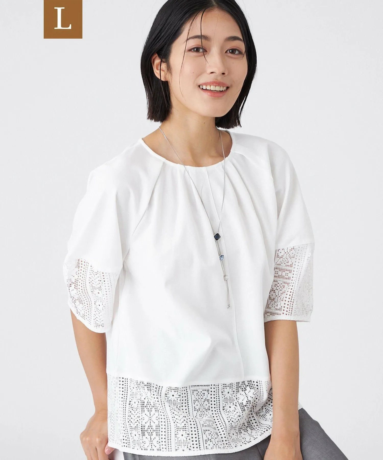 Этот пуловер из смешанных материалов украшен прозрачными кружевными вставками. Воздушный силуэт рукавов и заправленный воротник создают трехмерную, структурированную форму. Это стильная вещь, которая потрясающе выглядит сама по себе и идеально подходит для летнего отдыха.