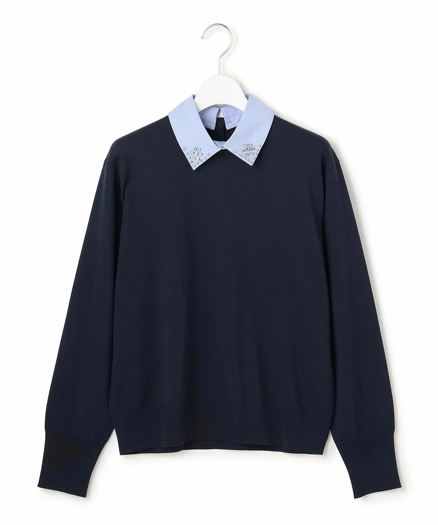Этот вязаный пуловер имеет тканый воротник, благодаря которому кажется, что под ним надета блузка. Кончик воротника украшен изящными драгоценными камнями, добавляя образу гламура. Воротник отстегивается, что делает свитер универсальным, его можно носить и как простой свитер с круглым вырезом. Основная часть выполнена из трикотажа с эластичной пряжей для комфорта. Спинка легко открывается и закрывается, что облегчает надевание и снимание. Идеально подходит для офиса: сочетайте его с джинсами для более повседневного образа или с красивой юбкой для званого ужина. Создайте элегантный стиль для самых разных случаев. Доступен в трех цветах: шикарный черный (#005), освежающий небесно-голубой (#072) и интеллектуальный темно-синий (#075). Черный и небесно-голубой имеют чистый бело-кремовый воротник, а темно-синий — освежающий воротник цвета саксофона.