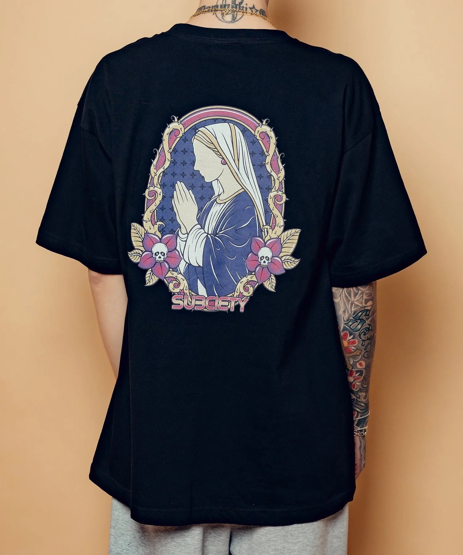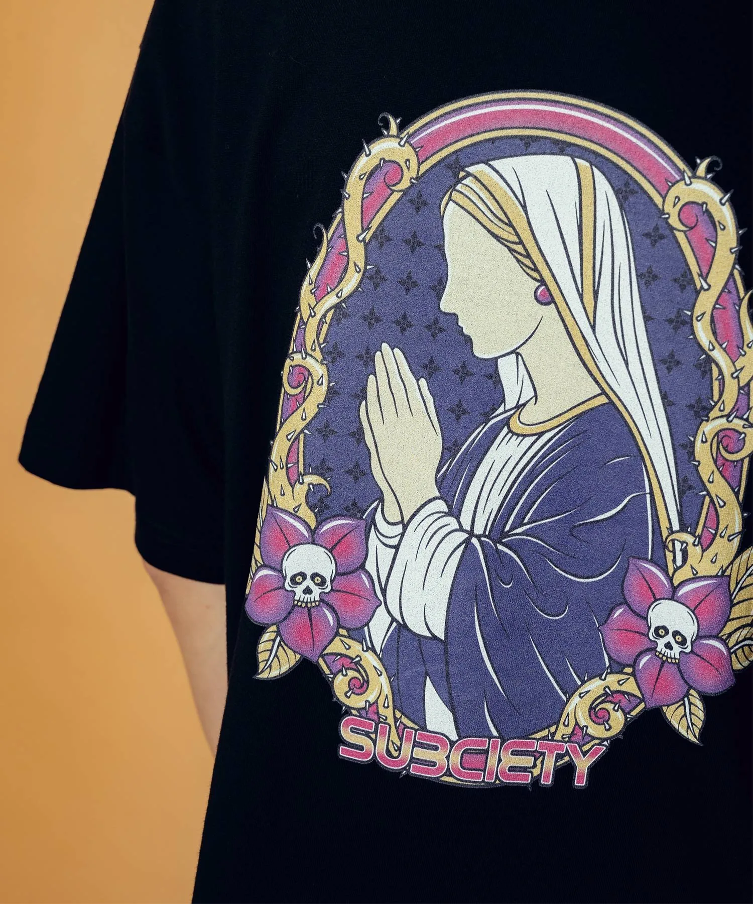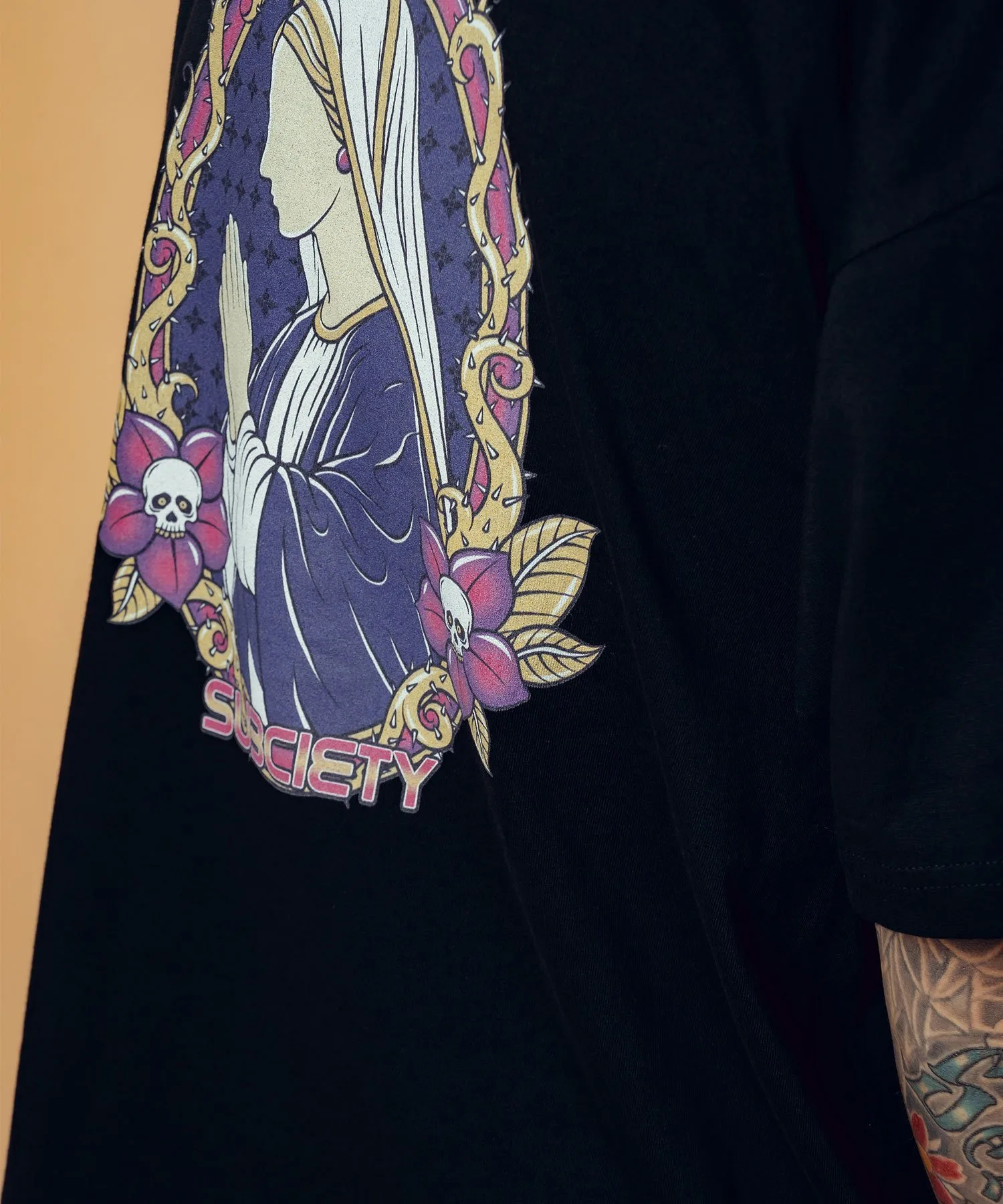 На левой стороне груди напечатан графический рисунок, сочетающий логотип бренда, цветы-черепы и шипы.