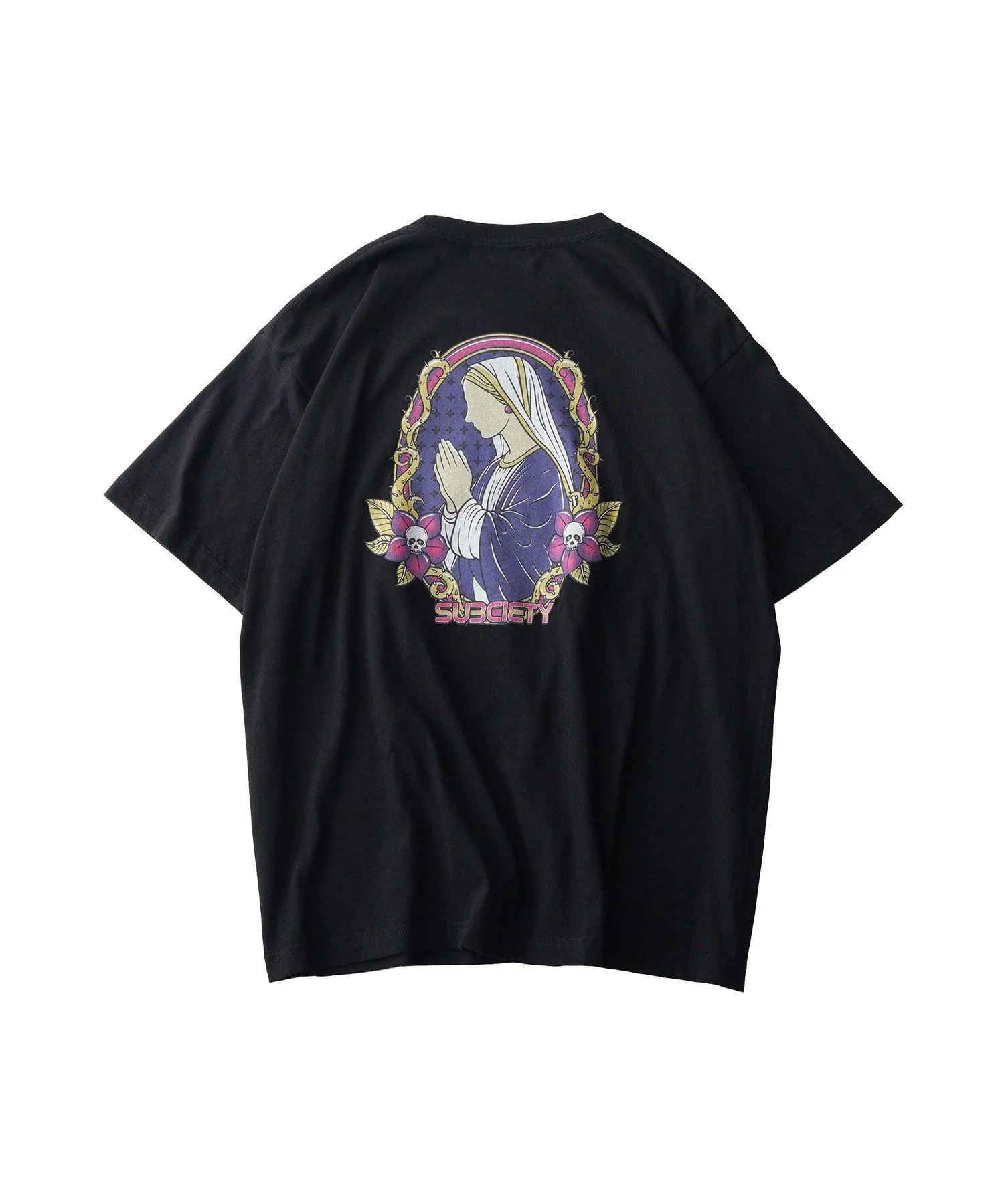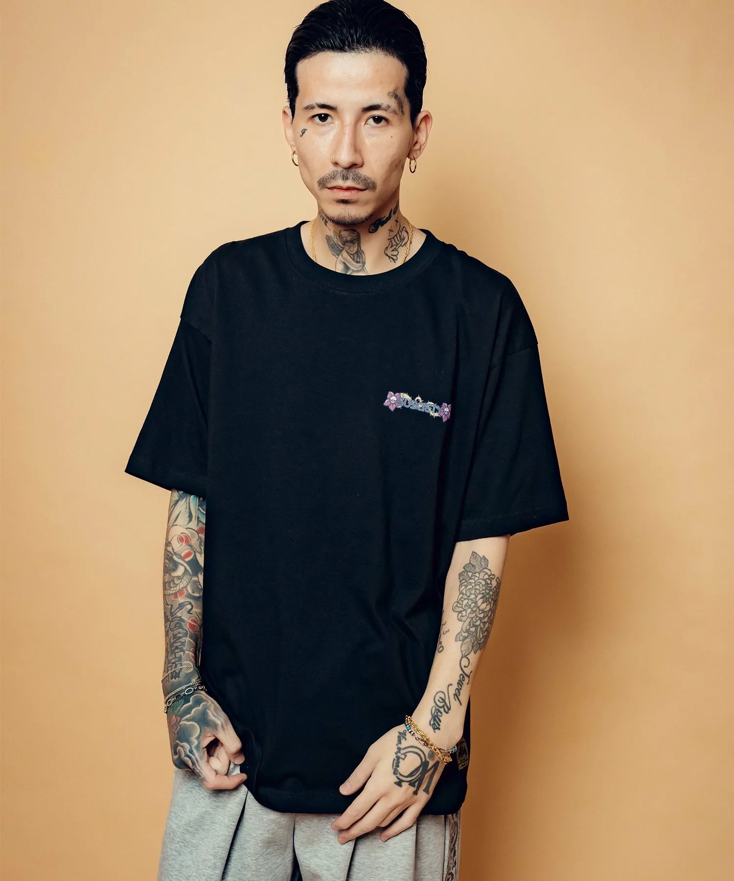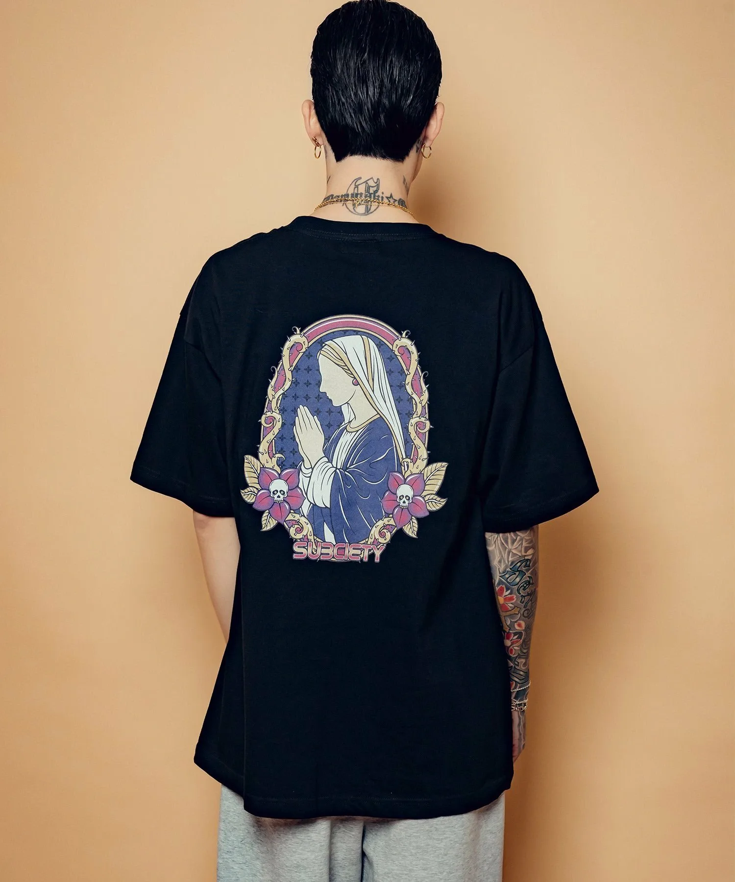 На левой стороне груди напечатан графический рисунок, сочетающий логотип бренда, цветы-черепы и шипы.