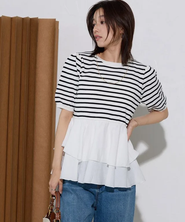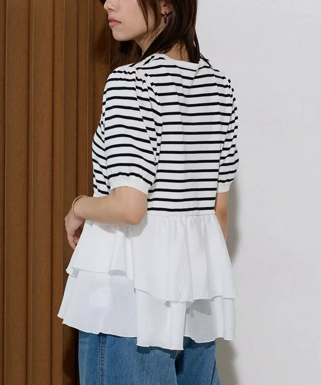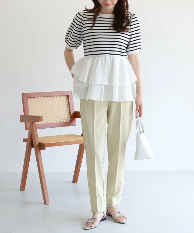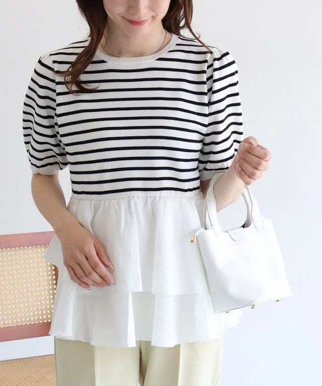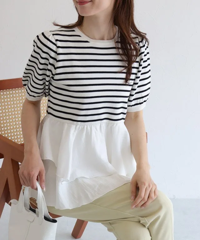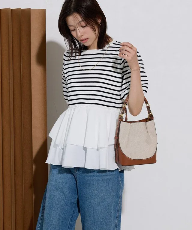 Основа выполнена из мягкого трикотажного материала на основе вискозы, а полосатый узор придает ему солидный, повседневный вид. Нижний край отделан гладкой тканью, а использование разных материалов создает неповторимый стиль.