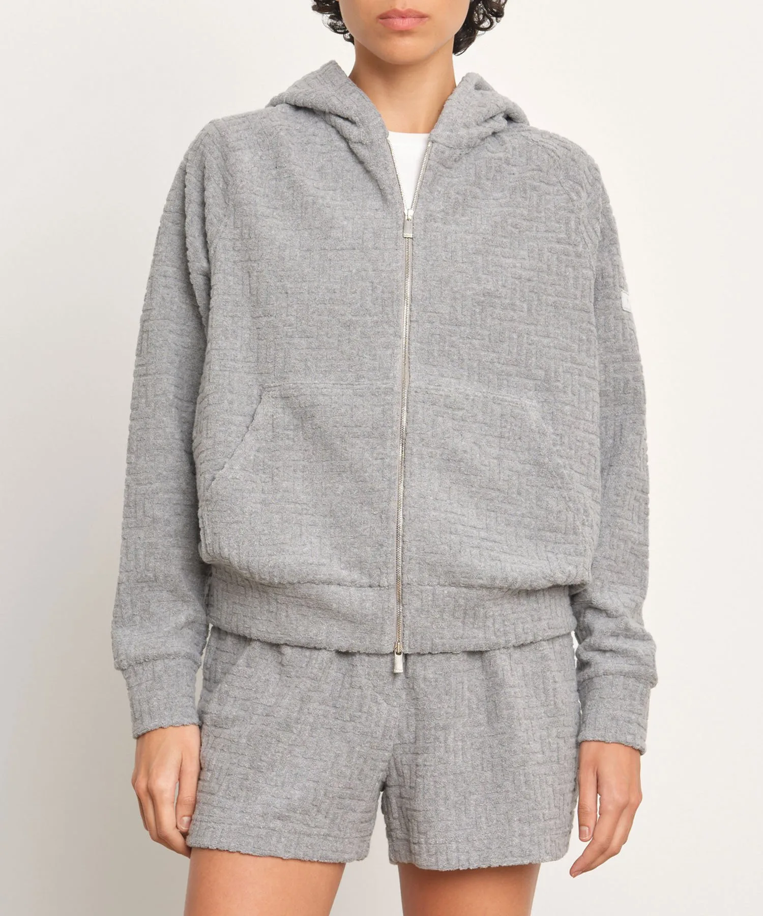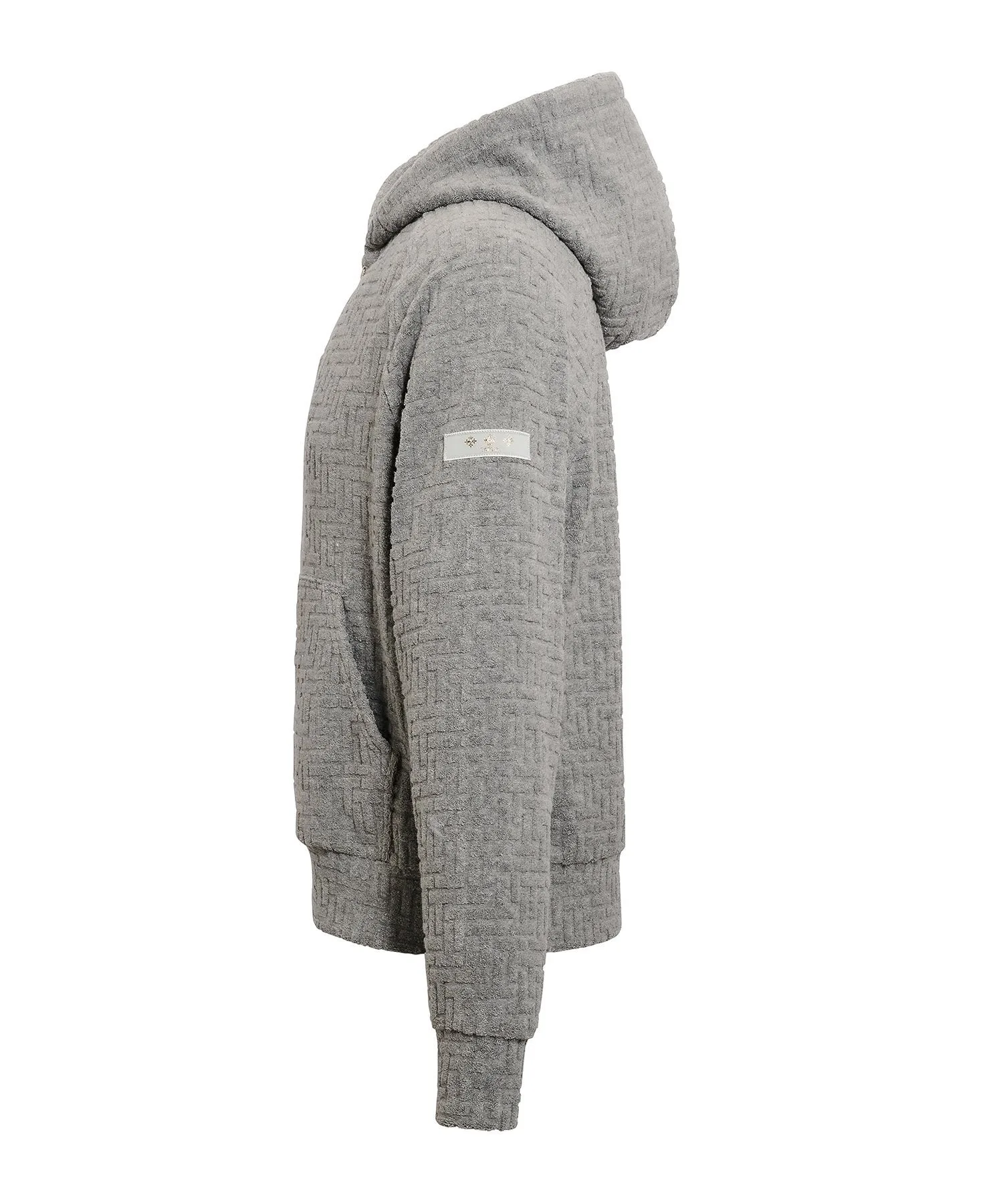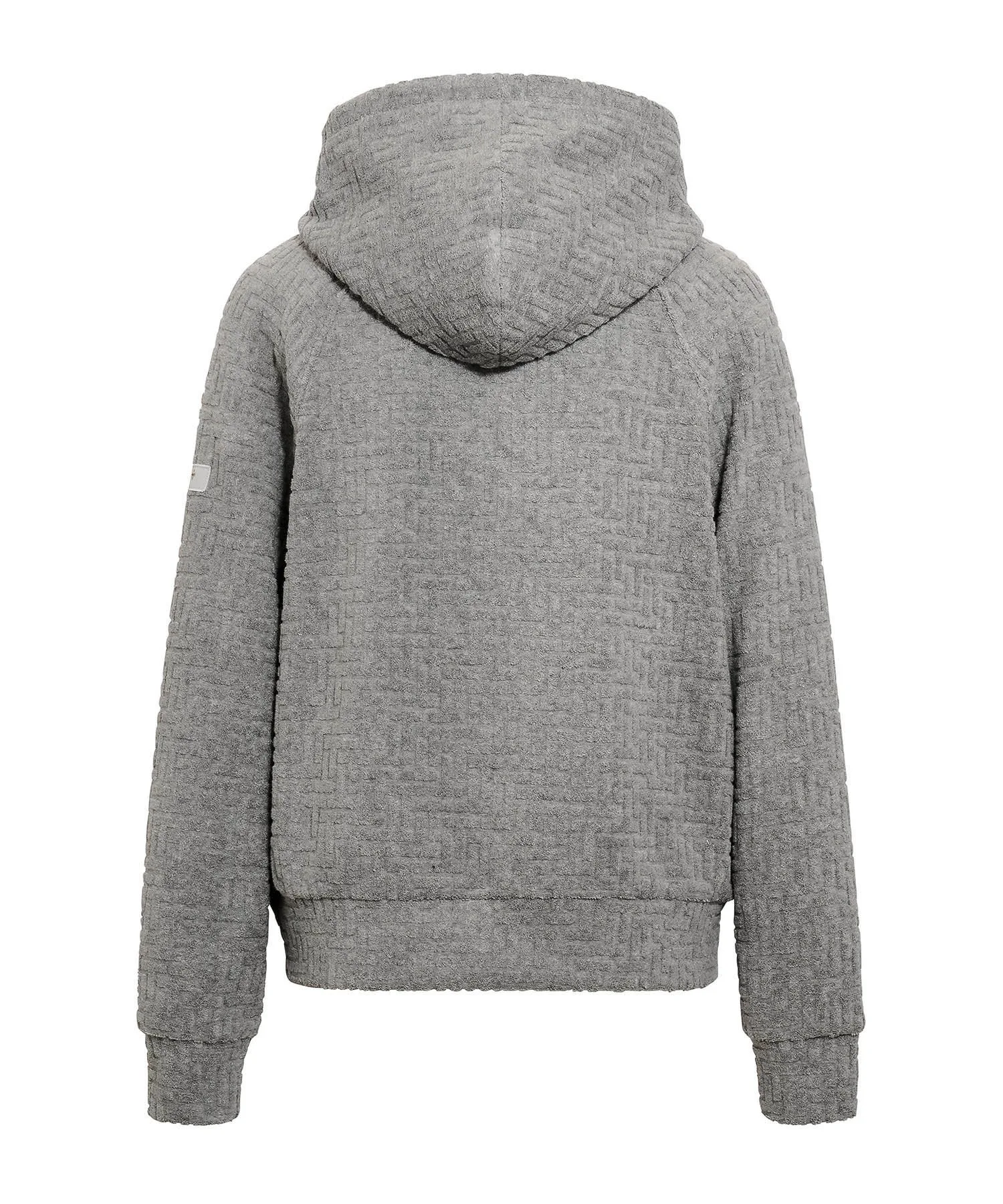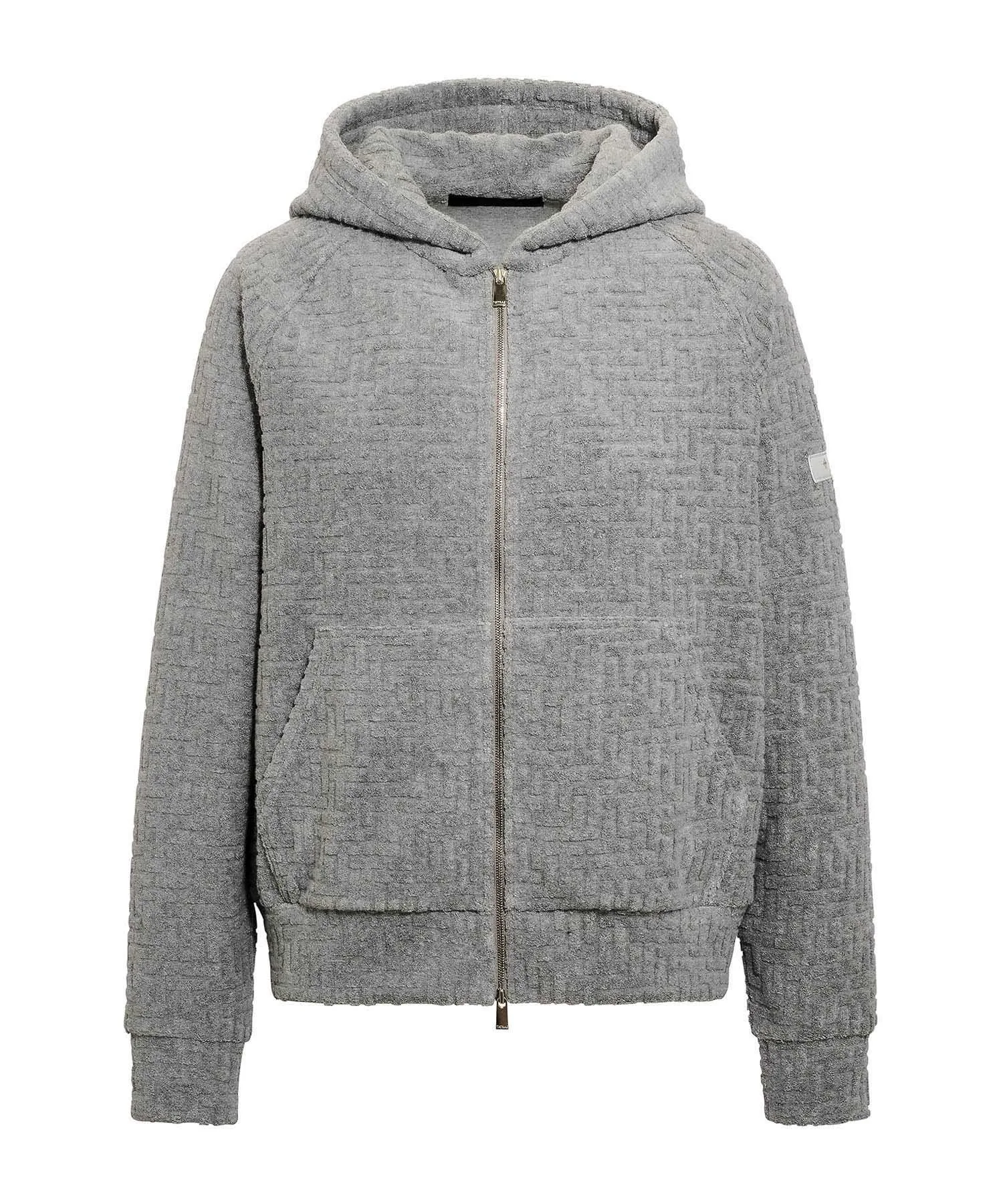 TATRAS BIANCA — повседневная толстовка с объемным жаккардовым монограммным узором. Подкладка выполнена из эластичного, влагоотводящего и быстросохнущего полиэстера для комфортной посадки. Рукава реглан обеспечивают свободу движений. Изящная металлическая молния добавляет нотку роскоши. Манжеты и нижний край контрастируют, создавая эффектный силуэт.