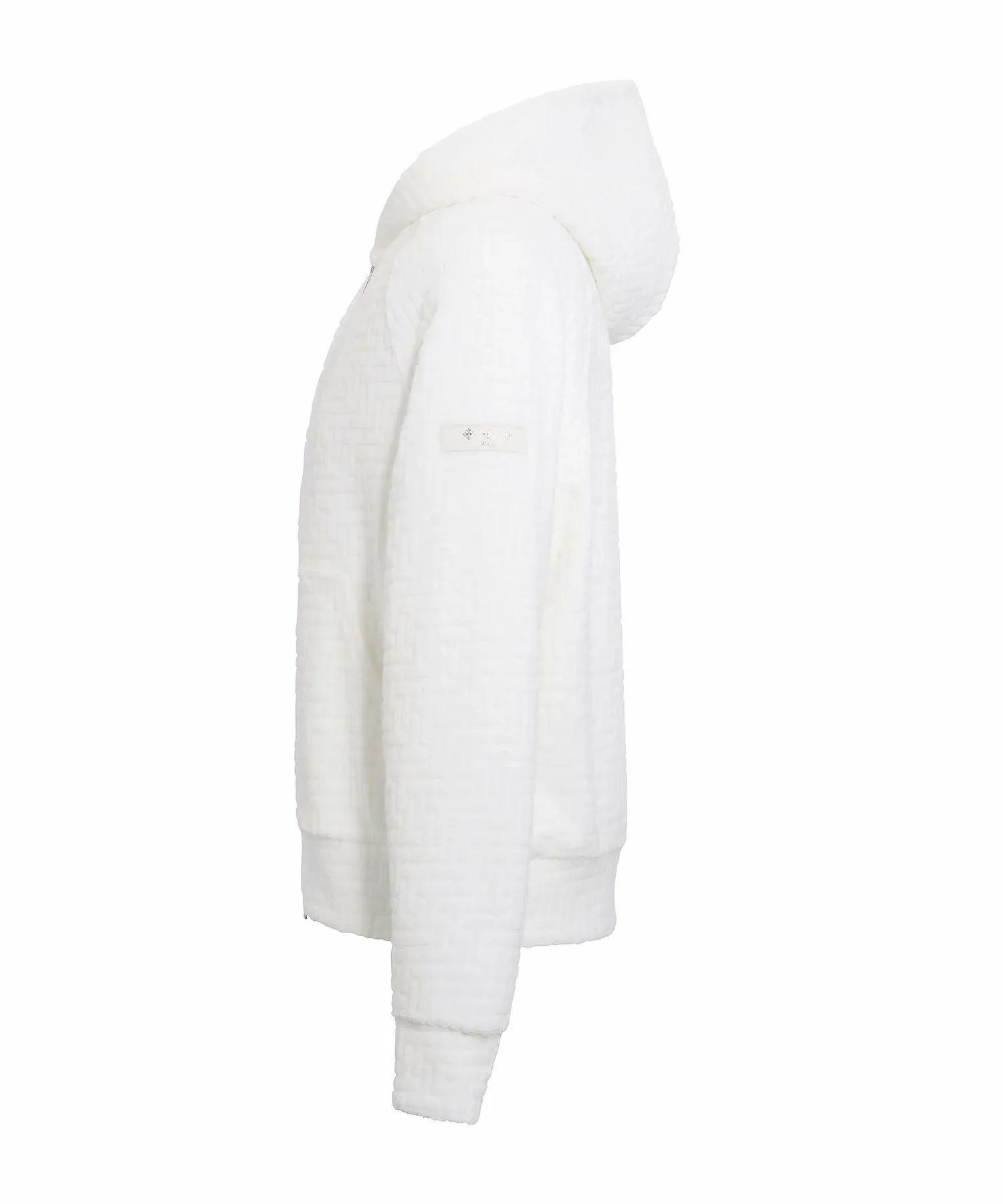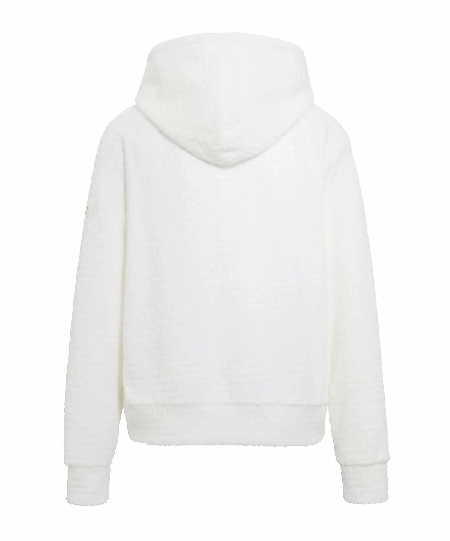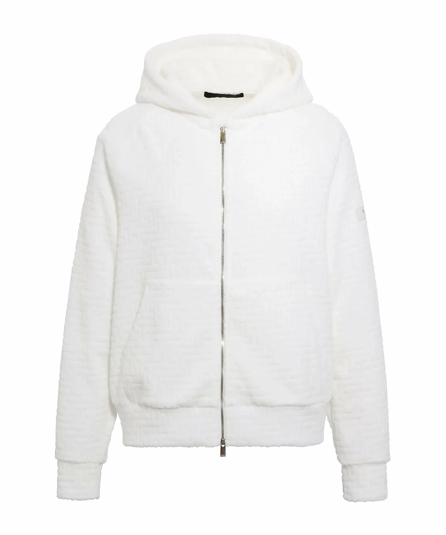 TATRAS BIANCA — повседневная толстовка с объемным жаккардовым монограммным узором. Подкладка выполнена из эластичного, влагоотводящего и быстросохнущего полиэстера для комфортной посадки. Рукава реглан обеспечивают свободу движений. Изящная металлическая молния добавляет нотку роскоши. Манжеты и нижний край контрастируют, создавая эффектный силуэт.