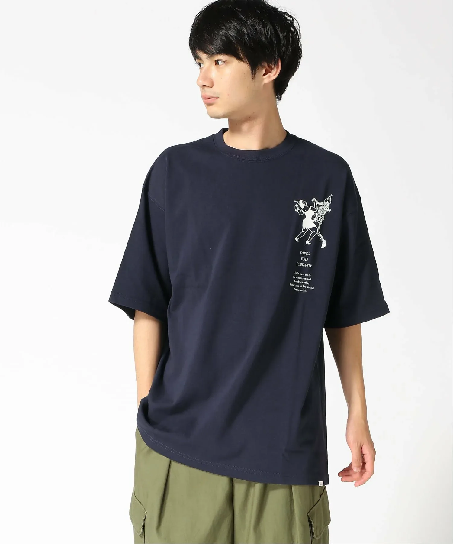 Эта футболка, сшитая по индивидуальному заказу, украшена графическим изображением и надписью на груди: «Танцуй для себя». На левом рукаве вышита нашивка. Каждый принт тщательно наносится методом шелкографии на фабрике в Японии. Силуэт широкий, с достаточной шириной в области груди и плеч, что обеспечивает комфортную посадку как для мужчин, так и для женщин.
