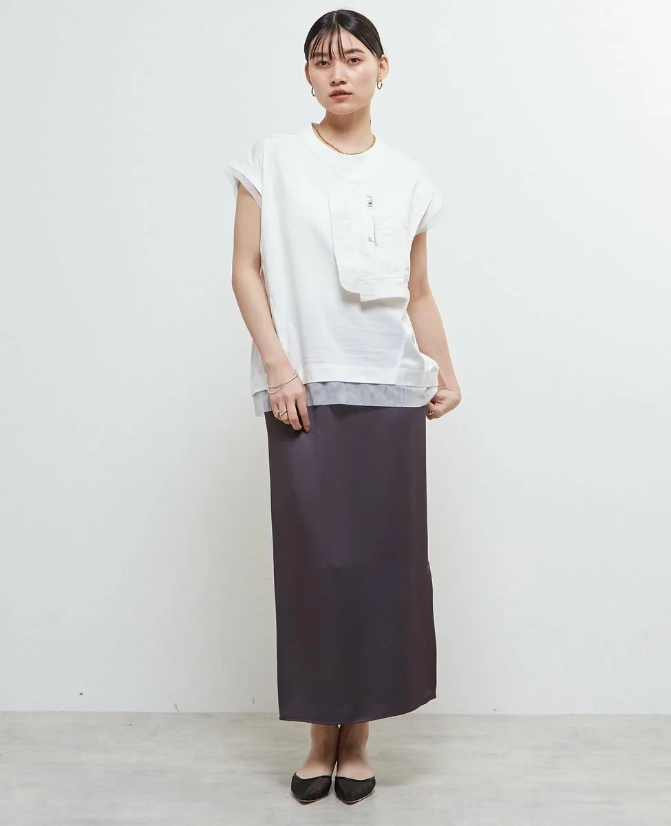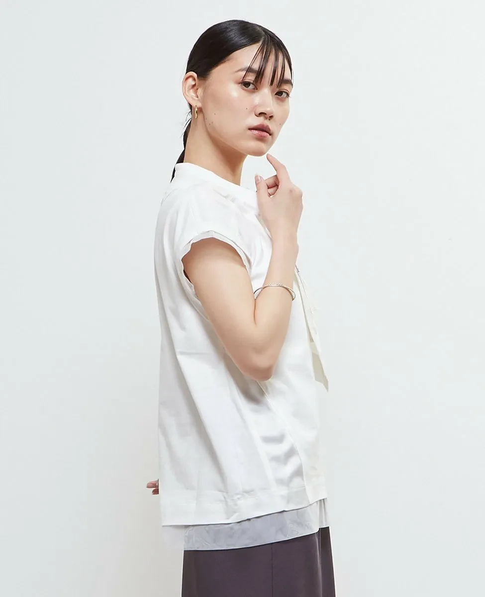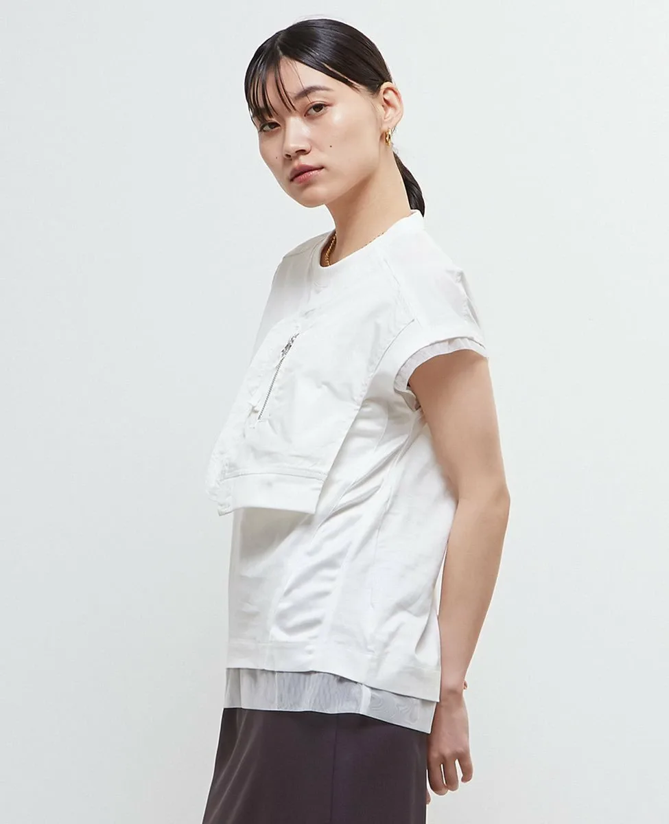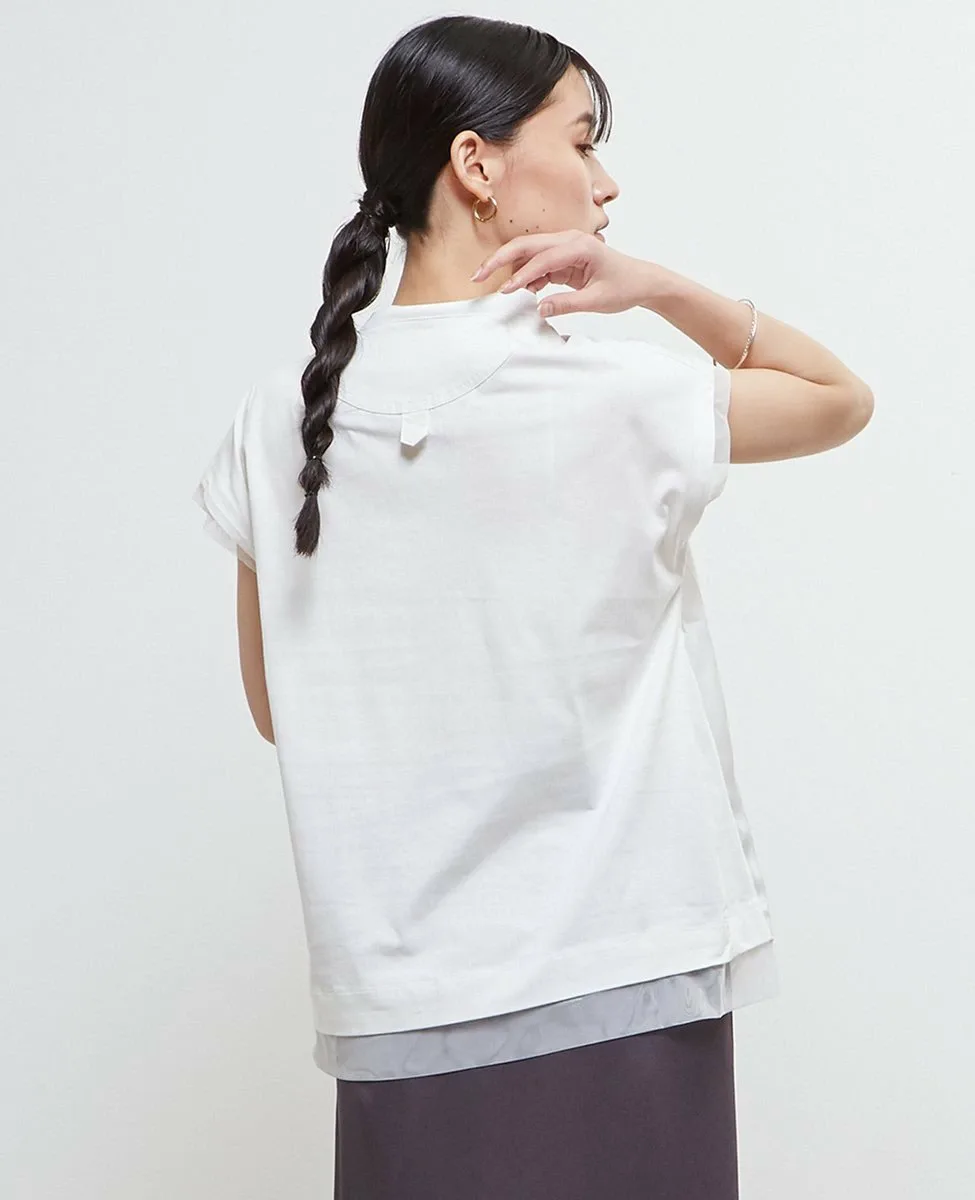 Футболка изготовлена из хлопкового трикотажа в сочетании с материалами различной текстуры, такими как тафта, атлас и тюль.