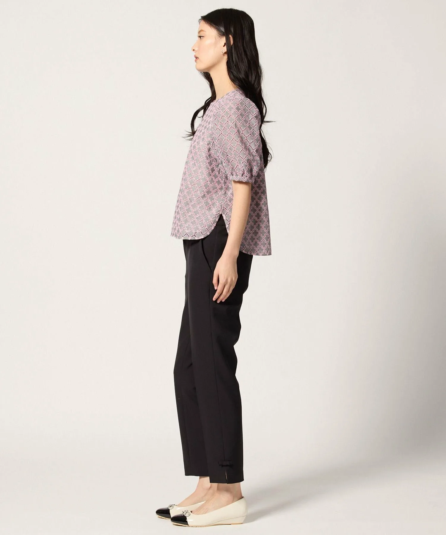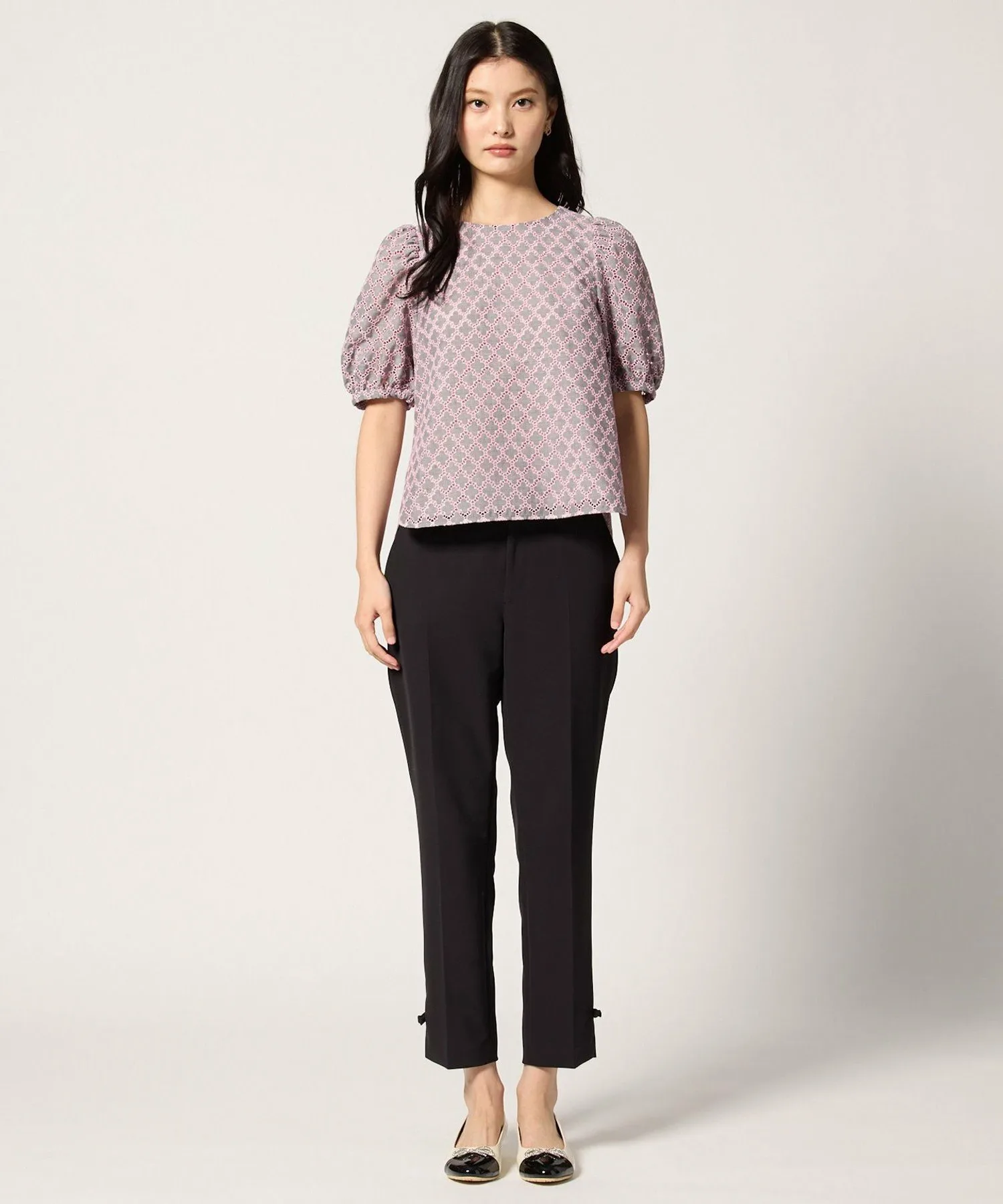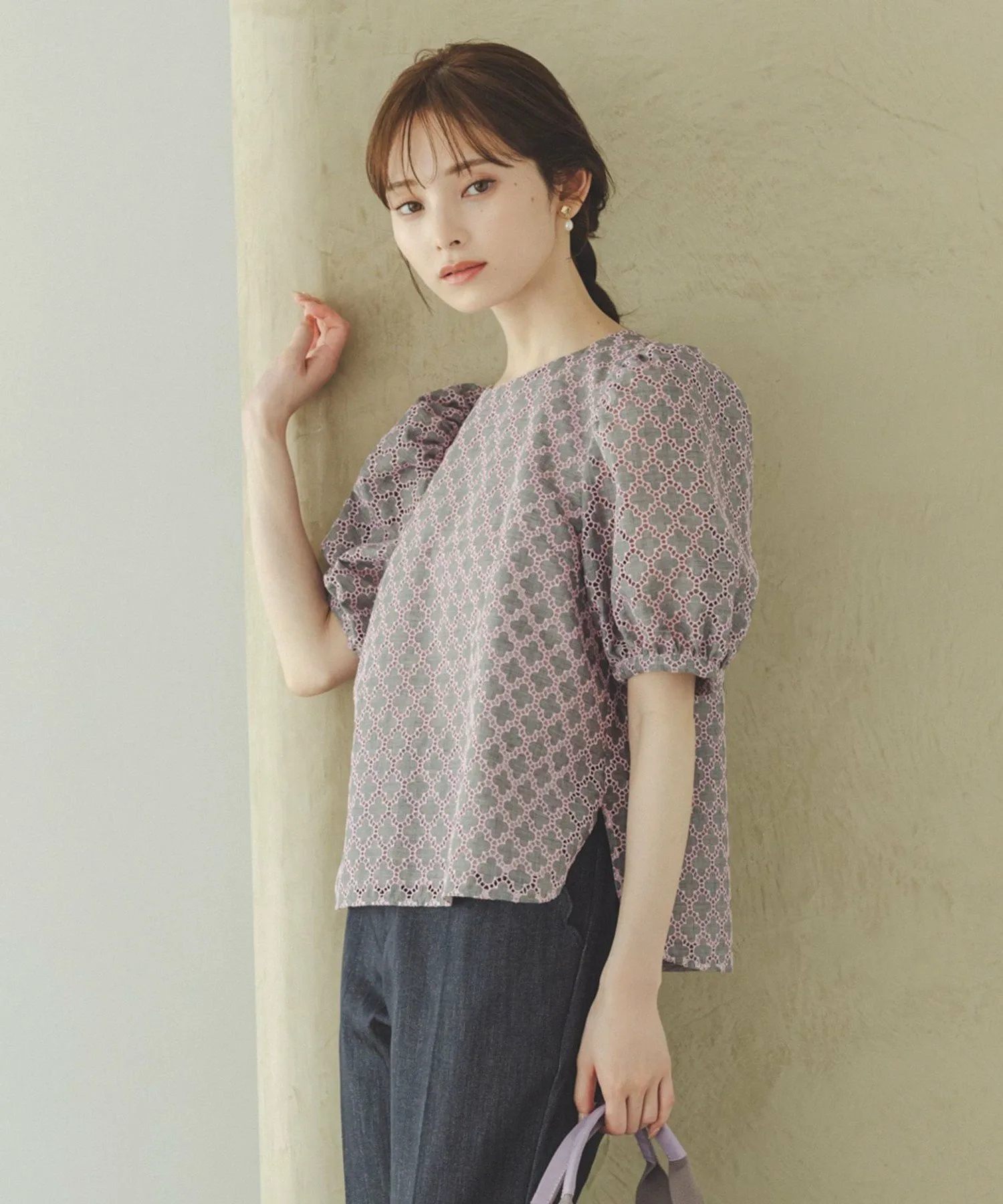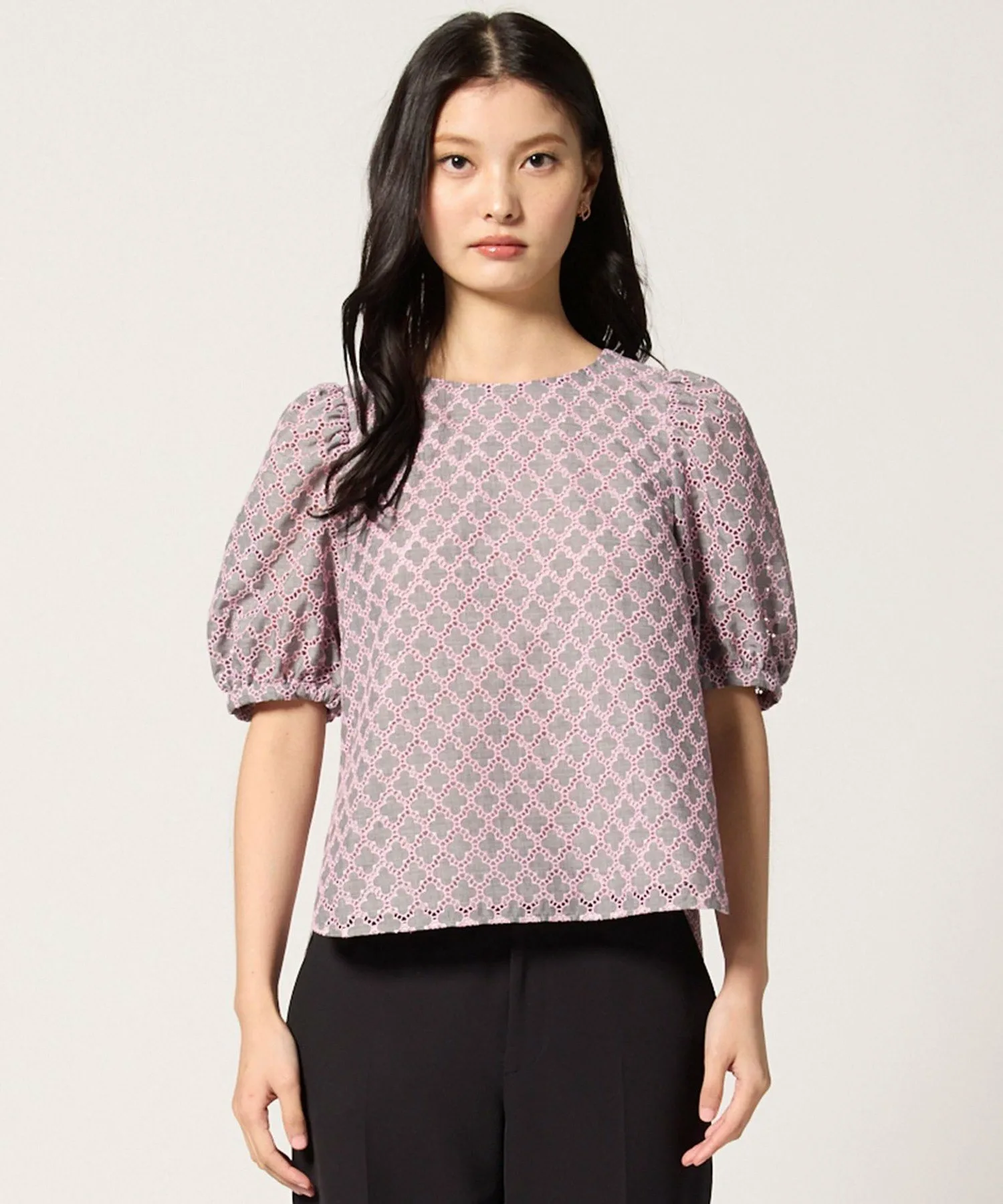 Эта блузка украшена вышивкой в виде клевера от TOCCA. Изящная вышивка на легкой ткани создает трехмерную текстуру, что придает изделию роскошный и элегантный вид. Розовая вышивка на сером фоне придает ей женственный, достойный вид, не делая ее слишком серьезной. Компактный размер гарантирует, что объемные рукава не будут визуально расширять плечи, создавая женственное впечатление. Размер позволяет легко сочетать ее с брюками или юбками. Также доступно платье из того же материала.