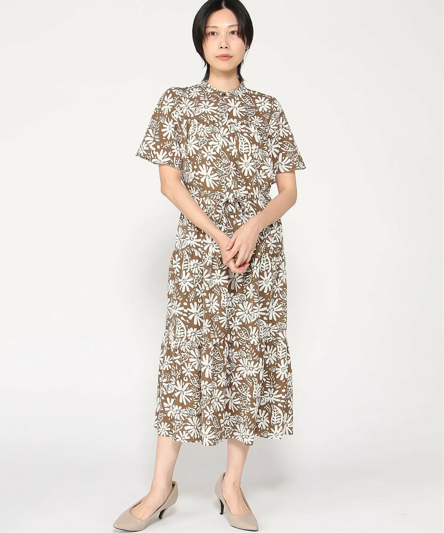 Платье со стоячим воротником, украшенное цветочными мотивами.