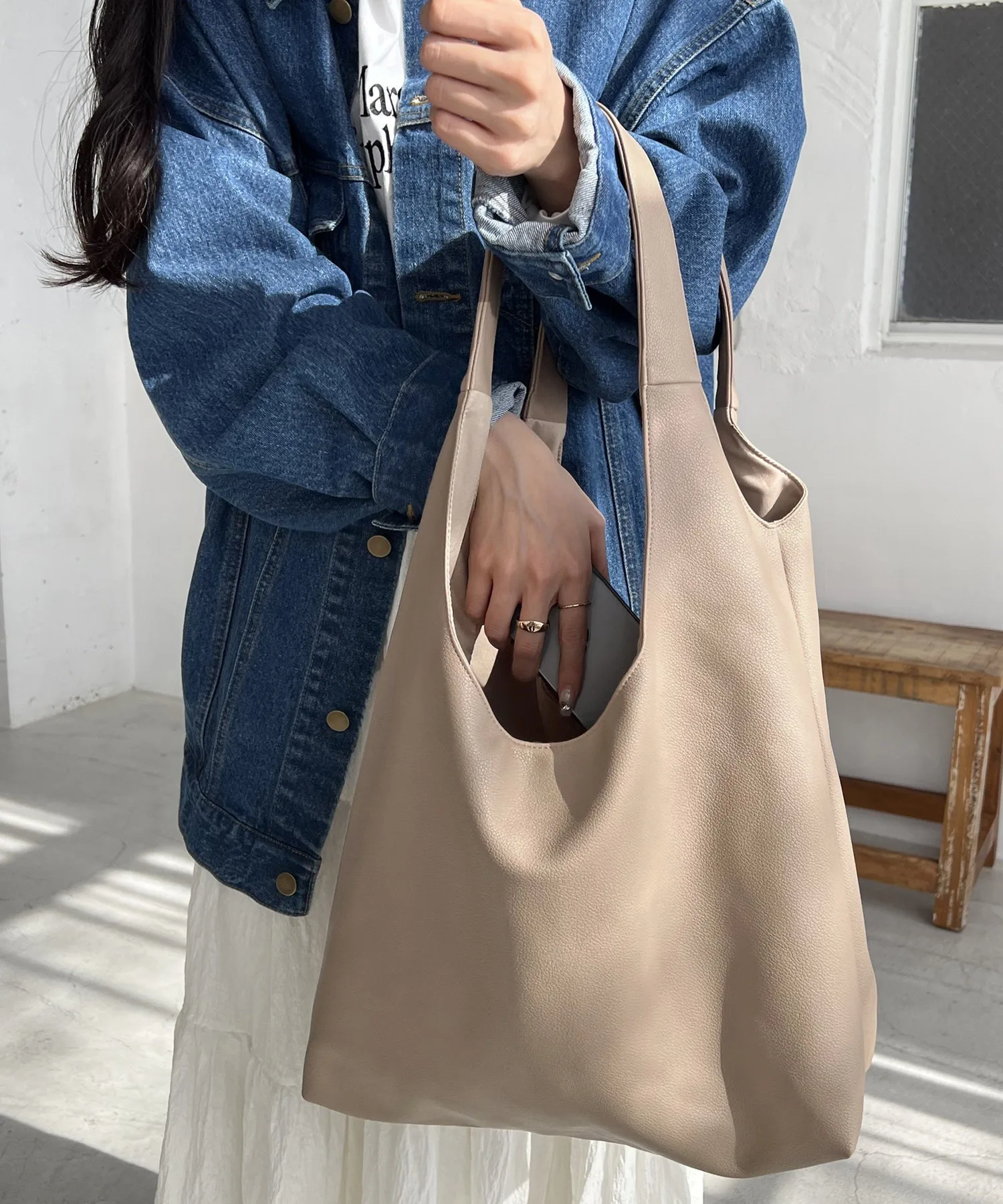 Сумка-тоут изготовлена из мягкого, приятного на ощупь материала. Её привлекательность заключается в большом, вместительном объёме и простом, вневременном дизайне. Закруглённое отверстие позволяет легко просунуть руки, добавляя мягкий, женственный штрих♪ Благодаря внутренним карманам с обеих сторон, это очень функциональный предмет. Доступен в широком ассортименте цветов, от базовых моделей до акцентных цветов для вашего наряда.