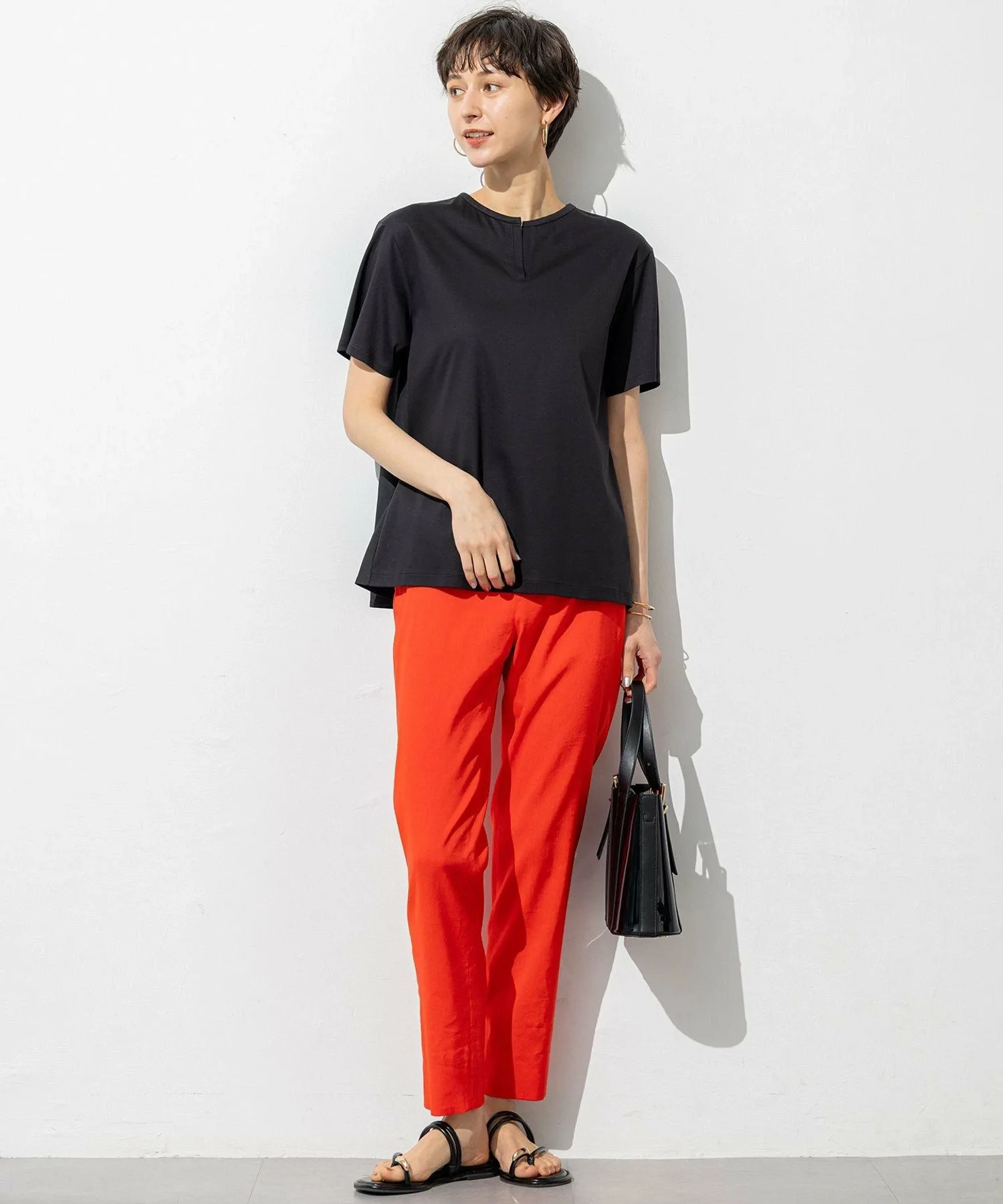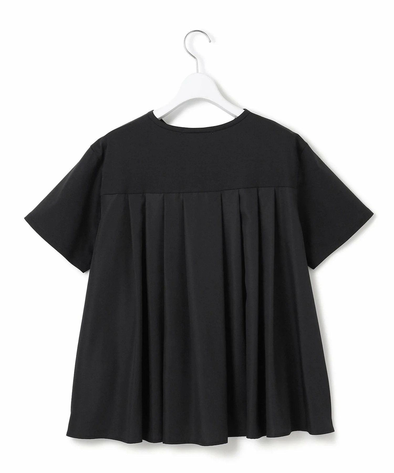 Передняя часть представляет собой простую футболку с коротким рукавом, скроенную и сшитую со складками, которые расходятся из-под кокетки на спине. Сочетание тканых материалов создает стильный и эффектный фасон спинки. Боковые швы слегка вывернуты вперед, создавая пространство в области талии и ненавязчиво скрывая проблемные зоны. Несмотря на простой дизайн, выразительный силуэт добавляет стильный штрих к любому образу. Доступна в четырех цветах: освежающий белый (#001), стройнящий черный (#005), привлекательный темно-абрикосовый (#014) и приглушенный темно-коричневый (#035).