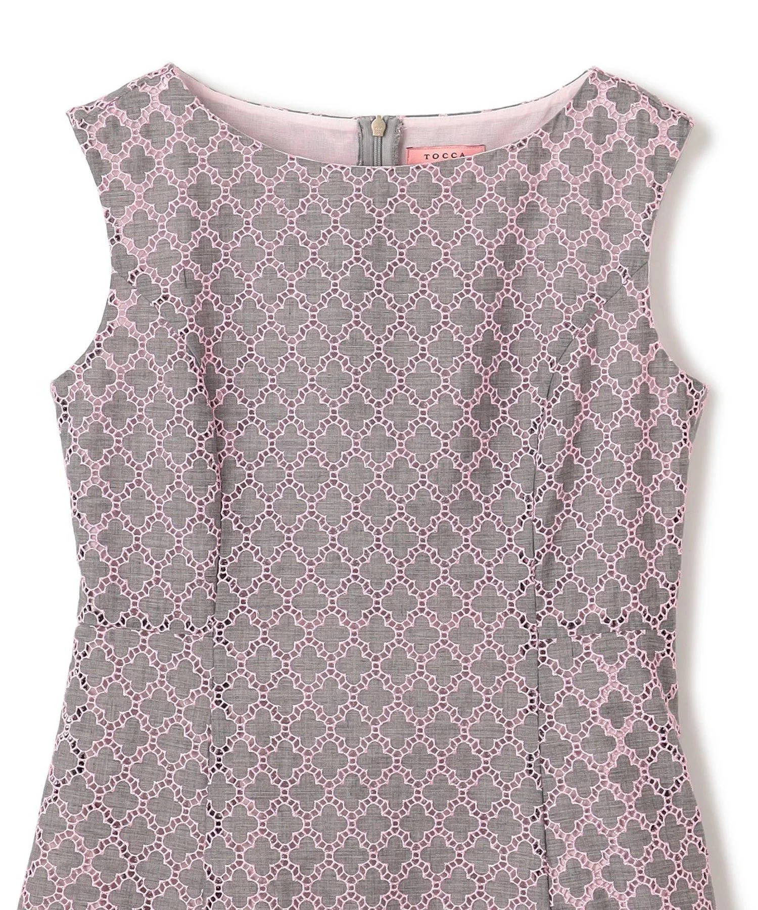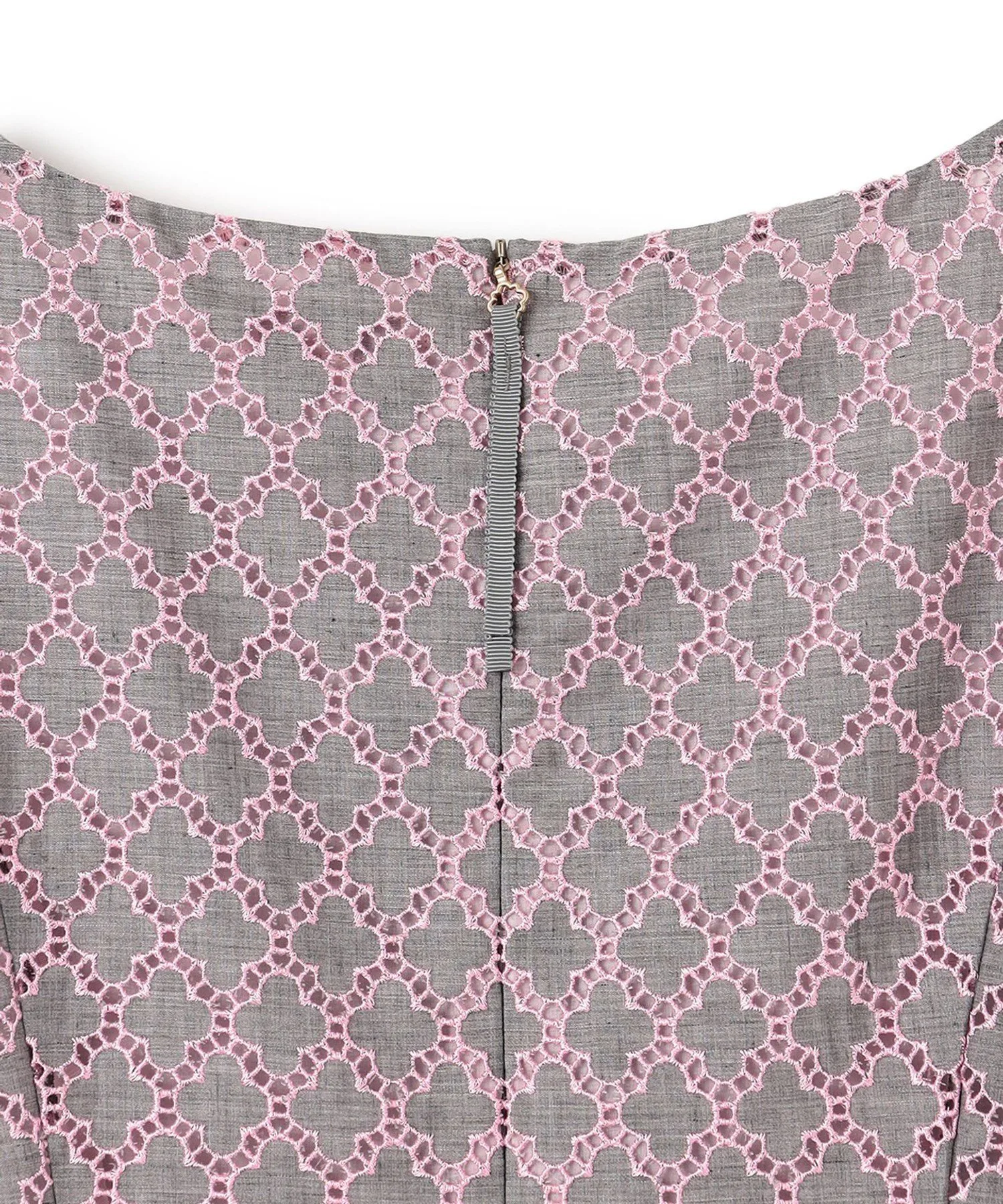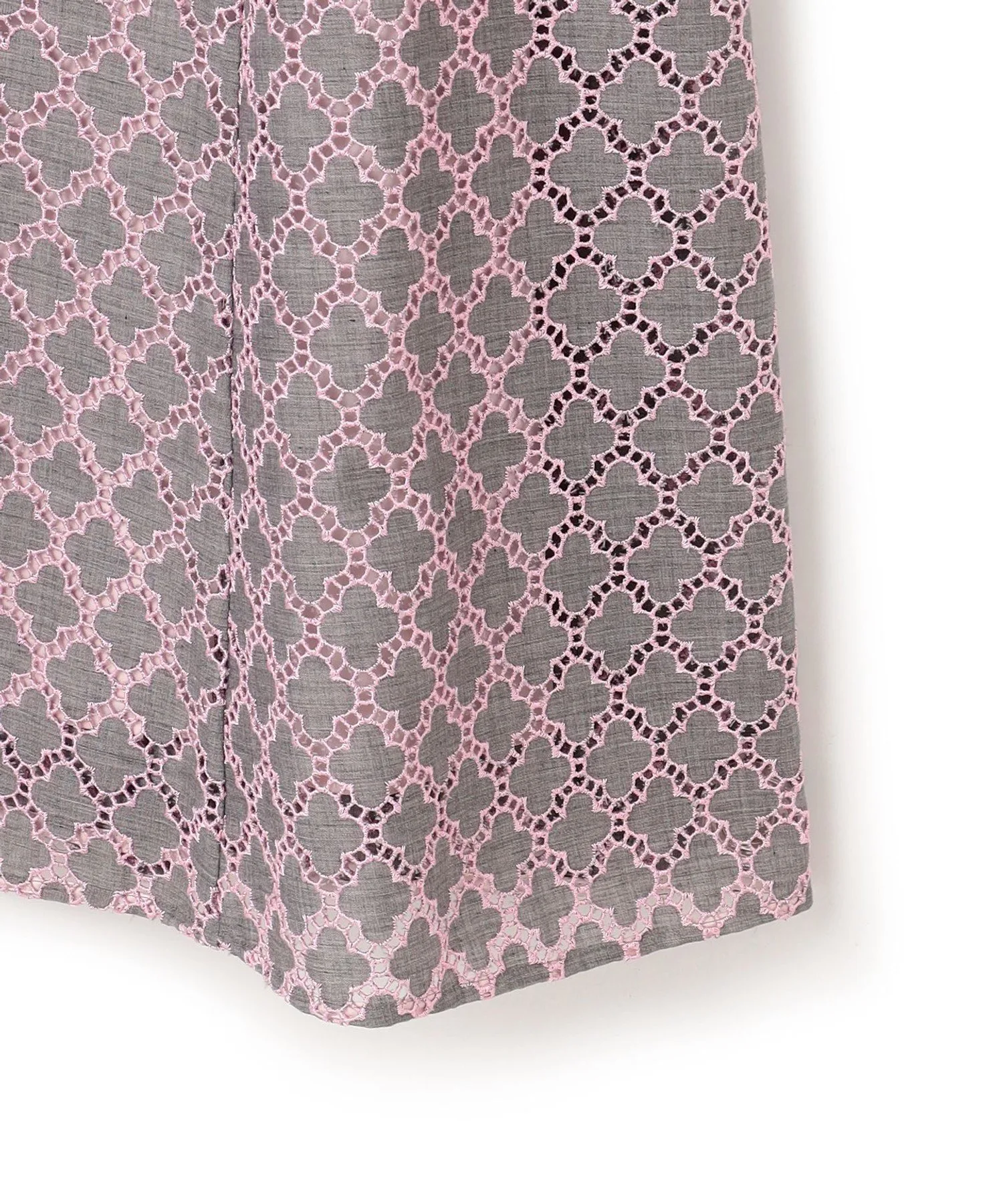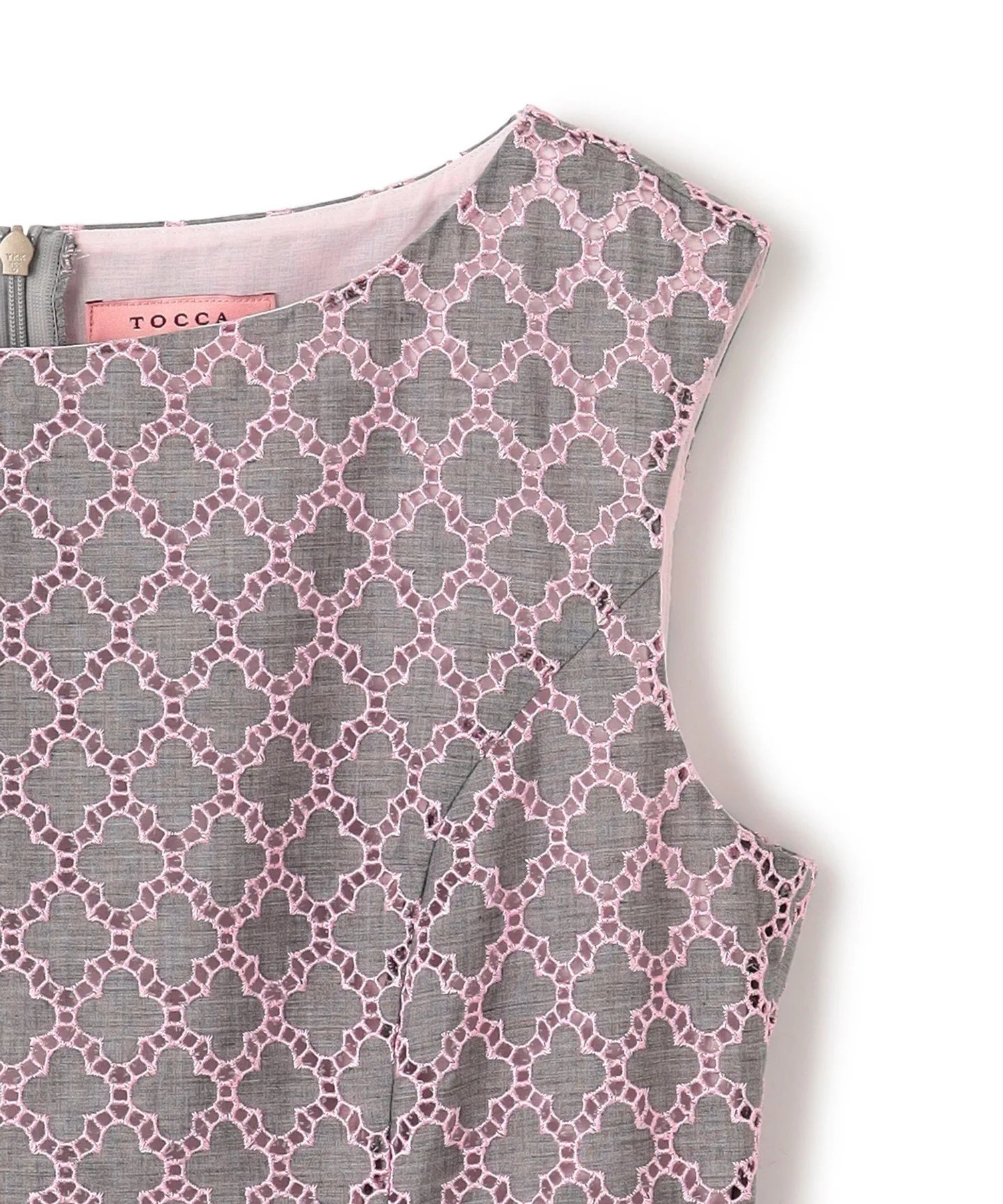 Это простое и элегантное платье украшено вышивкой в виде клевера TOCCA. Изящная вышивка на легкой ткани создает трехмерную текстуру, в результате чего получается роскошный и элегантный дизайн. Розовая вышивка на сером фоне не выглядит слишком серьезной и выражает женское достоинство. Также доступна блузка из того же материала.
