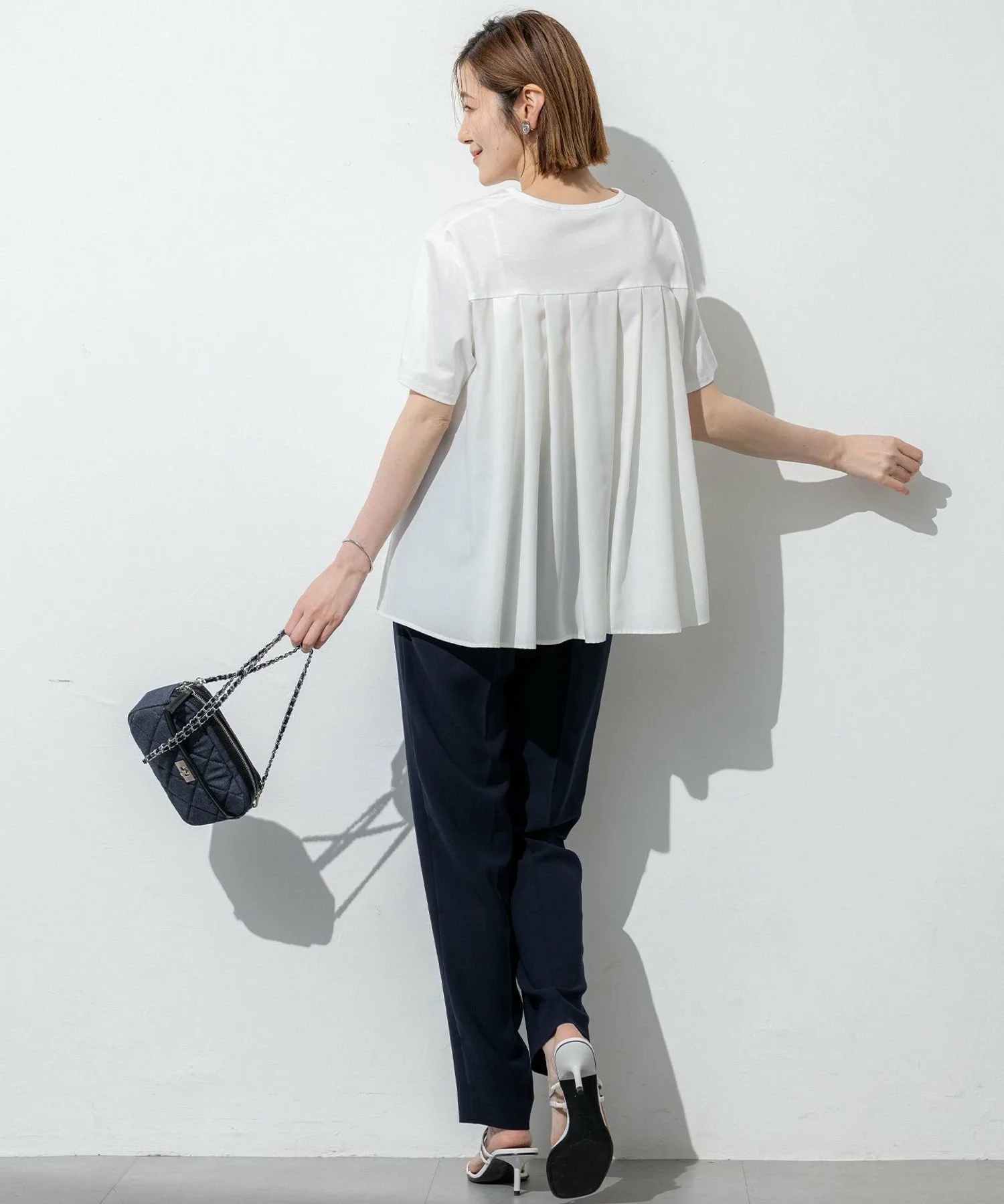 Передняя часть представляет собой простую футболку с коротким рукавом, скроенную и сшитую со складками, которые расходятся из-под кокетки на спине. Сочетание тканых материалов создает стильный и эффектный фасон спинки. Боковые швы слегка вывернуты вперед, создавая пространство в области талии и ненавязчиво скрывая проблемные зоны. Несмотря на простой дизайн, выразительный силуэт добавляет стильный штрих к любому образу. Доступна в четырех цветах: освежающий белый (#001), стройнящий черный (#005), привлекательный темно-абрикосовый (#014) и приглушенный темно-коричневый (#035).