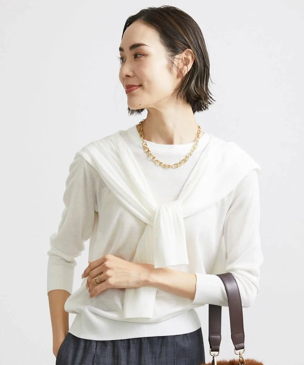 Этот ансамбль состоит из кардигана с широкими ребрами, длинными рукавами и V-образным вырезом, и трикотажного пуловера с рукавами три четверти. Кардиган имеет длинную длину, которая хорошо сочетается с брюками. Внутренний трикотаж имеет рукава три четверти, что позволяет носить его отдельно.