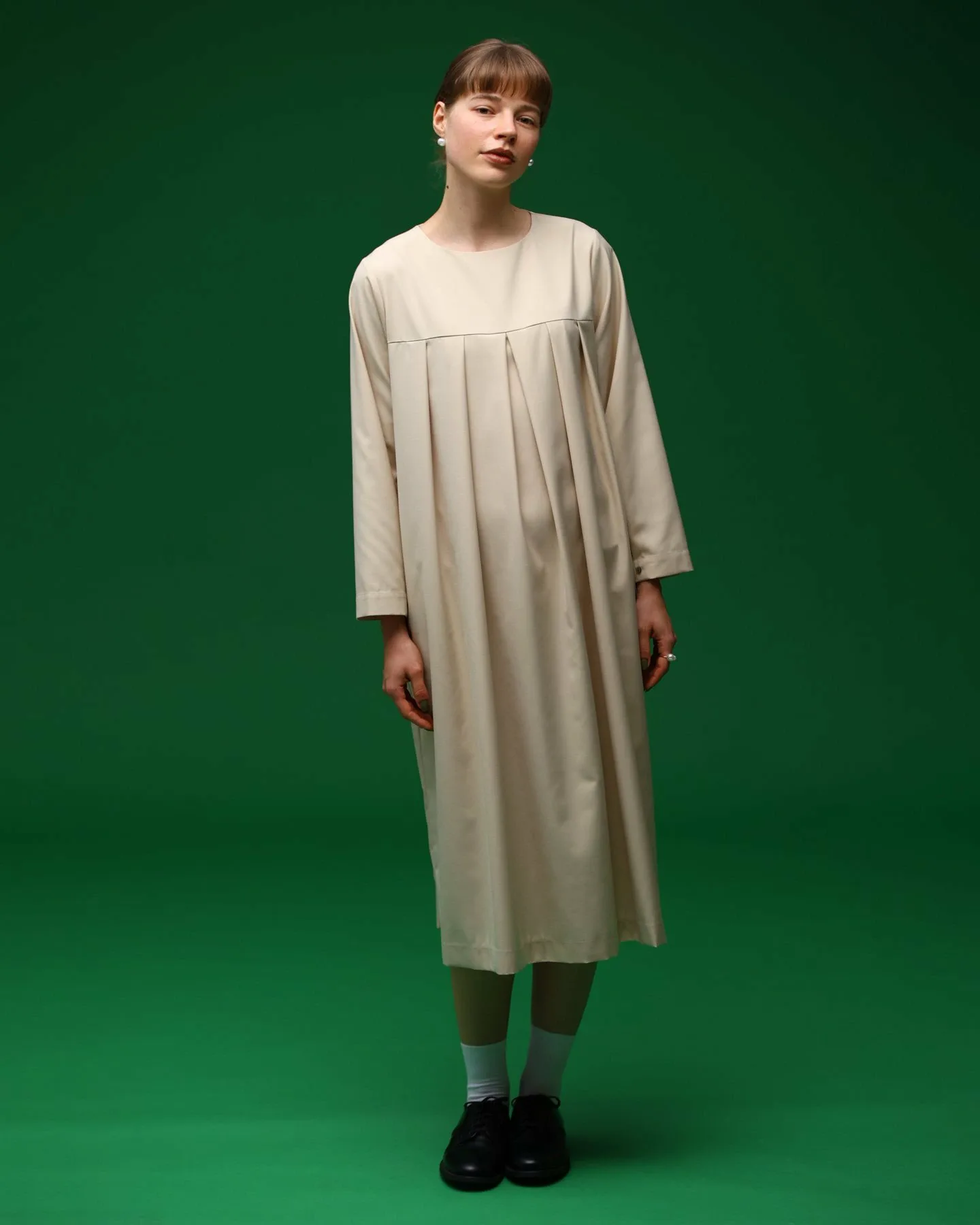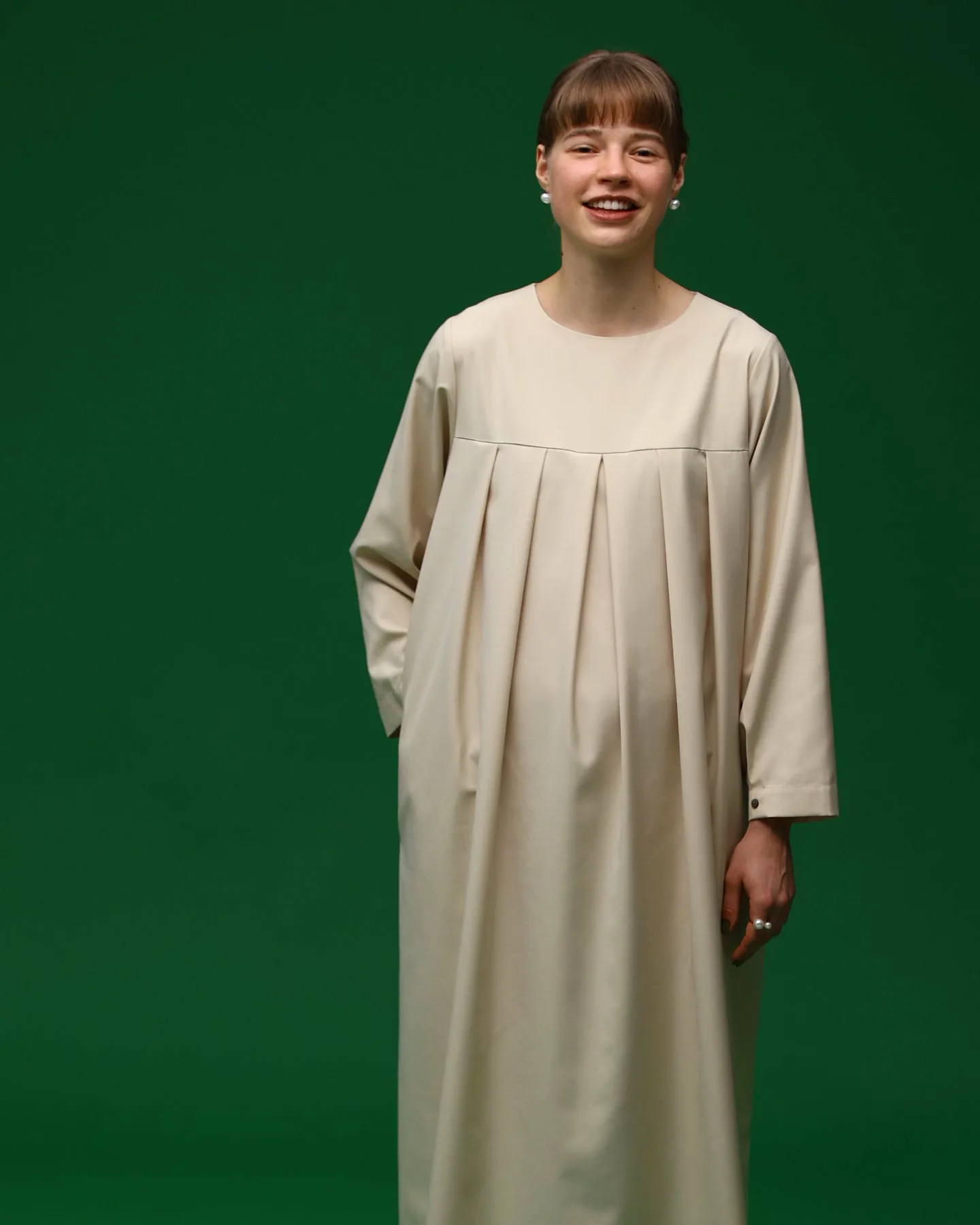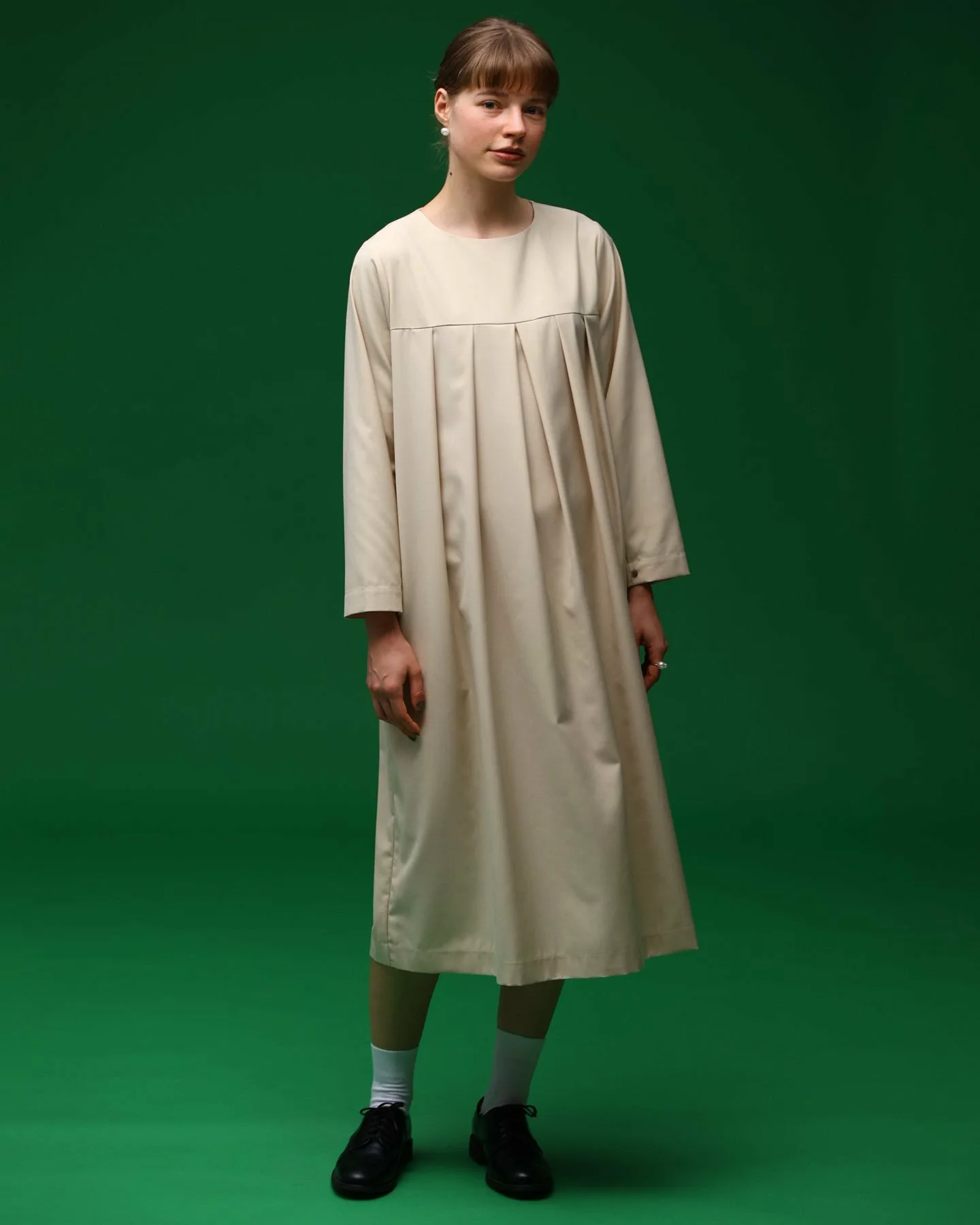Изюминкой являются складки спереди и пуговицы на манжетах.
