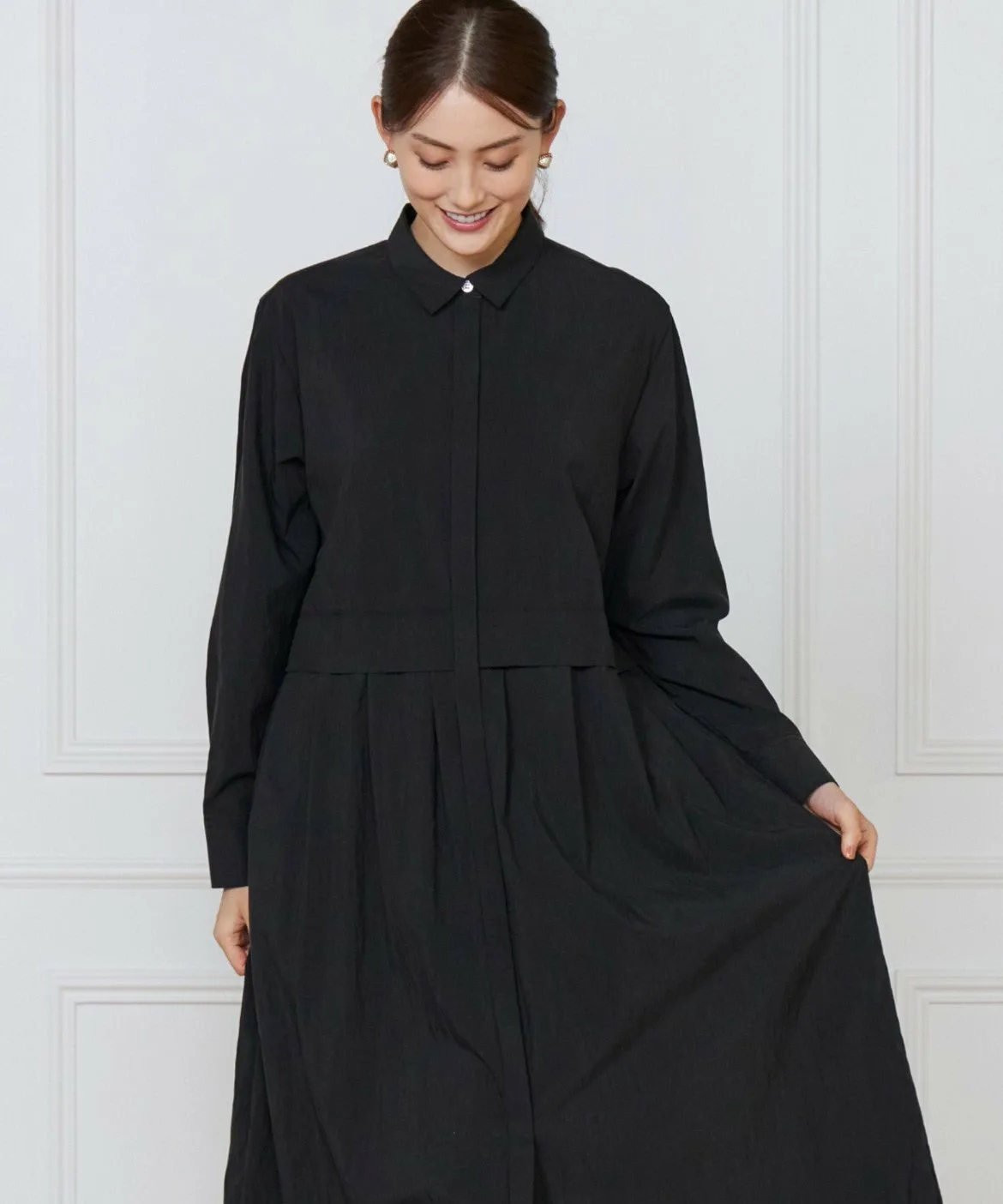 Главная особенность — многоярусный дизайн, напоминающий сочетание рубашки и юбки. Изящный воротник и застежка-молния спереди добавляют нотку благородства. Складки и сборки на талии призваны предотвратить чрезмерное распускание ткани, обеспечивая аккуратный внешний вид. Комфорт также учтен: прорезные карманы и легкая, немнущаяся ткань обеспечивают комфортную посадку. Вы также можете носить ее как жакет, расстегнув передние пуговицы и сочетая с брюками.