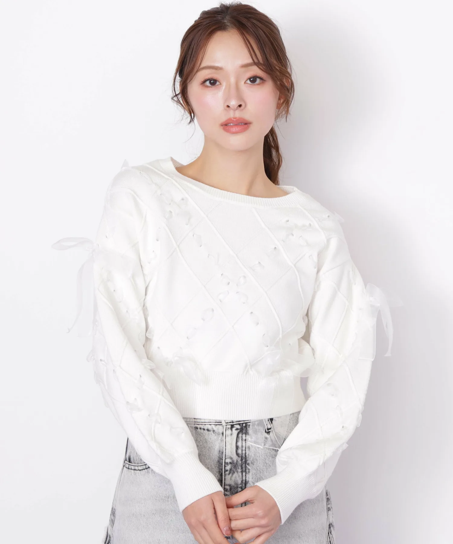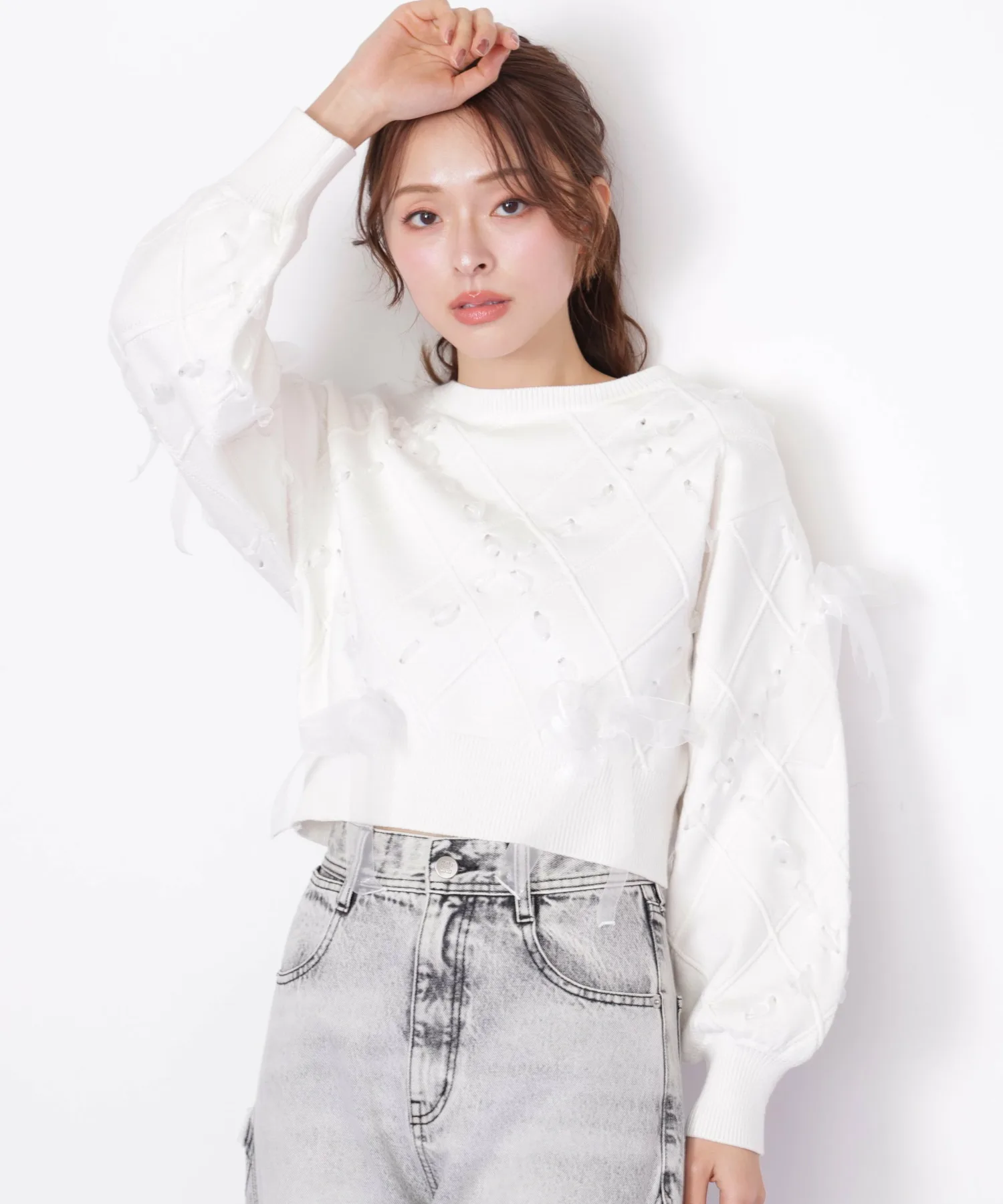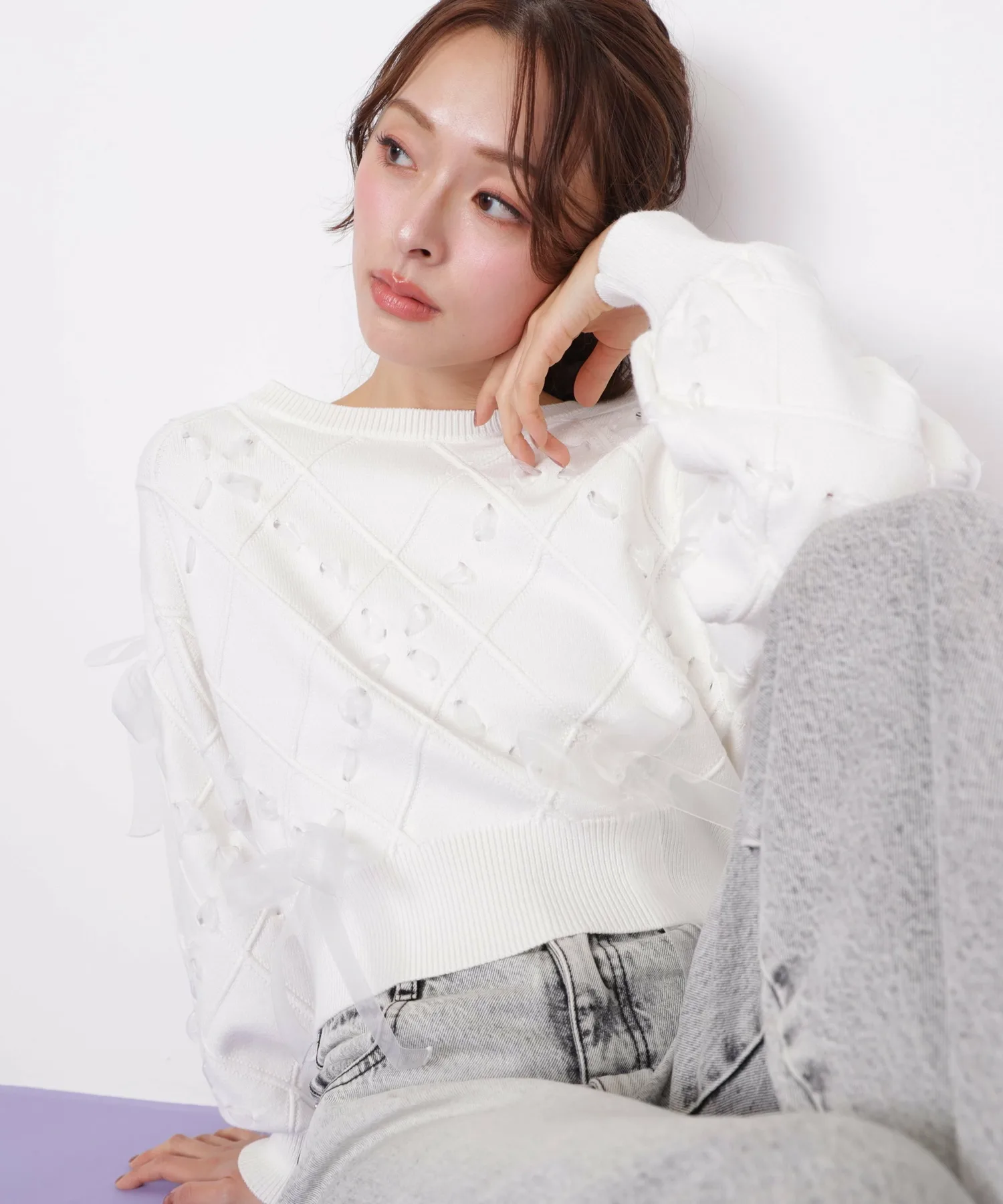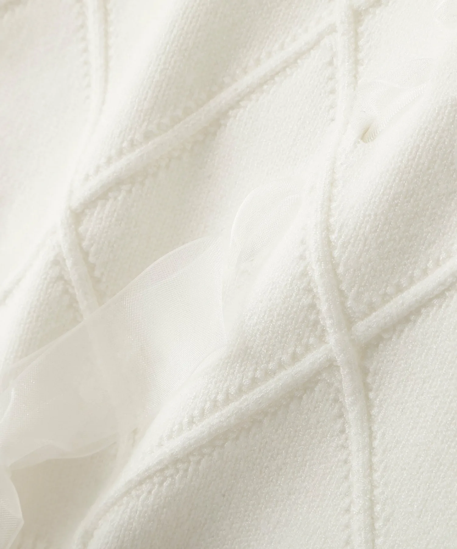 Этот трикотаж украшен ромбовидным узором из полупрозрачных лент, что придает ему легкость и элегантность. Полупрозрачная лента добавляет женственности и создает очаровательный образ. Он может стать самостоятельным акцентом, а также его можно сочетать с юбкой для создания милого и взрослого образа. *Цвет может выглядеть по-разному в зависимости от условий освещения во время фотосъемки.