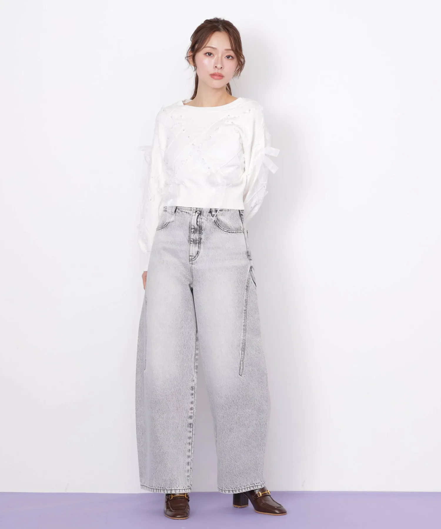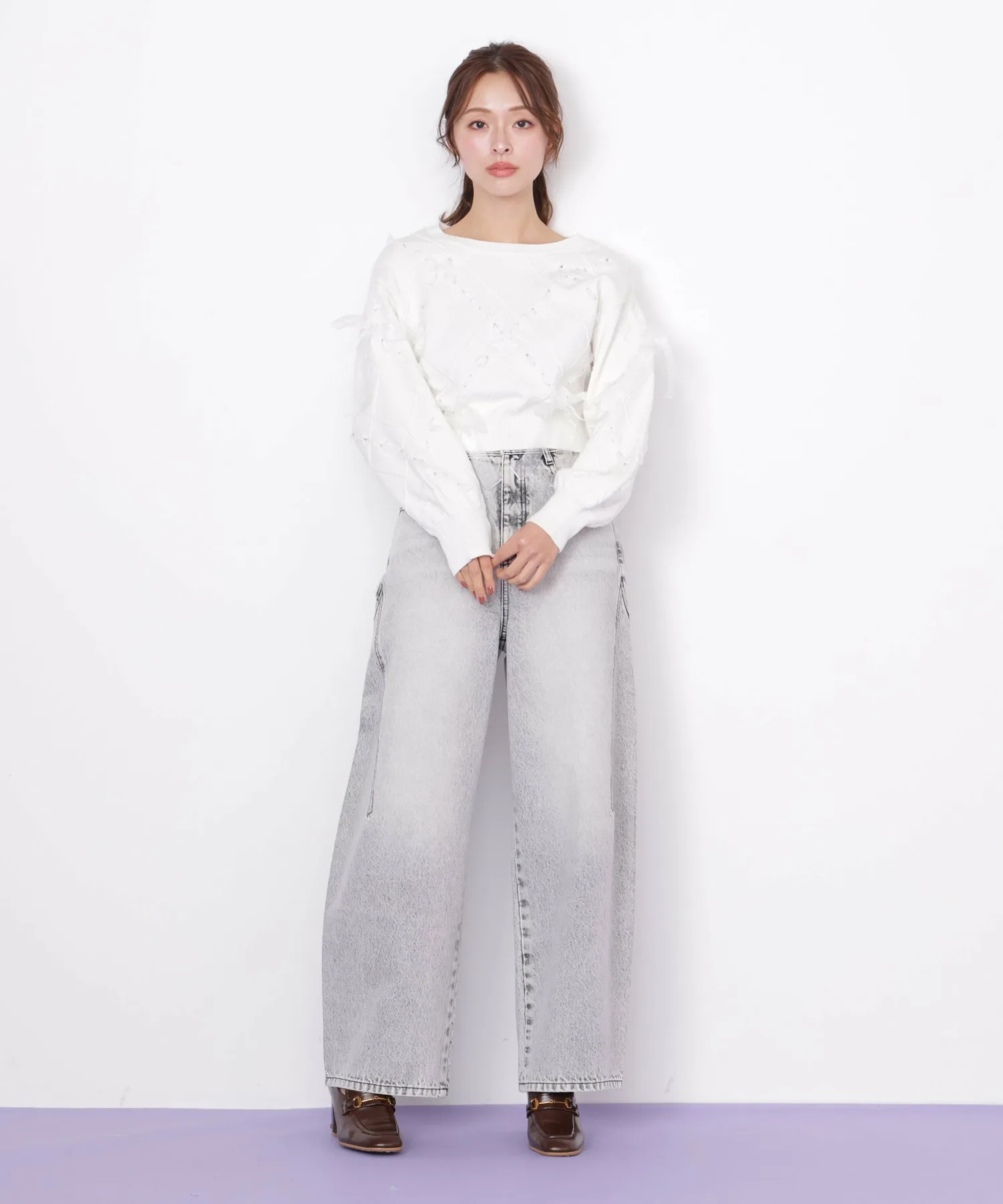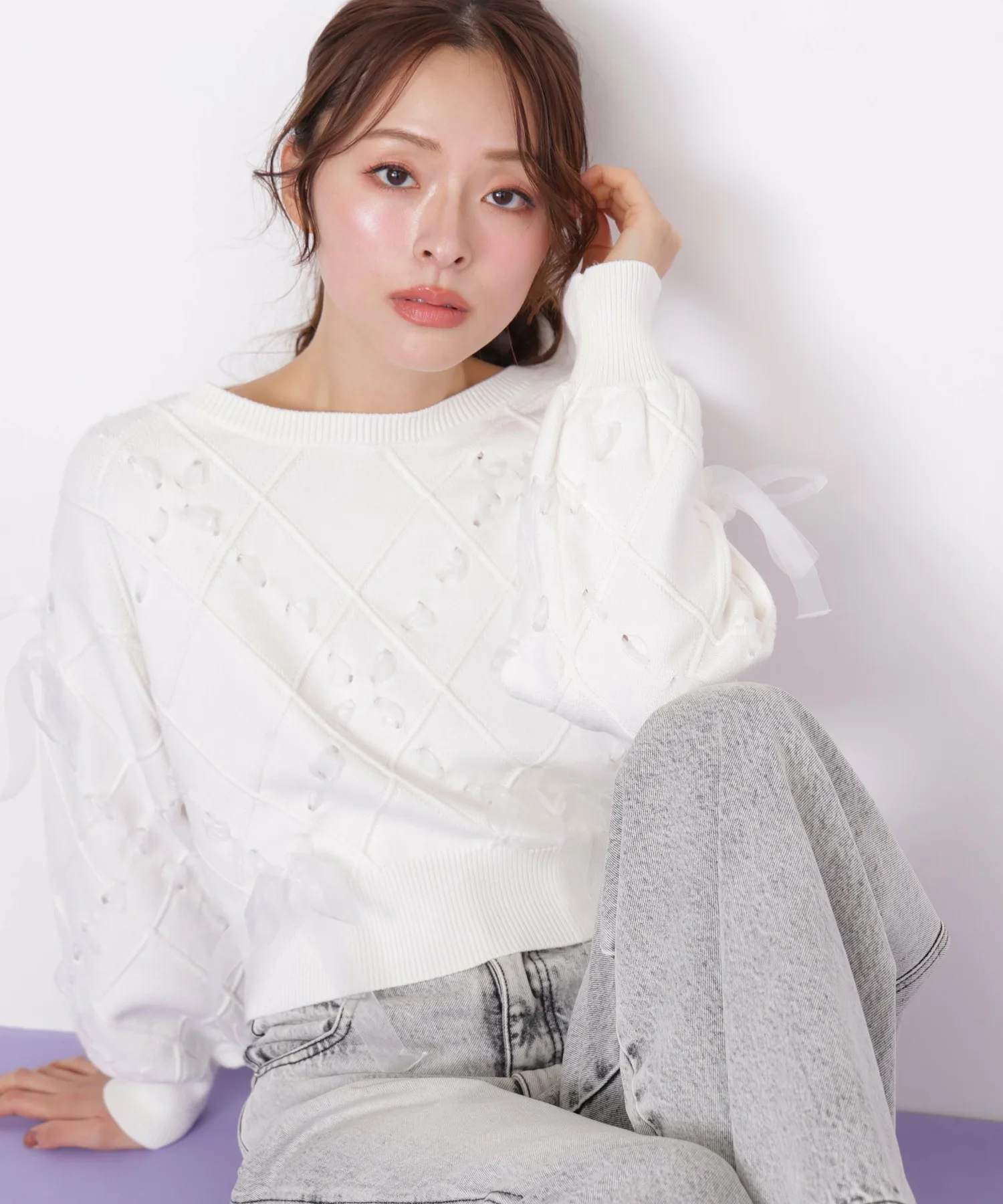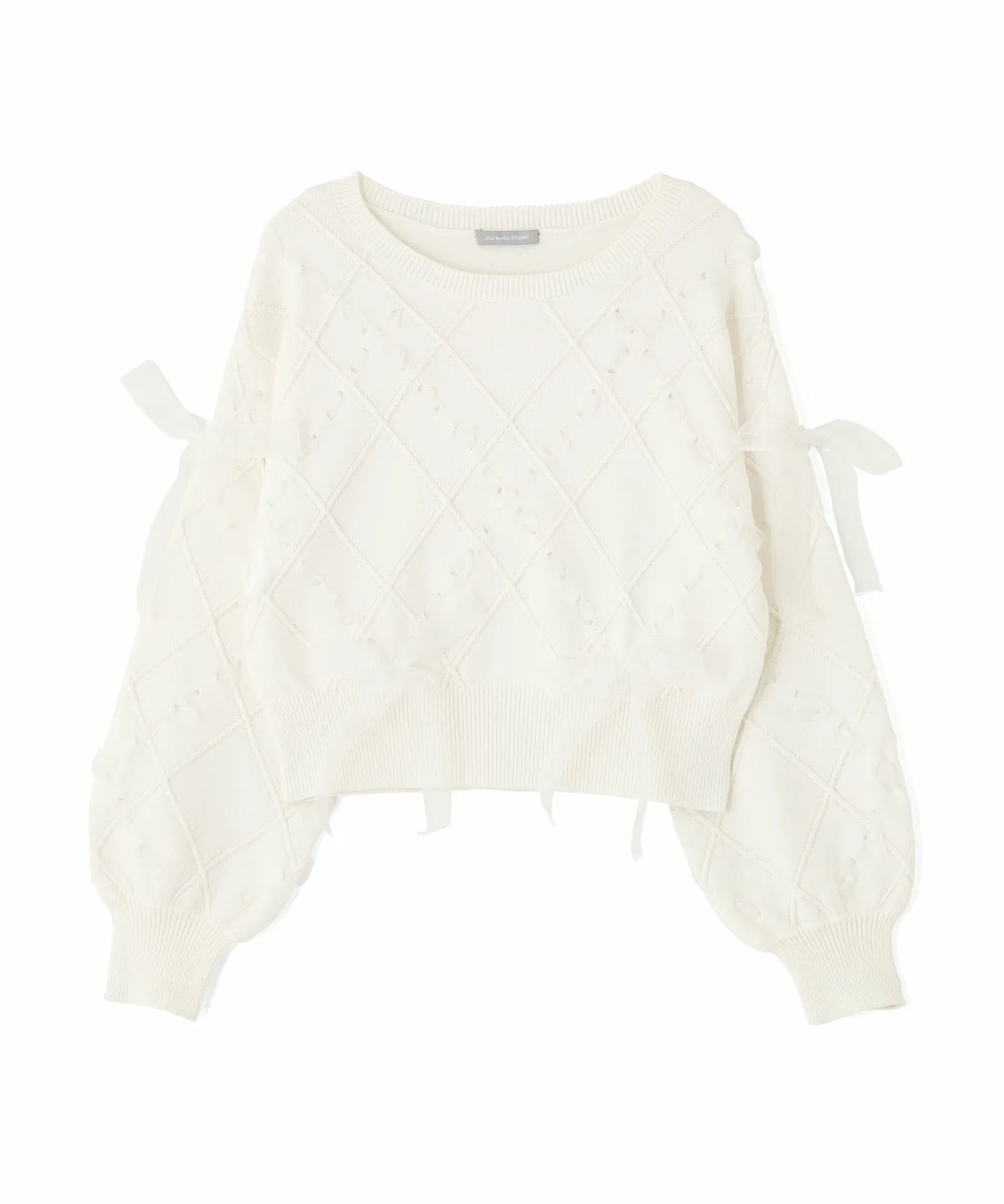 Этот трикотаж украшен ромбовидным узором из полупрозрачных лент, что придает ему легкость и элегантность. Полупрозрачная лента добавляет женственности и создает очаровательный образ. Он может стать самостоятельным акцентом, а также его можно сочетать с юбкой для создания милого и взрослого образа. *Цвет может выглядеть по-разному в зависимости от условий освещения во время фотосъемки.